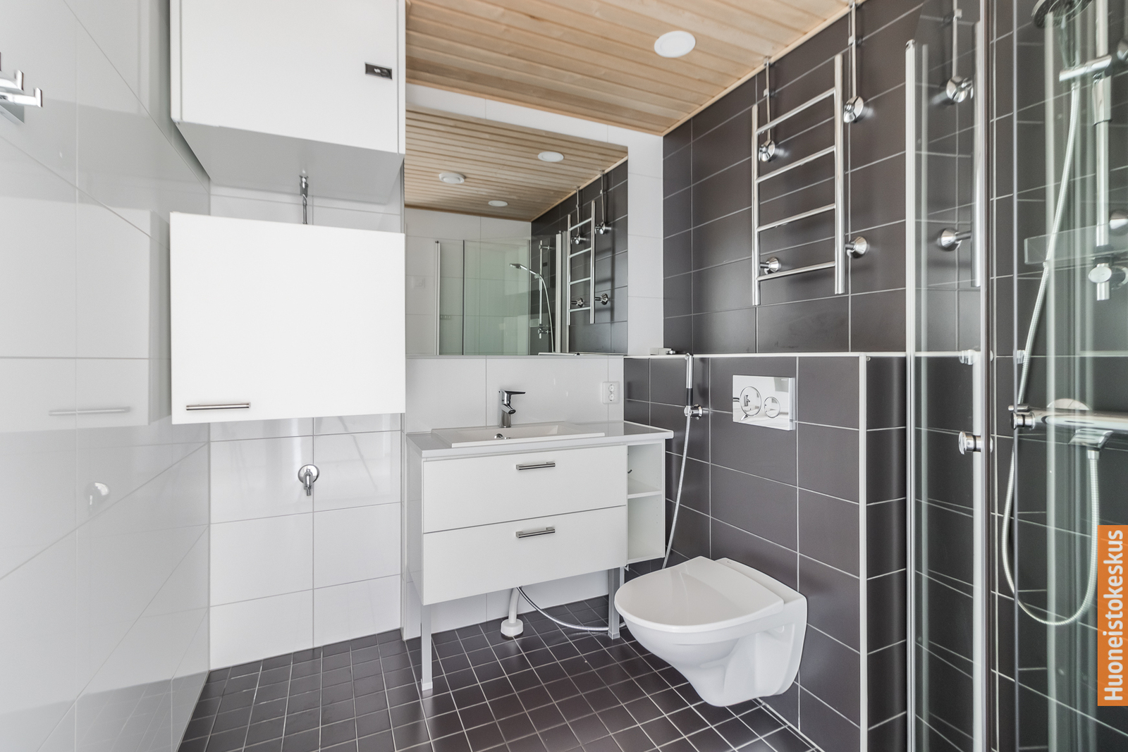 Lattialämmitys, peili, suihkuseinä, suihku, wc-istuin, allaskaappi, pesukoneliitäntä ja kiinteät valaisimet, seinät (kaakeli), lattiat (laatta) |