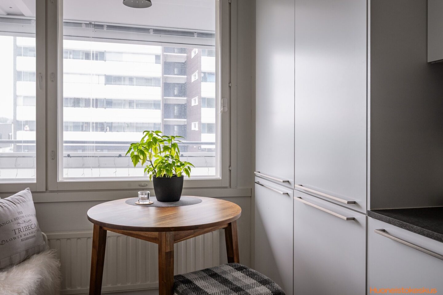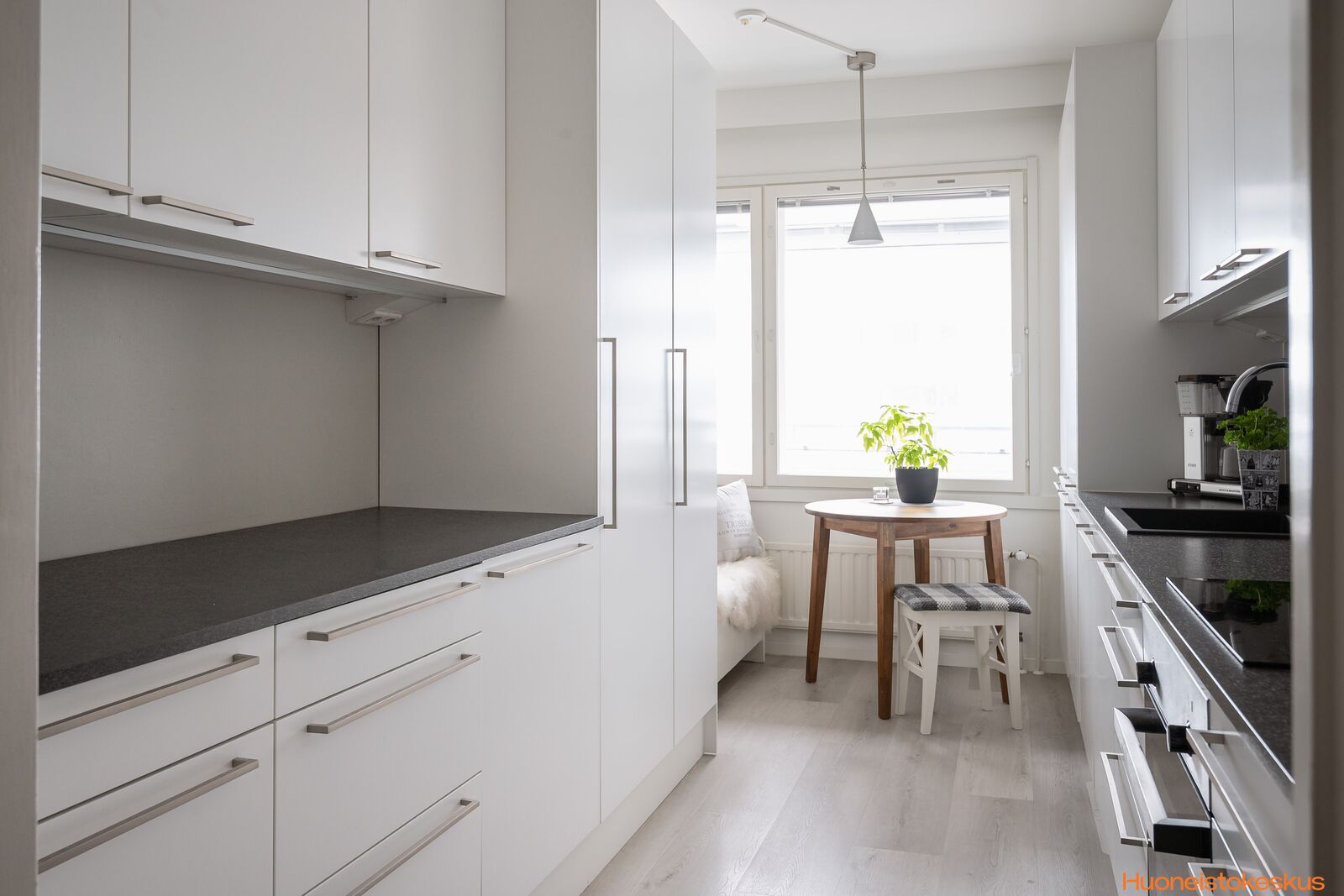 Tässä kodissa on otettu kaikki arjen pienetkin toiminnot huomioon ja säilytystilat on suunniteltu tarkasti sen mukaan. Keittiö on remontoitu erittäin laadukkaasti, runsaasti kaappitilaa ja laskutilaa. Keittiöön mahtuu hienosti pieni ruokapöytä arkikäyttöön, josta saa myös ihailla kaunista Aurajoenrannan puistonäkymää esimerkiksi aamupalaa nauttiessa.