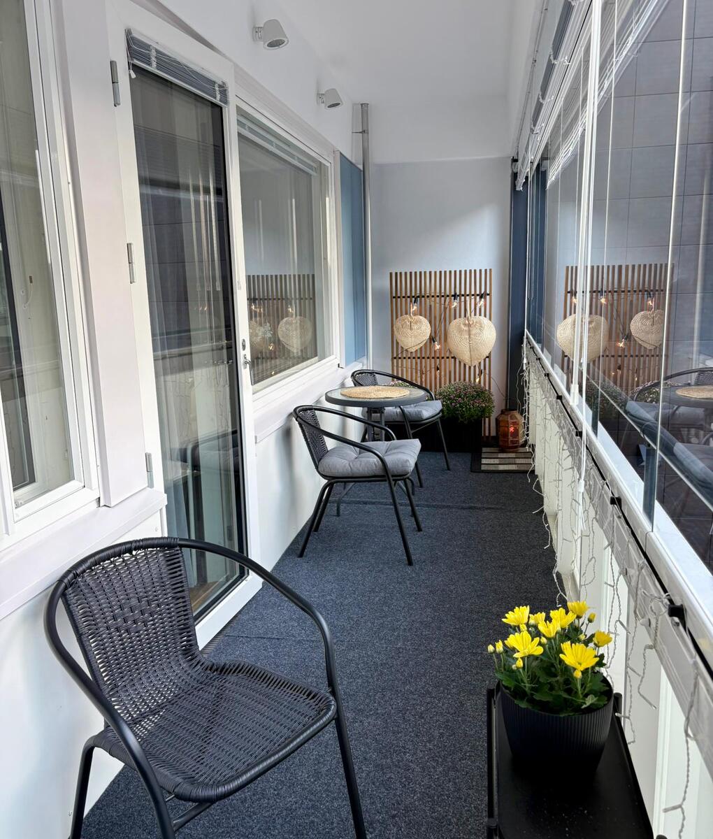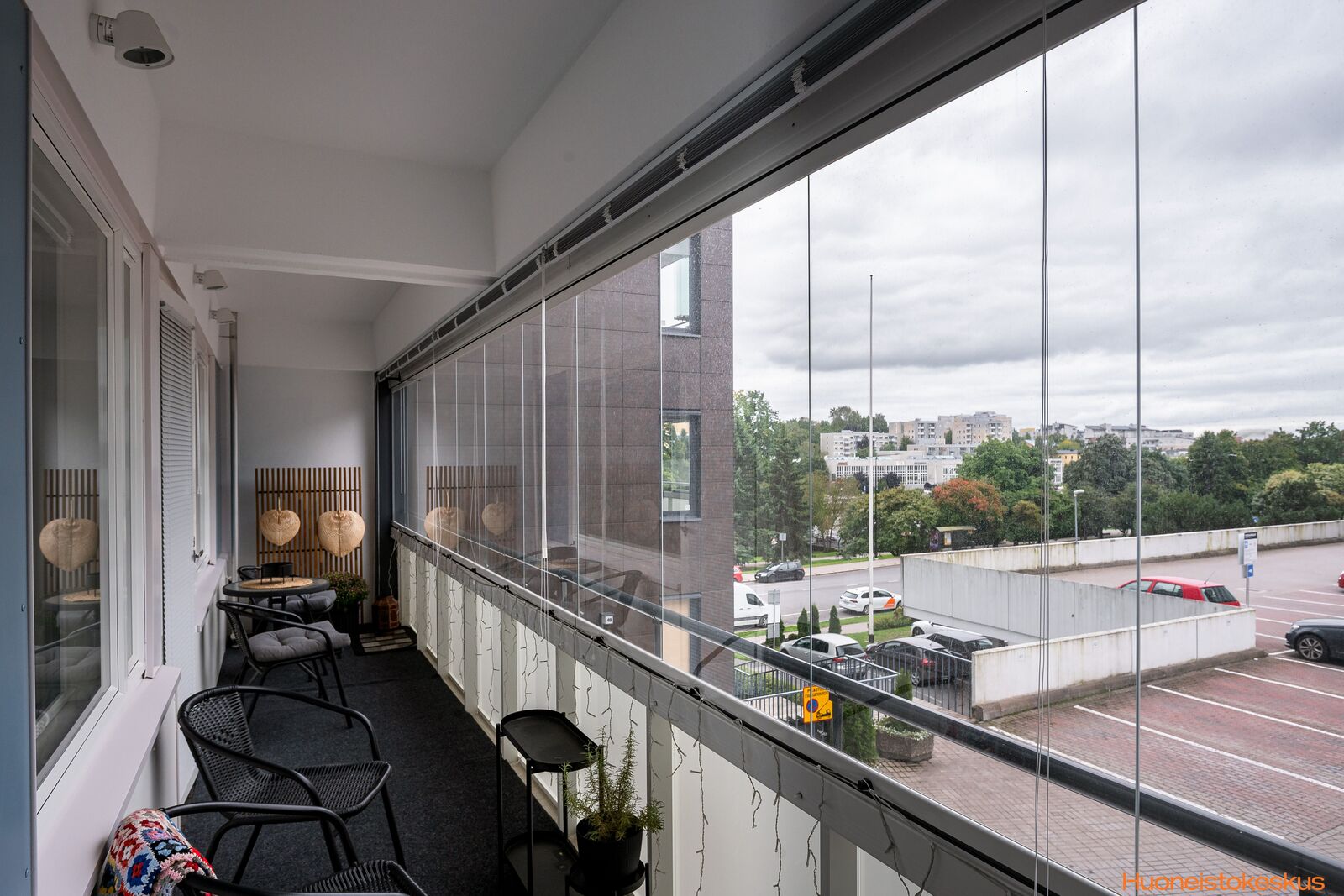 Kodin olohuone on avara ja sinne mahtuu olohuonekalustuksen lisäksi hyvin myös suurempi ruokapöytä tilanteisiin, kun isompi porukka yhdessä ruokailee. Olohuoneesta on käynti asunnon upealle, koko huoneiston levyiselle, lasitetulle parvekkeelle, jossa voi nauttia kauniista iltataivaasta ja auringonlaskuista.