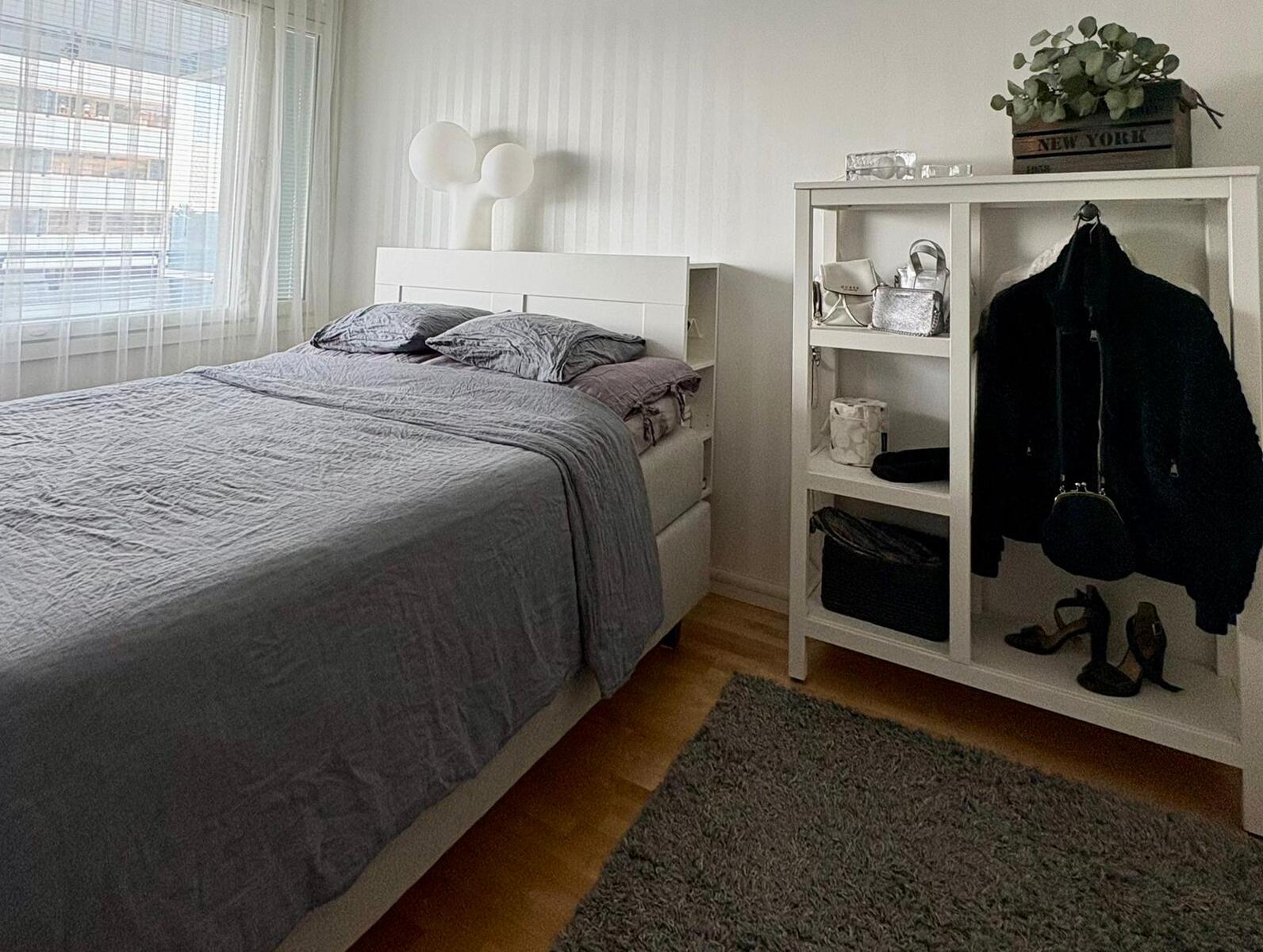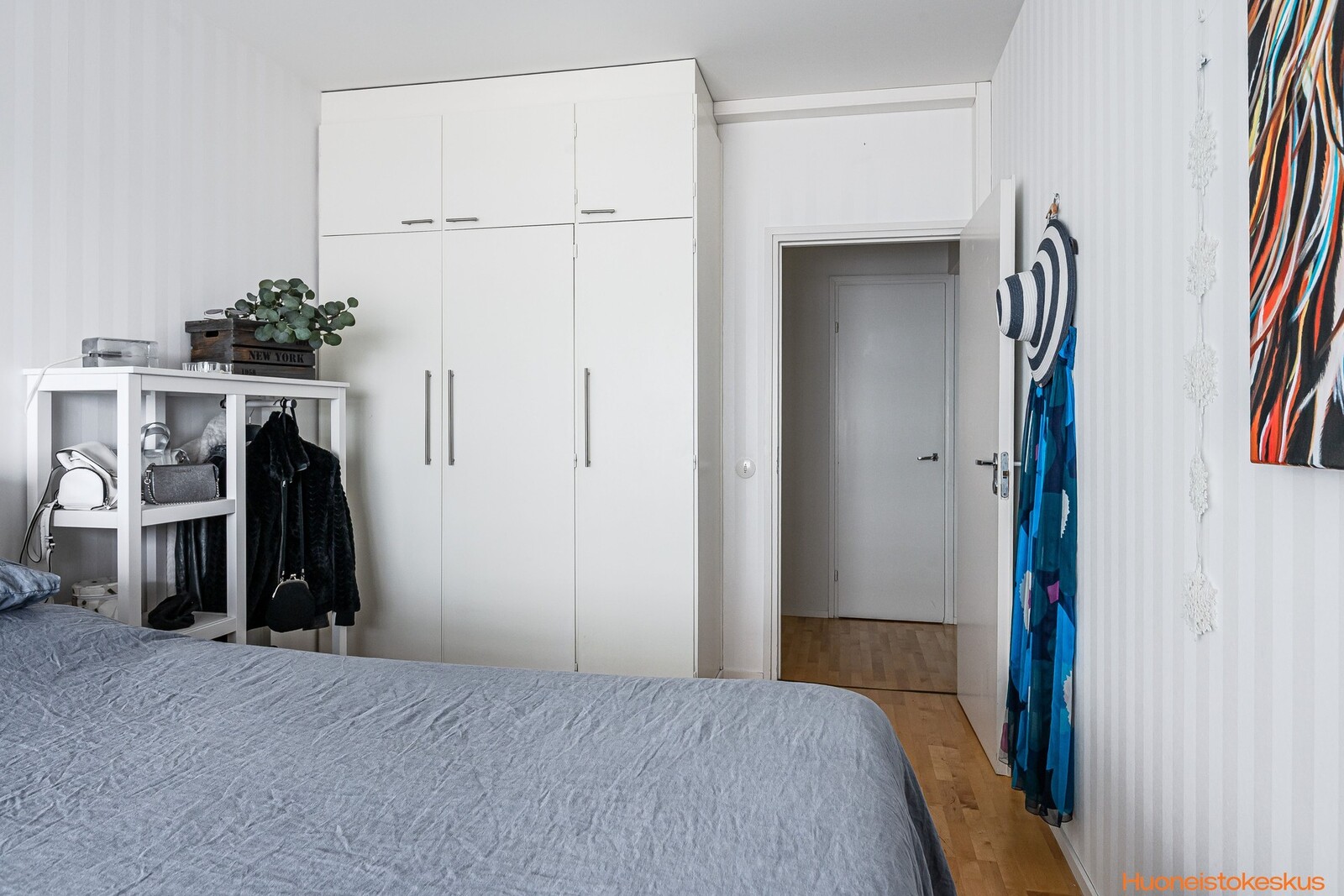 Asunnossa on tilava makuuhuone. Säilytystilaa löytyy kaapeista sekä tilavasta vaatehuoneesta.