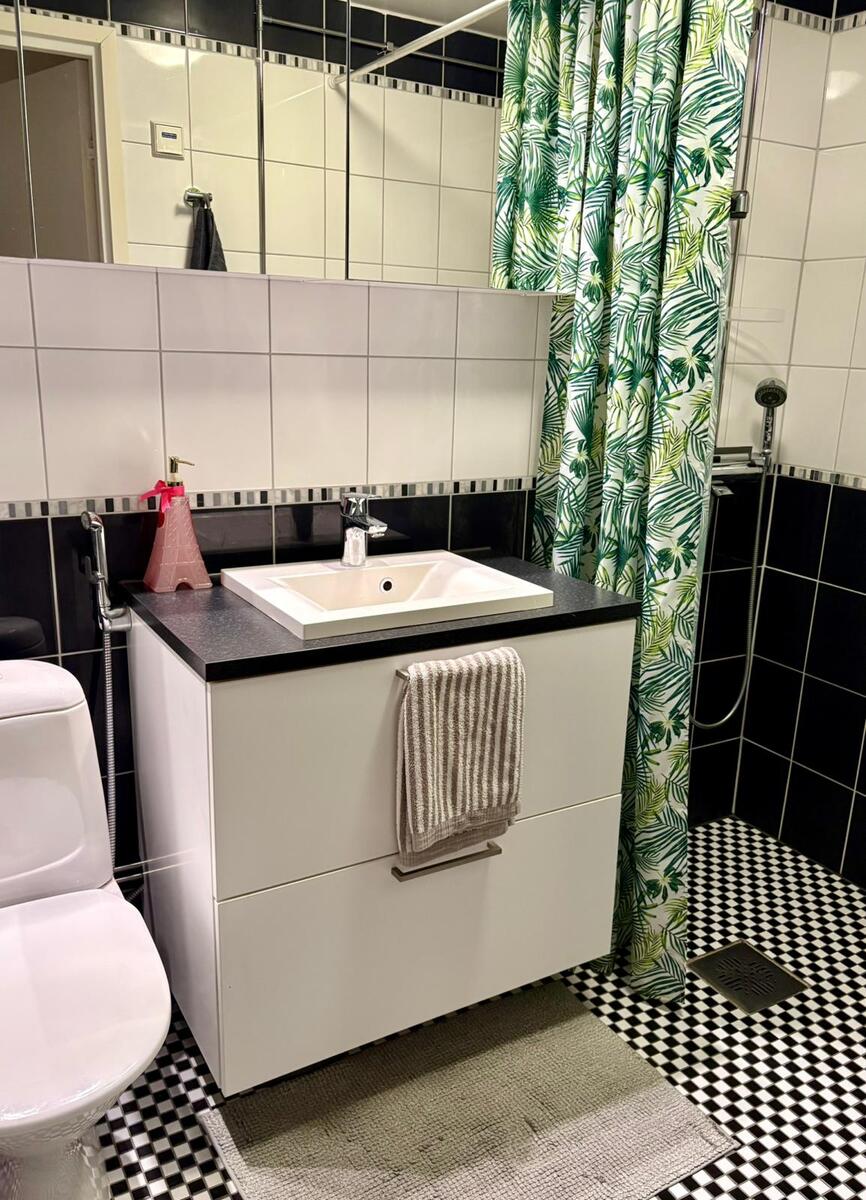 Kylpyhuone on kauniisti remontoitu perinteisen linjasaneerauksen yhteydessä vuonna 2010 ja sinne mahtuu hyvin myös pyykkikone..