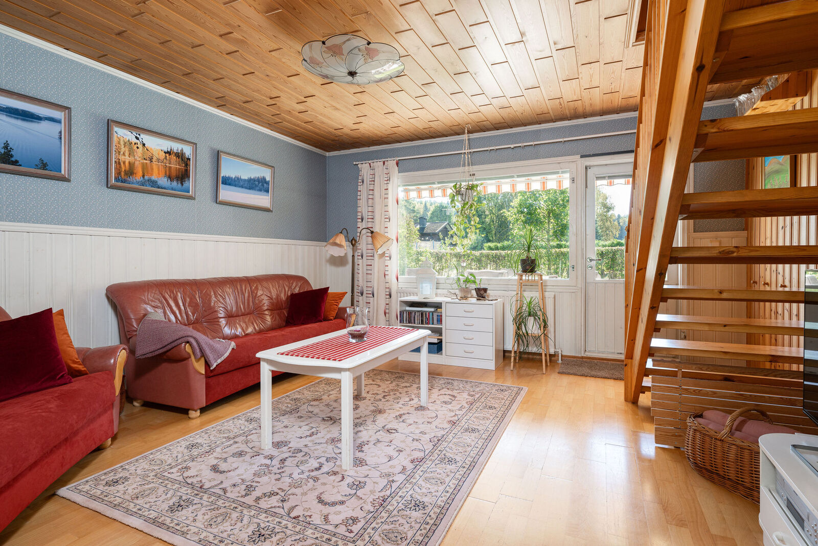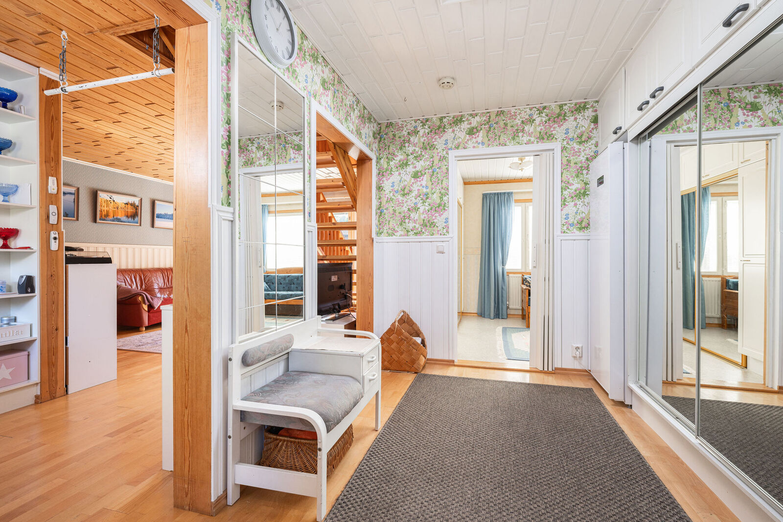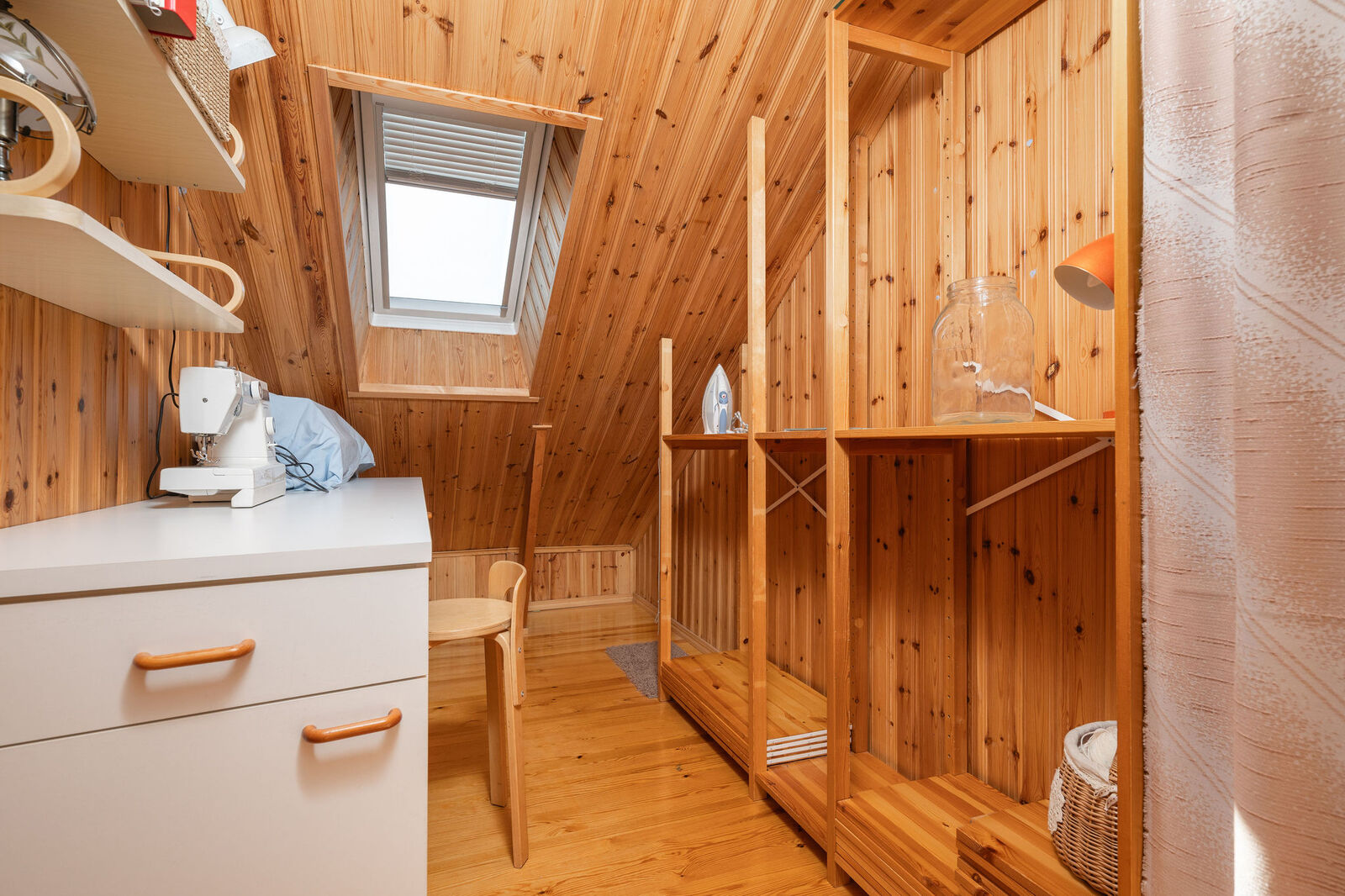 Lukumäärä: 3, alakerran makuuhuone muovimatto, yläkerrassa mäntylauta |