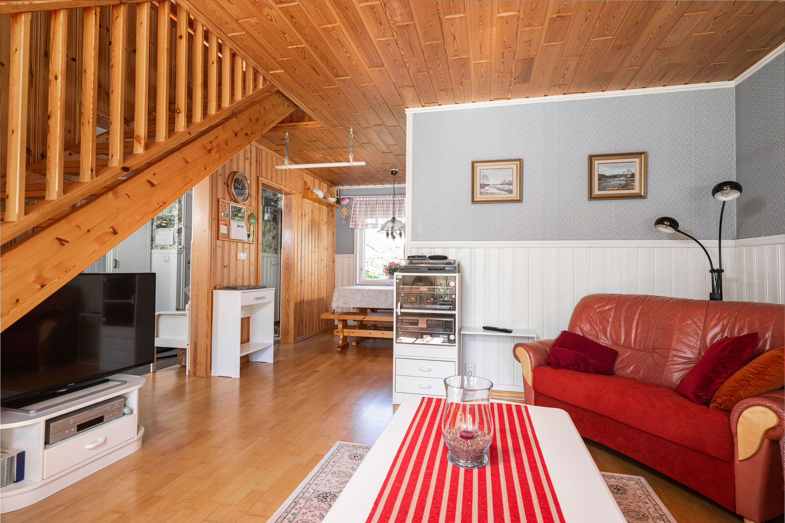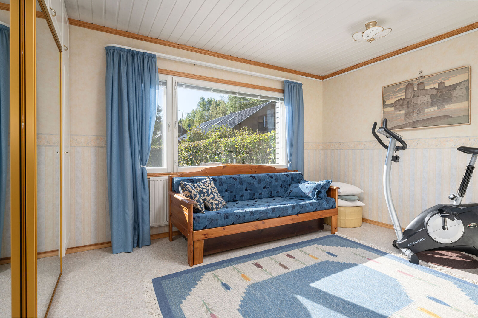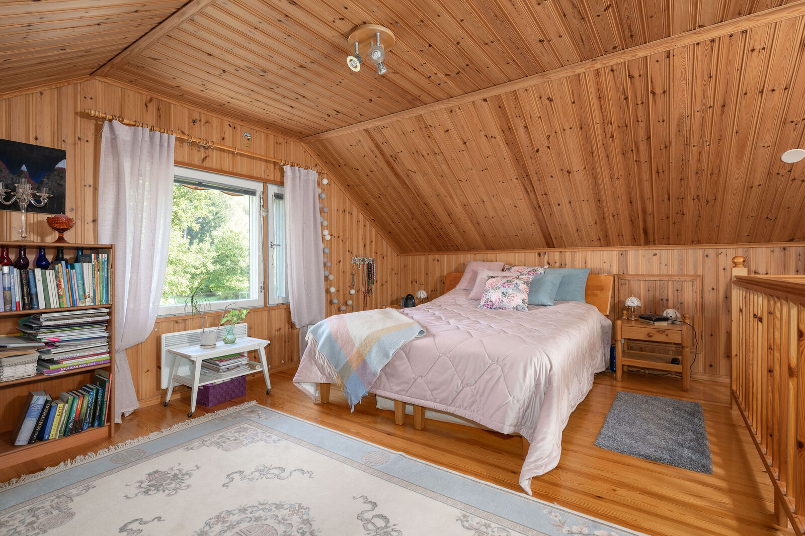 Lukumäärä: 3, alakerran makuuhuone muovimatto, yläkerrassa mäntylauta |