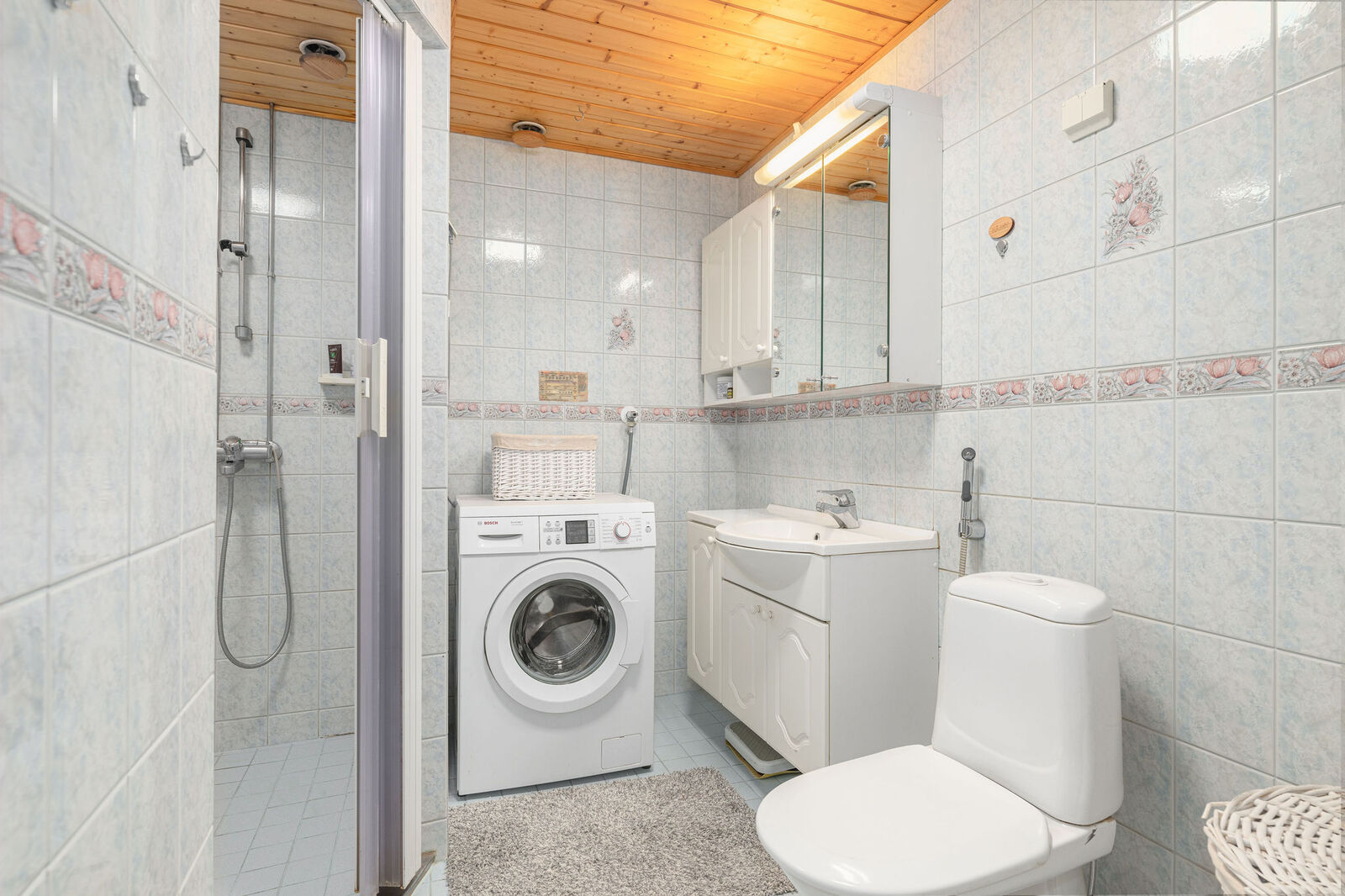 Lattialämmitys, pesukoneliitäntä ja suihku, seinät (kaakeli), lattiat (laatta) |