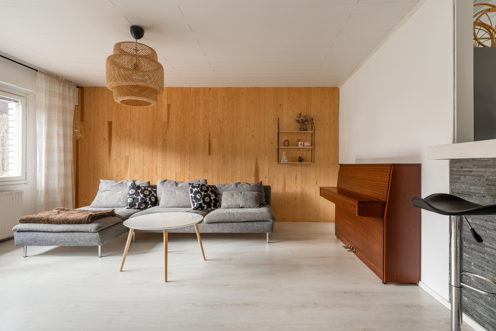 Seinät (maali), lattiat (laminaatti), Olohuoneen seinässä tyylikäs sormipaneli |