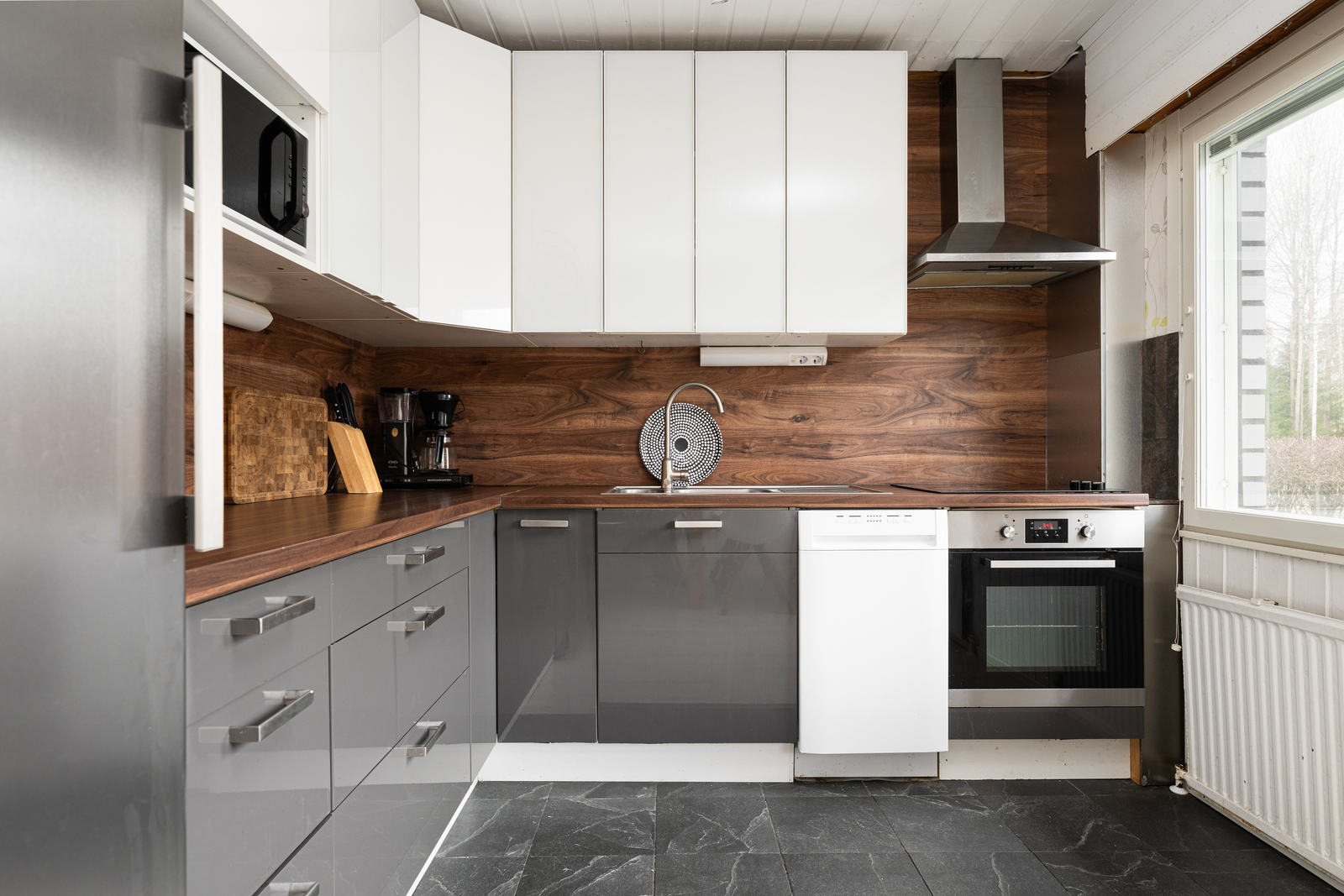 Liesi (integroitu, erillisuuni), seinät (maali), lattiat (laatta), astianpesukone, erillisuuni, jääkaappipakastin, liesituuletin ja kiinteät valaisimet |