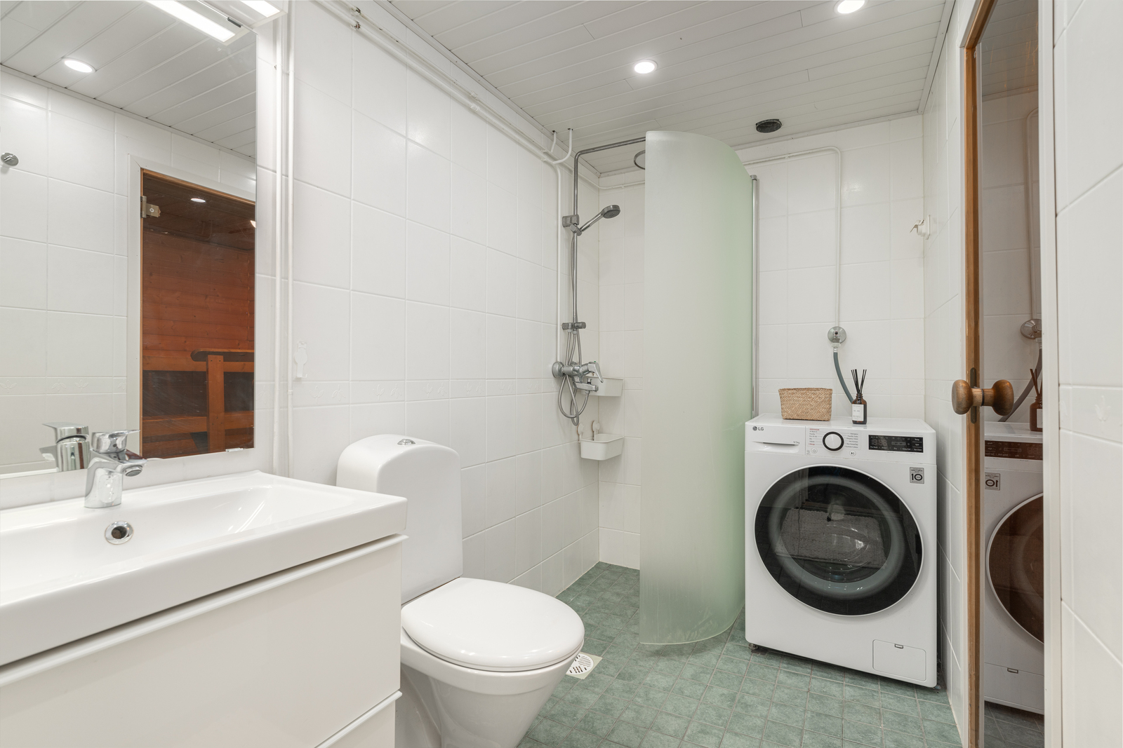 Pesukoneliitäntä, lattialämmitys, suihkuseinä, peilikaappi, suihku, wc-istuin ja kiinteät valaisimet, seinät (kaakeli), lattiat (laatta) |