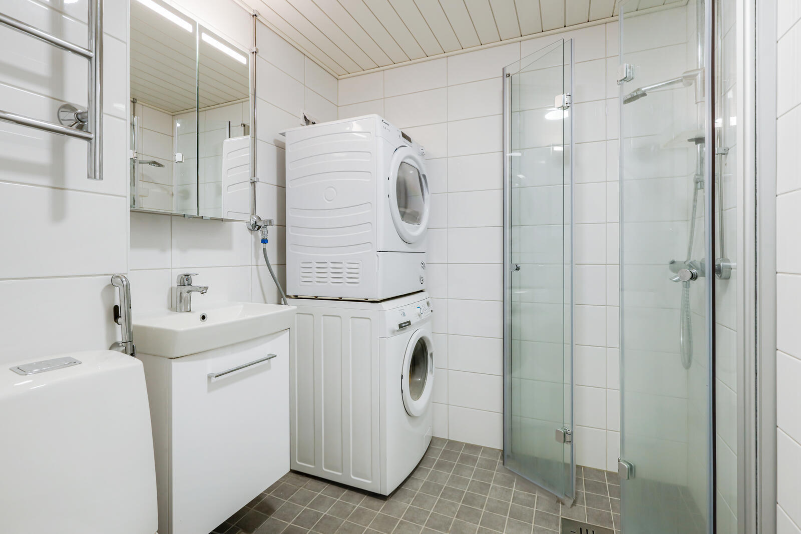 WC-istuin, pesukoneliitäntä, suihku ja lattialämmitys, seinät (kaakeli), lattiat (laatta) |