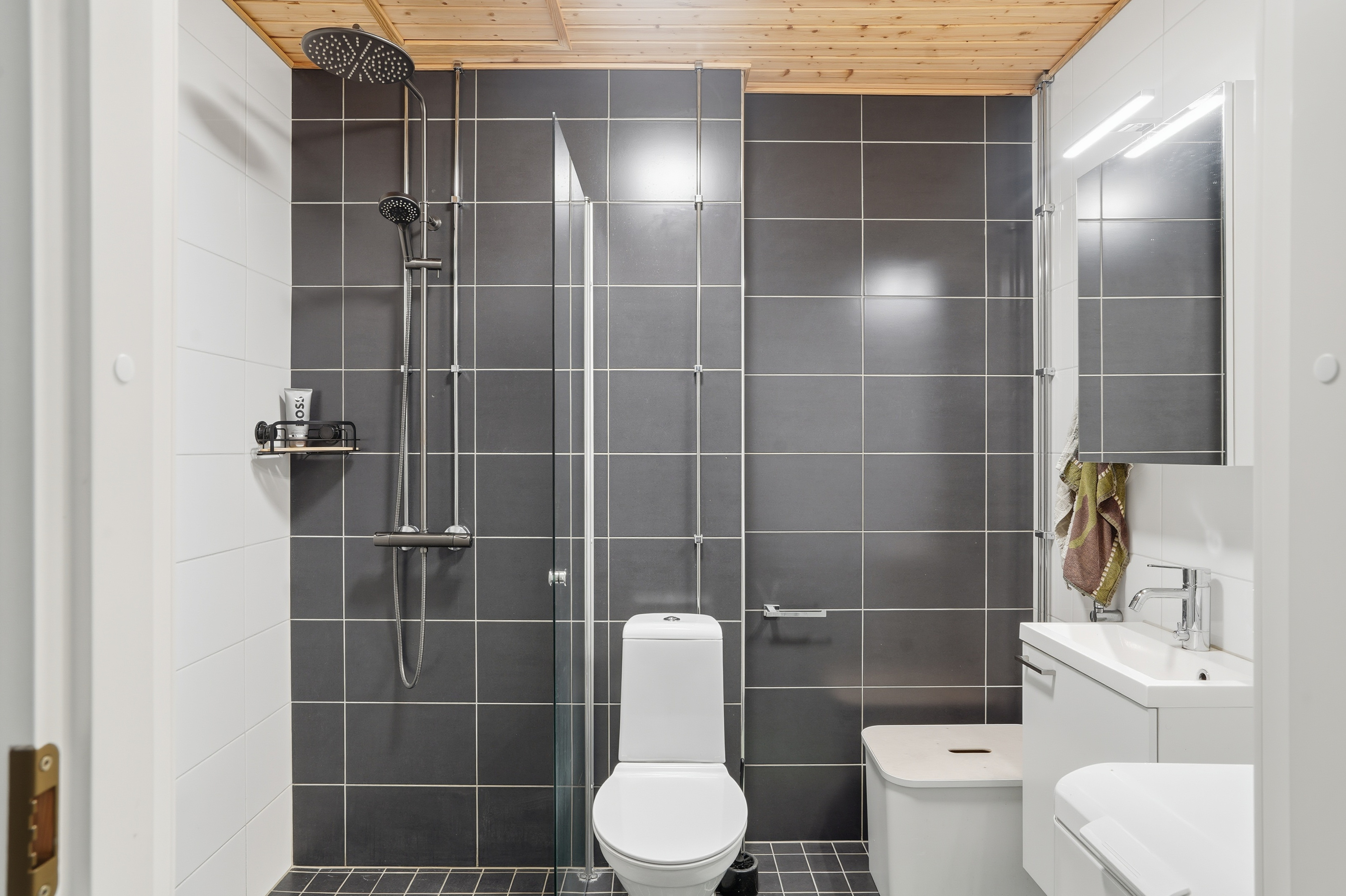 | Kylpyhuoneen kuvaus | WC-istuin, suihku ja pesukoneliitäntä, seinät (kaakeli), lattiat (laatta) |