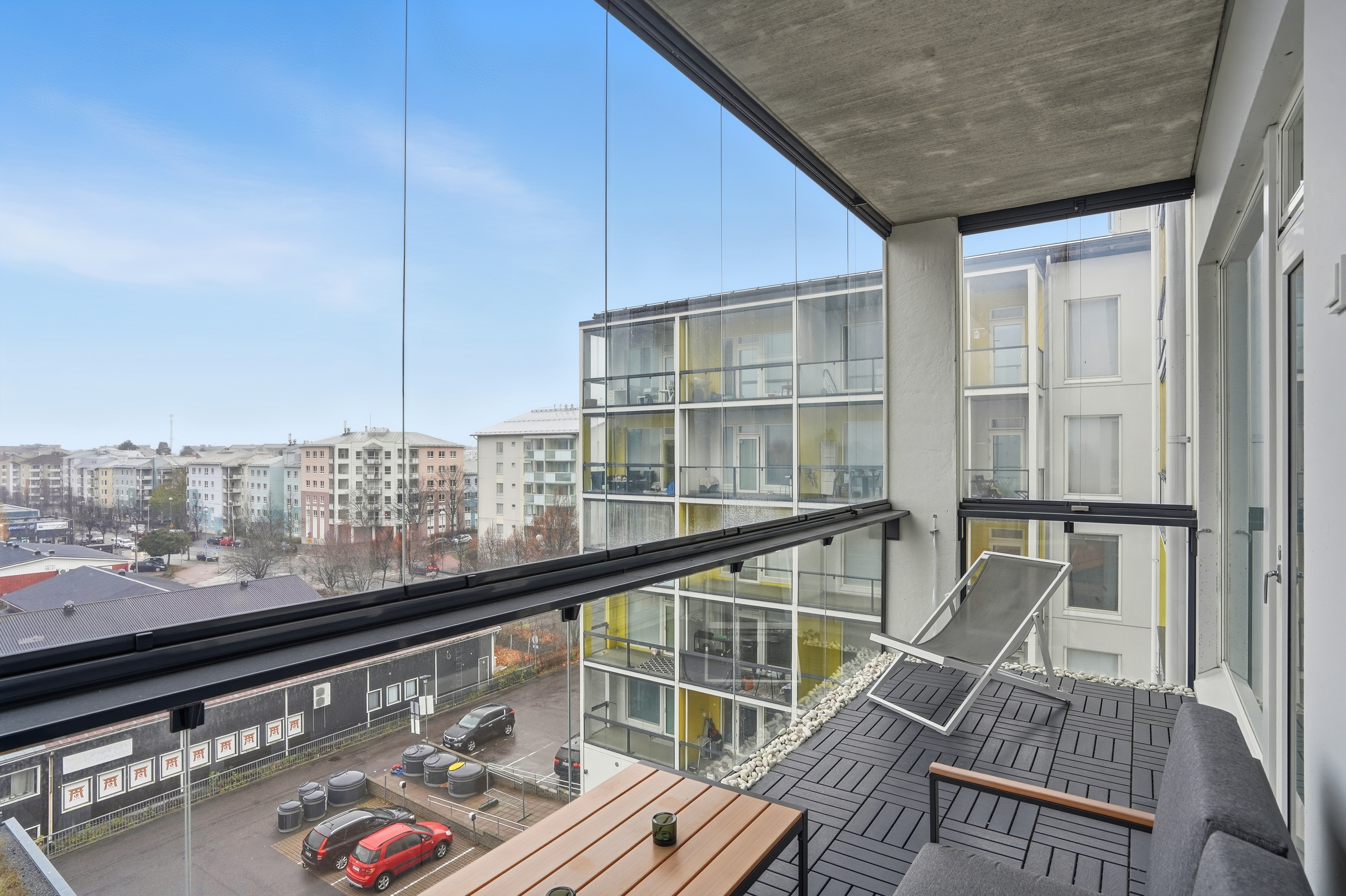 Tässä sinulle uusi koti viidennestä kerroksesta, lasitetulla ja tilavalla parvekkeella!