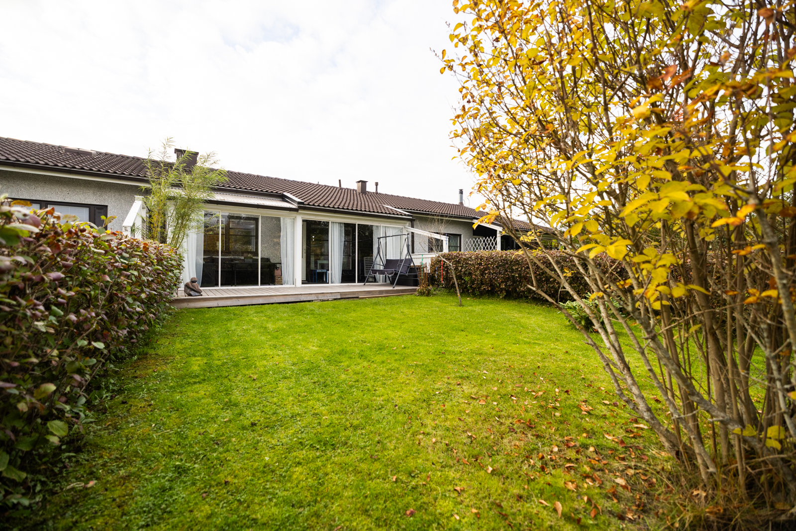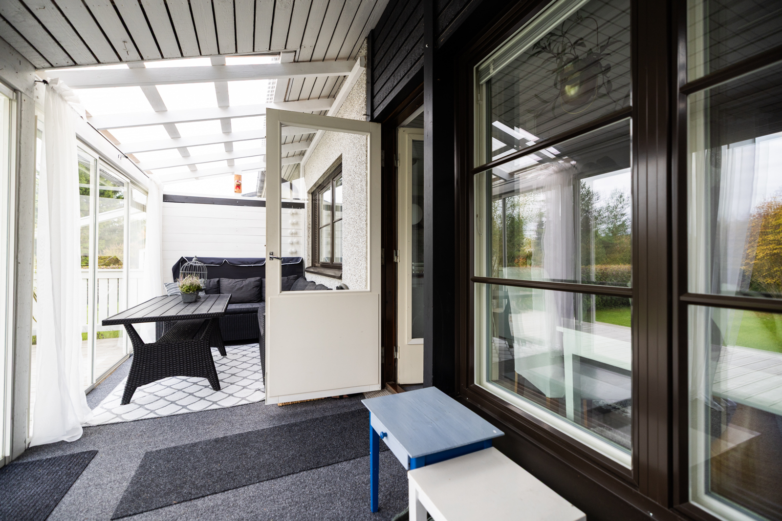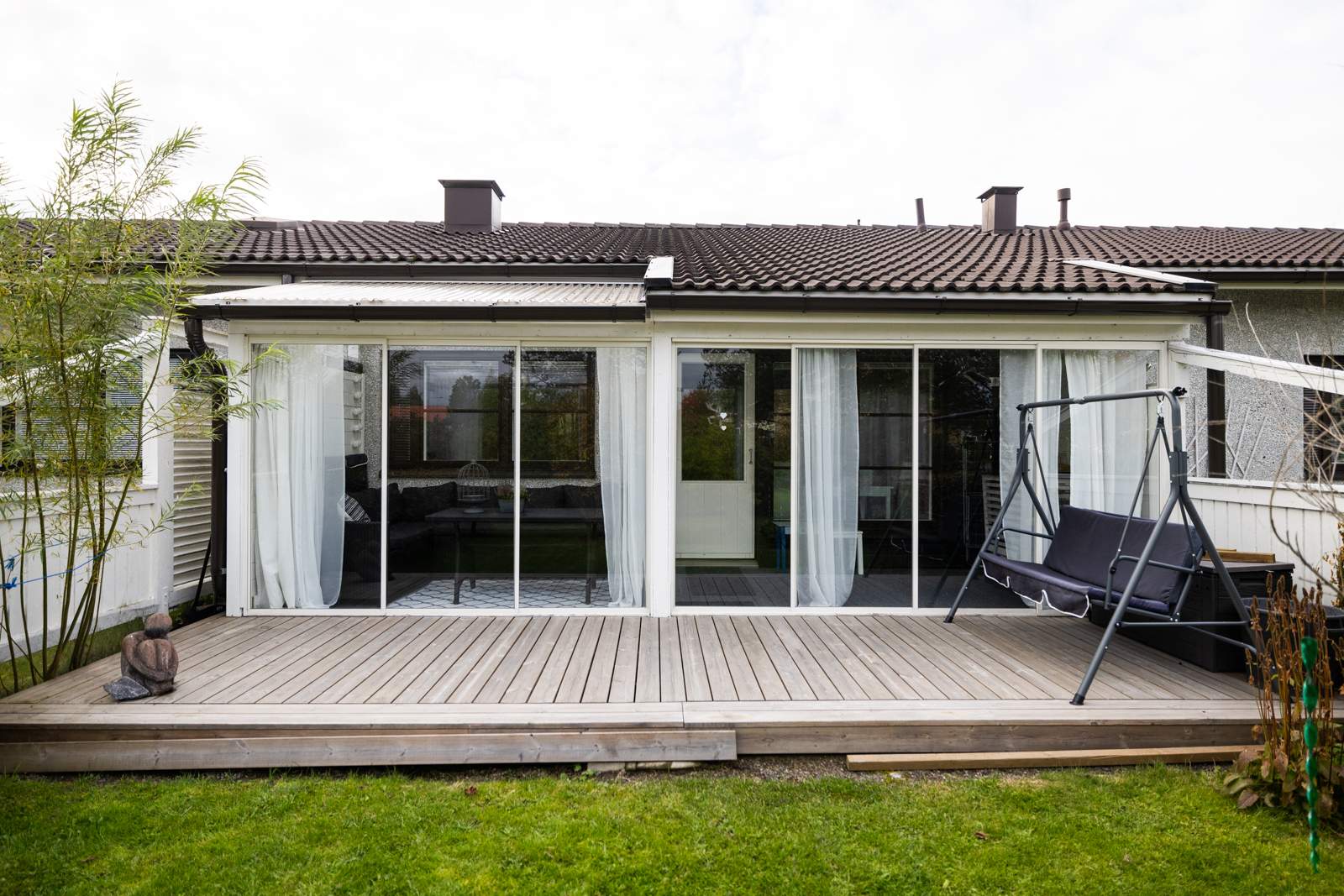 Seinät (maali ja tapetti), lattiat (laminaatti), Olohuoneesta käynti takapihan tilavalle lasitetulle terassille, missä pääset nauttimaan aamukahvista auringon paistaessa itäsuunnalta. |