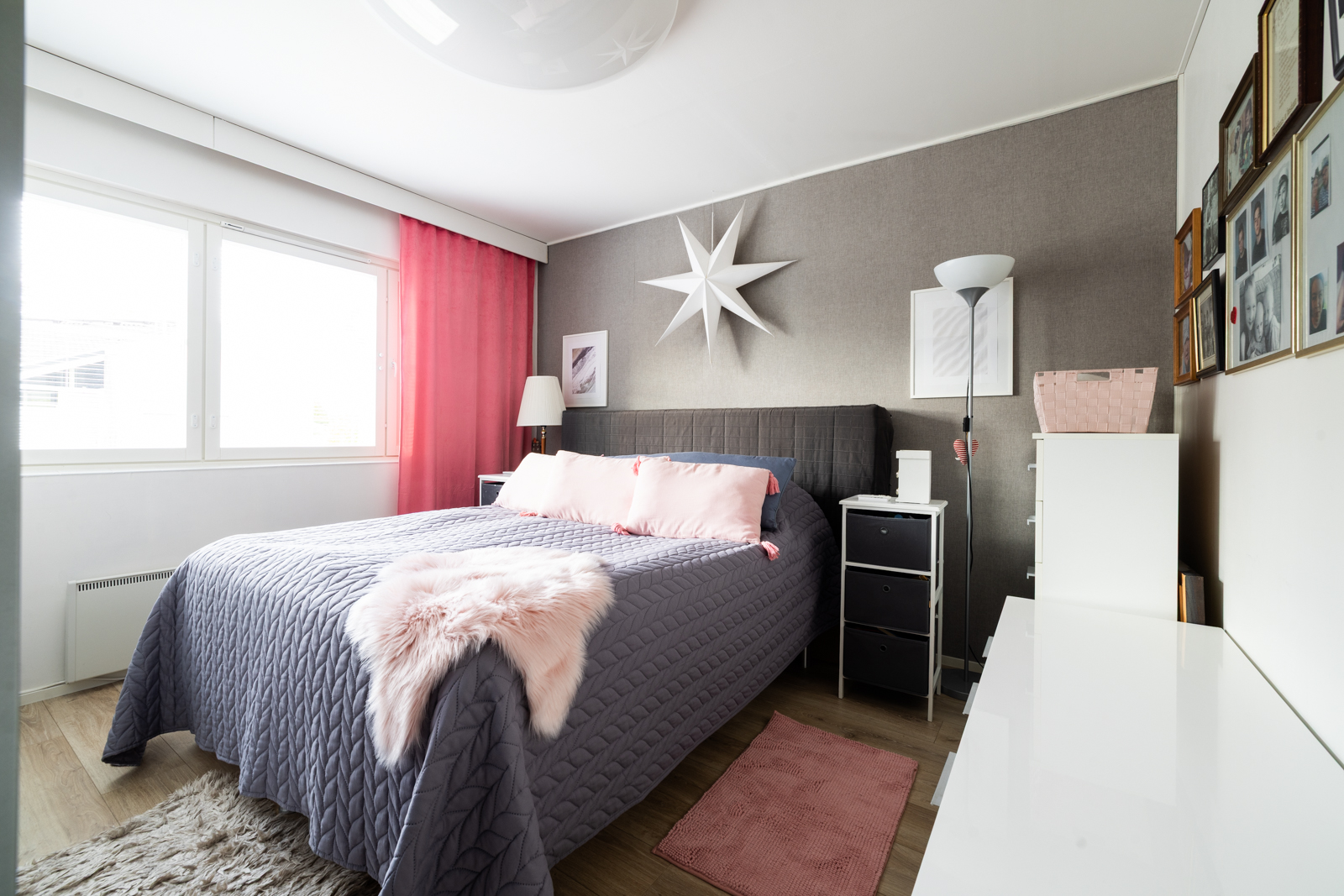 Lukumäärä: 1, seinät (tapetti ja maali), lattiat (laminaatti), Iso makuuhuone |