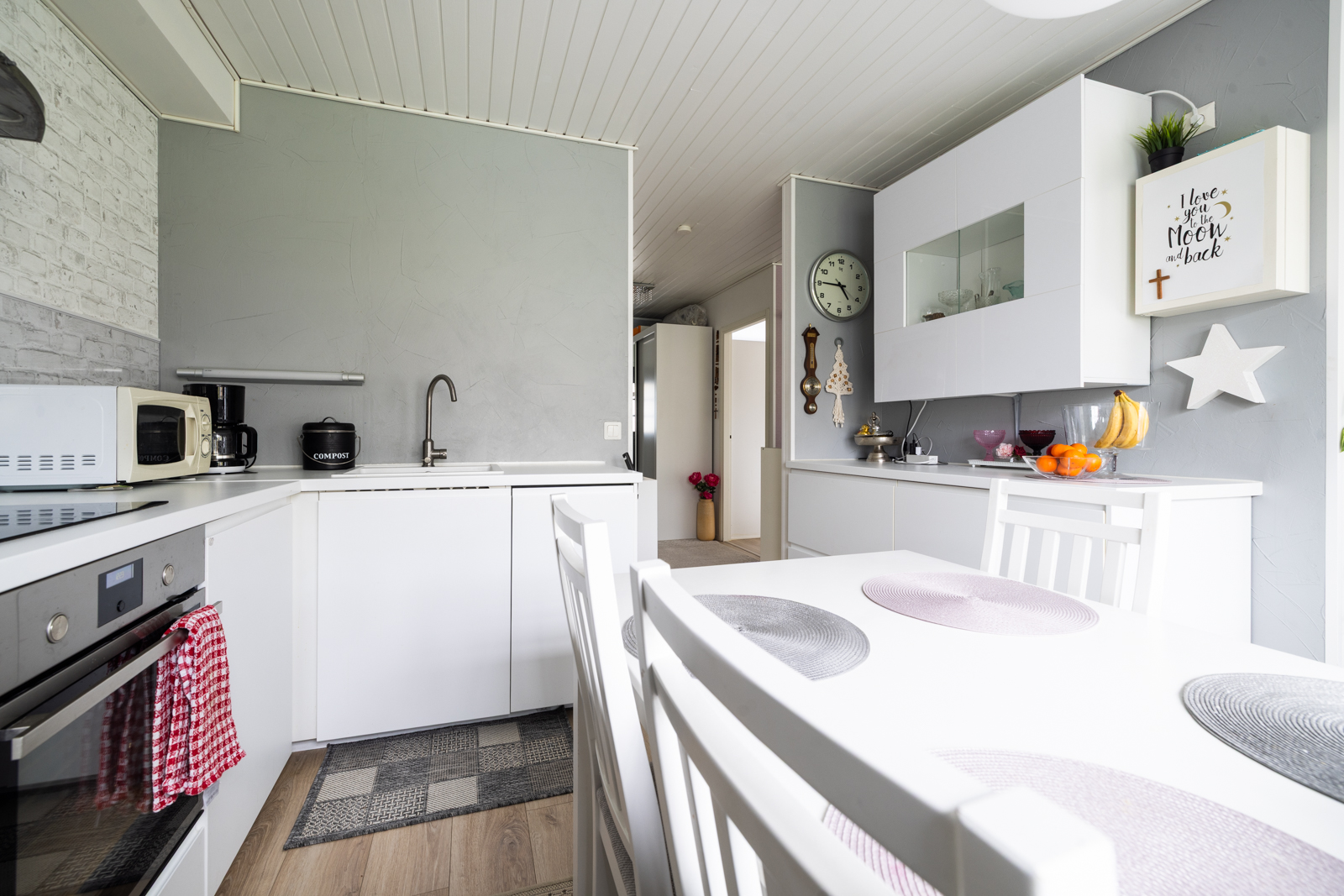 Työtasot (laminaatti), seinät (maali ja tapetti), lattiat (laminaatti), erillisuuni (rosterinen), astianpesukone (integroitu), jääkaappipakastin, liesituuletin ja liesitaso (Induktio) |