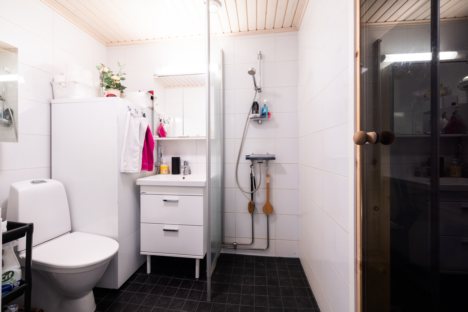 Peilikaappi (2 kpl.), wc-istuin, suihku, suihkuseinä, pesukoneliitäntä, allaskaappi, lattialämmitys, pesuallas ja bidee-suihku, seinät (kaakeli), lattiat (laatta) |