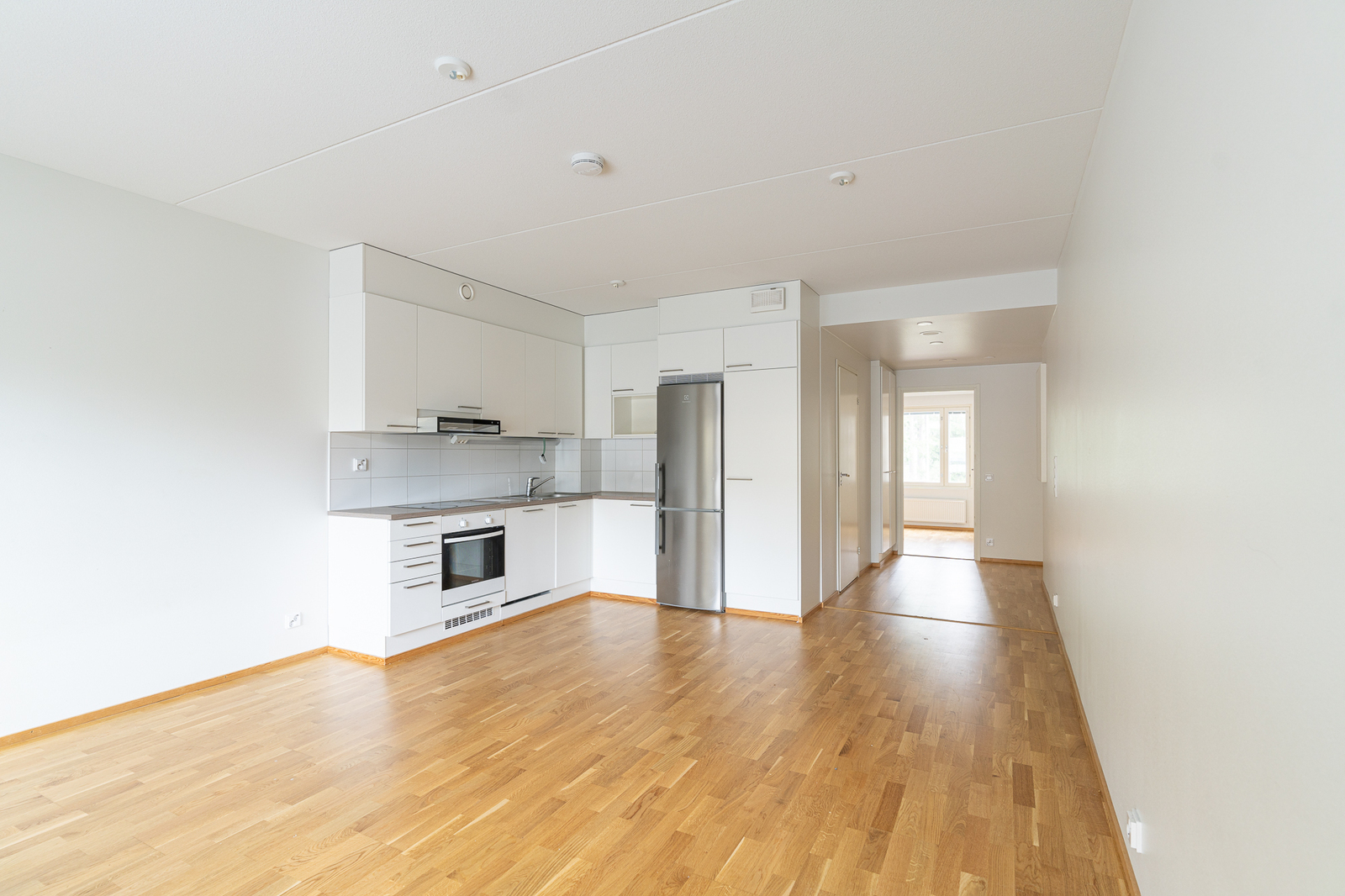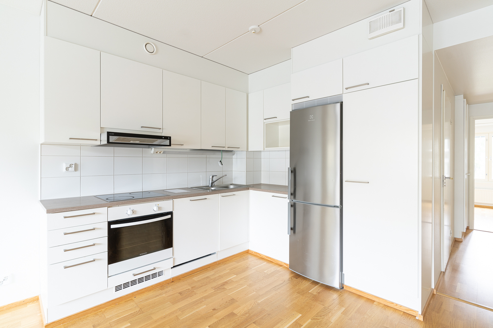 | Keittiön kuvaus | Liesi (Keraaminen liesi ja liesitaso, erillisuuni), työtasot (laminaatti), seinät (maali ja laatta), lattiat (parketti), erillisuuni, liesituuletin, jääkaappipakastin, astianpesukone ja liesitaso, kiinteät valaisimet |