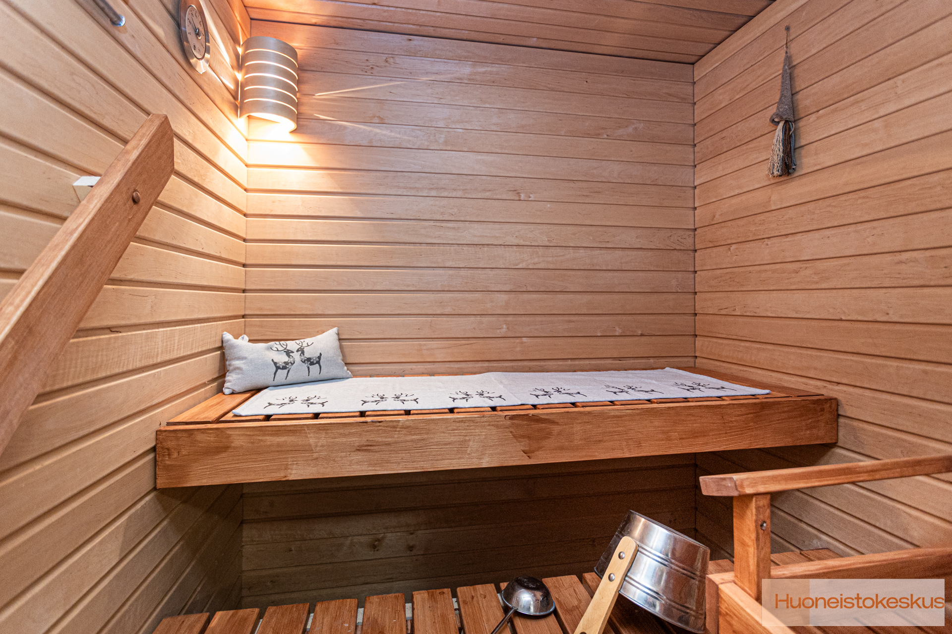 | Saunan kuvaus | Seinät (paneeli), lattiat (laatta), Sähkökiuas |