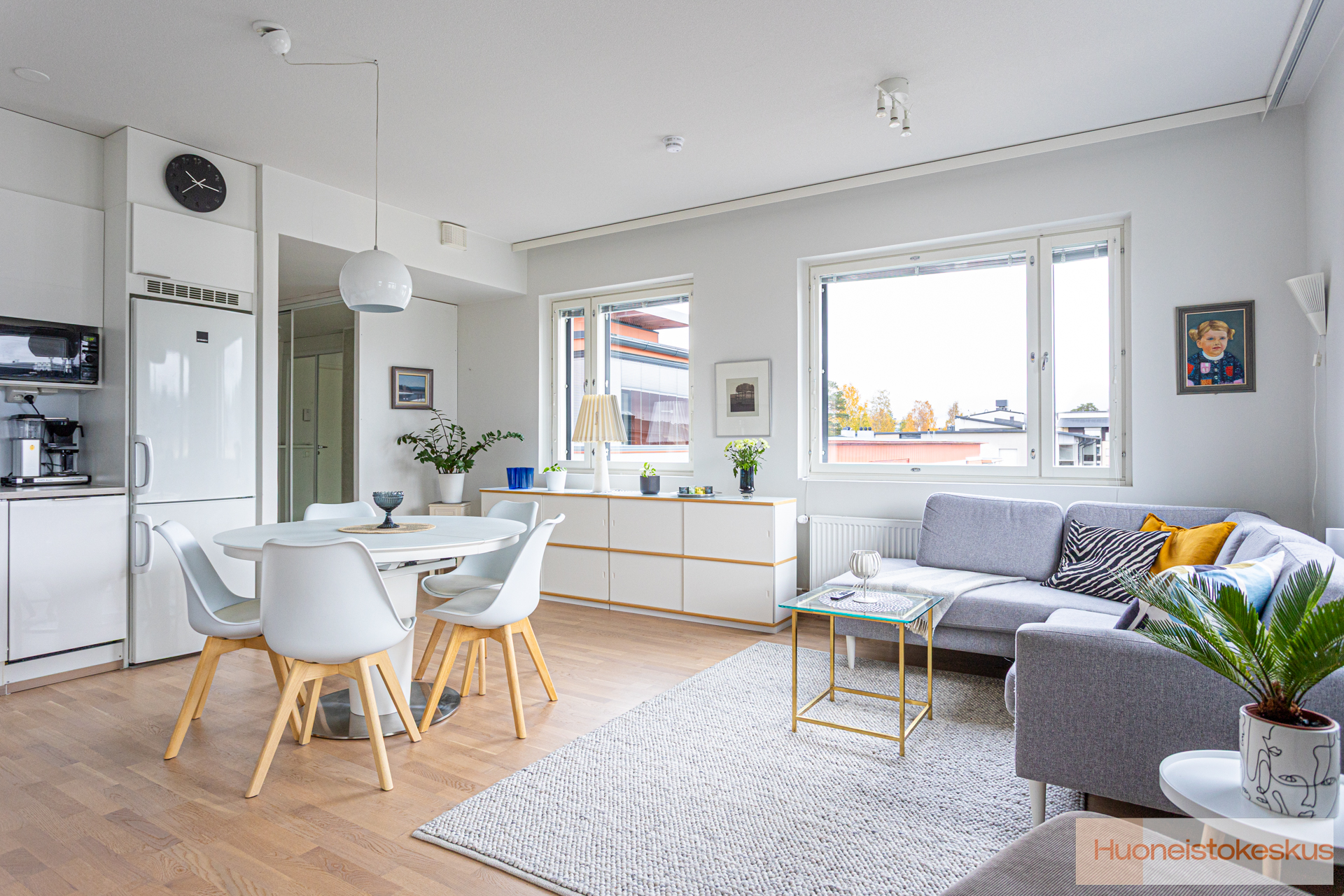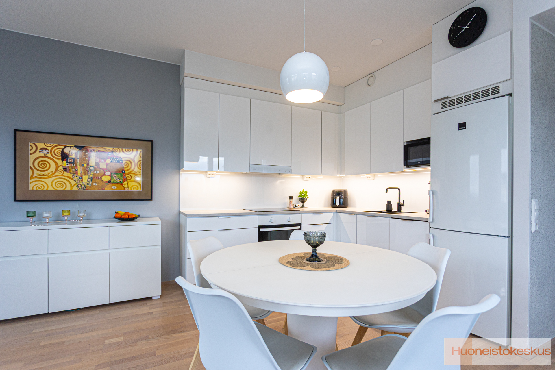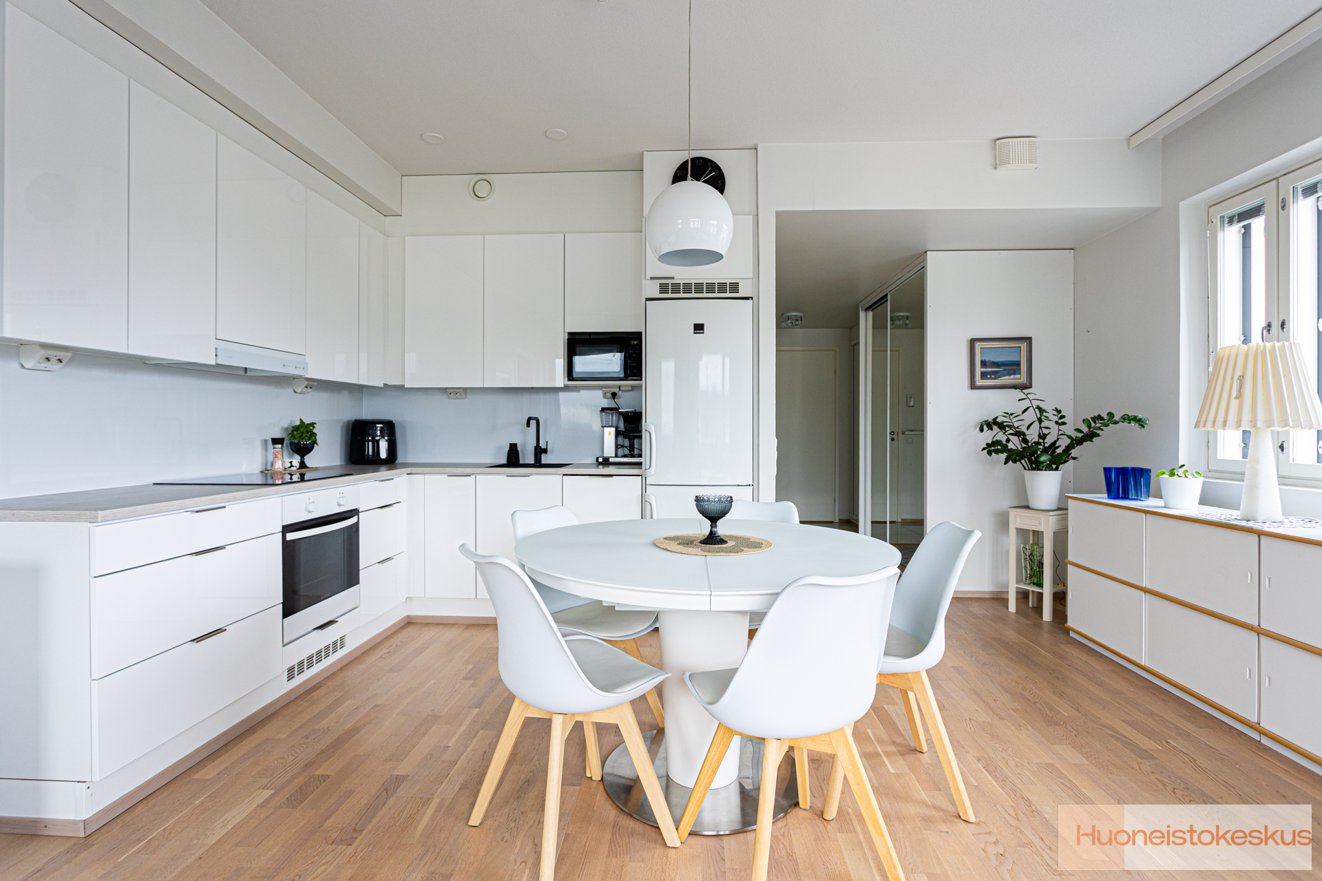 Avokeittiö on remontoitu tyylikkäästi vuonna 2023, ja se on varusteltu erinomaisesti: erillinen uuni, jääkaappipakastin, astianpesukone sekä induktioliesi tekevät arjesta sujuvaa. Olohuoneessa on viilentävä ilmalämpöpumppu (asennettu 2023), ja sieltä on käynti itään suuntautuvalle lasitetulle parvekkeelle – täydellinen paikka aamukahville ja rentoutumiselle.