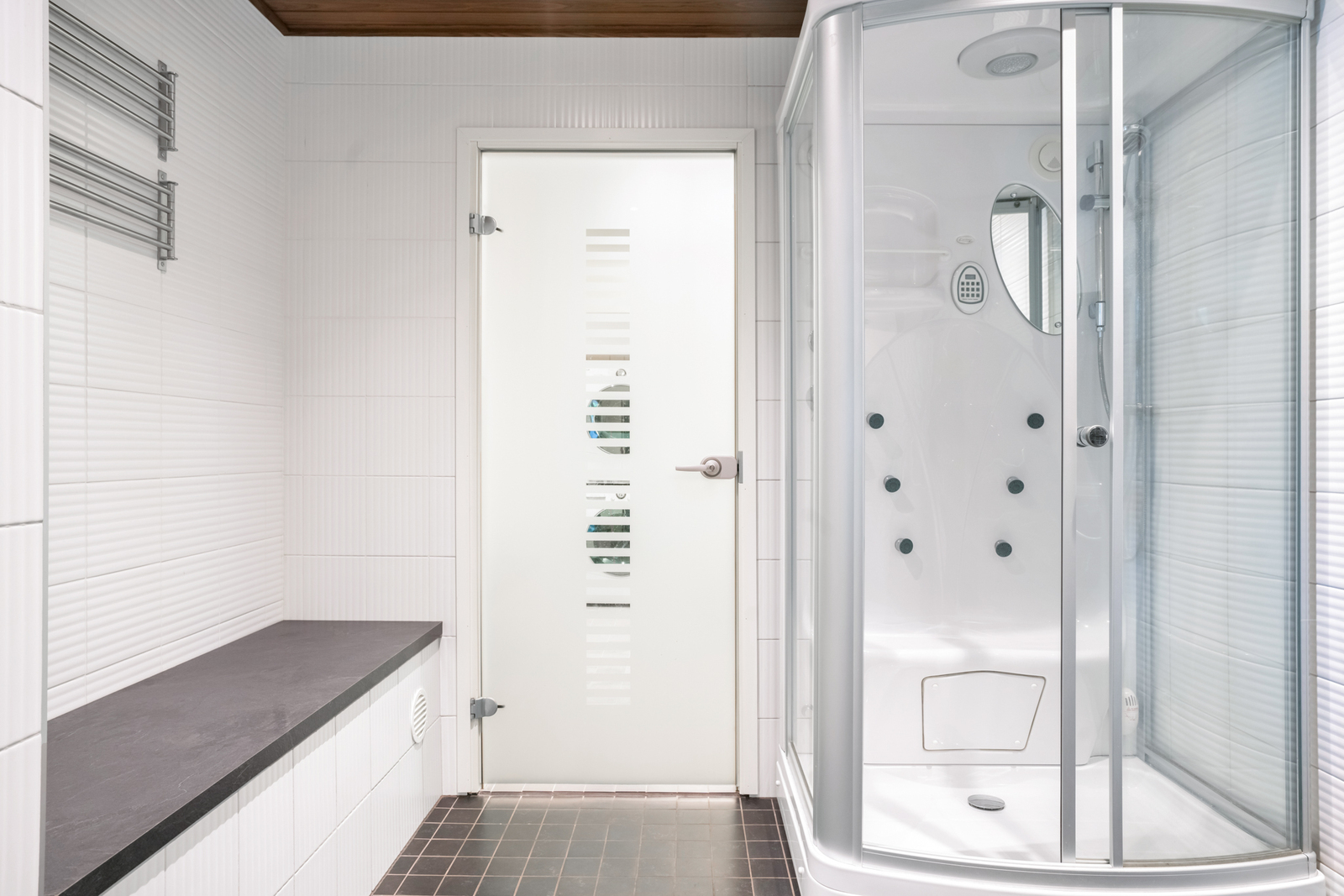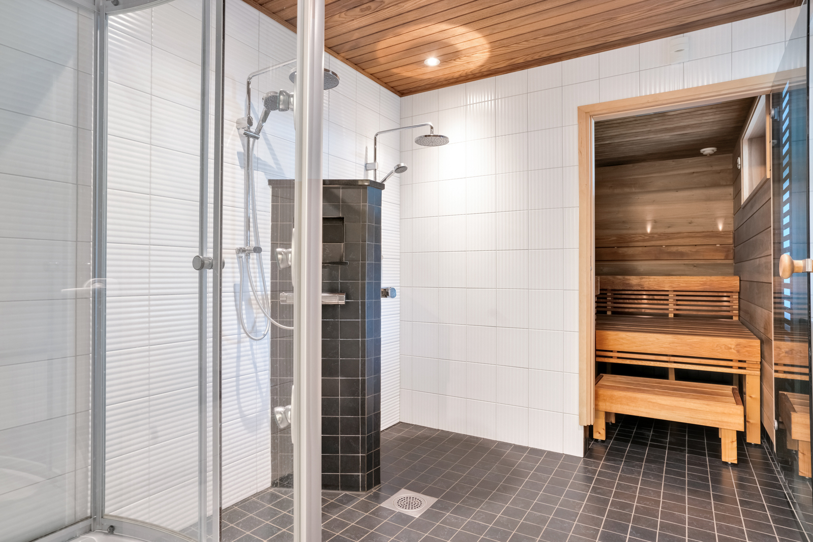 Lattialämmitys, suihku ja kiinteät valaisimet, seinät (kaakeli), lattiat (laatta) |