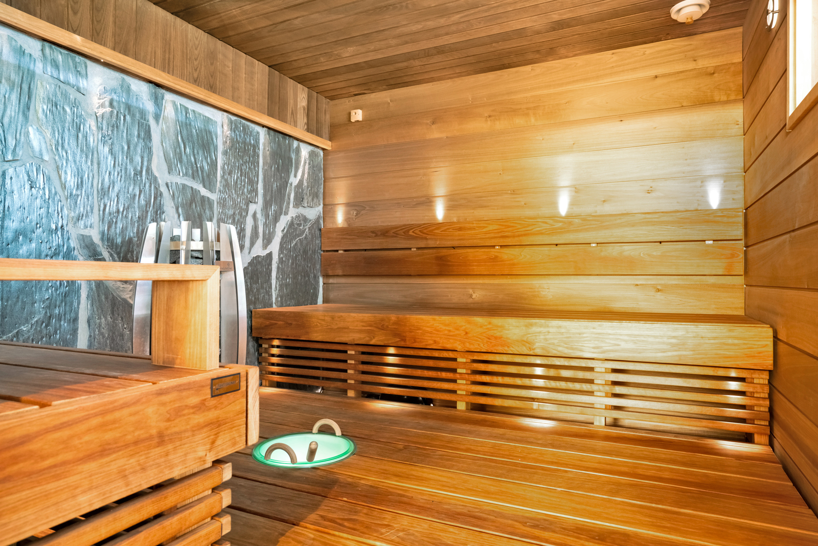 Tähtisaunojen suunnittelema uniikki sauna loimukiviseinällä, pesuhuoneessa voit jatkaa rentoutumista höyrykaappissa.