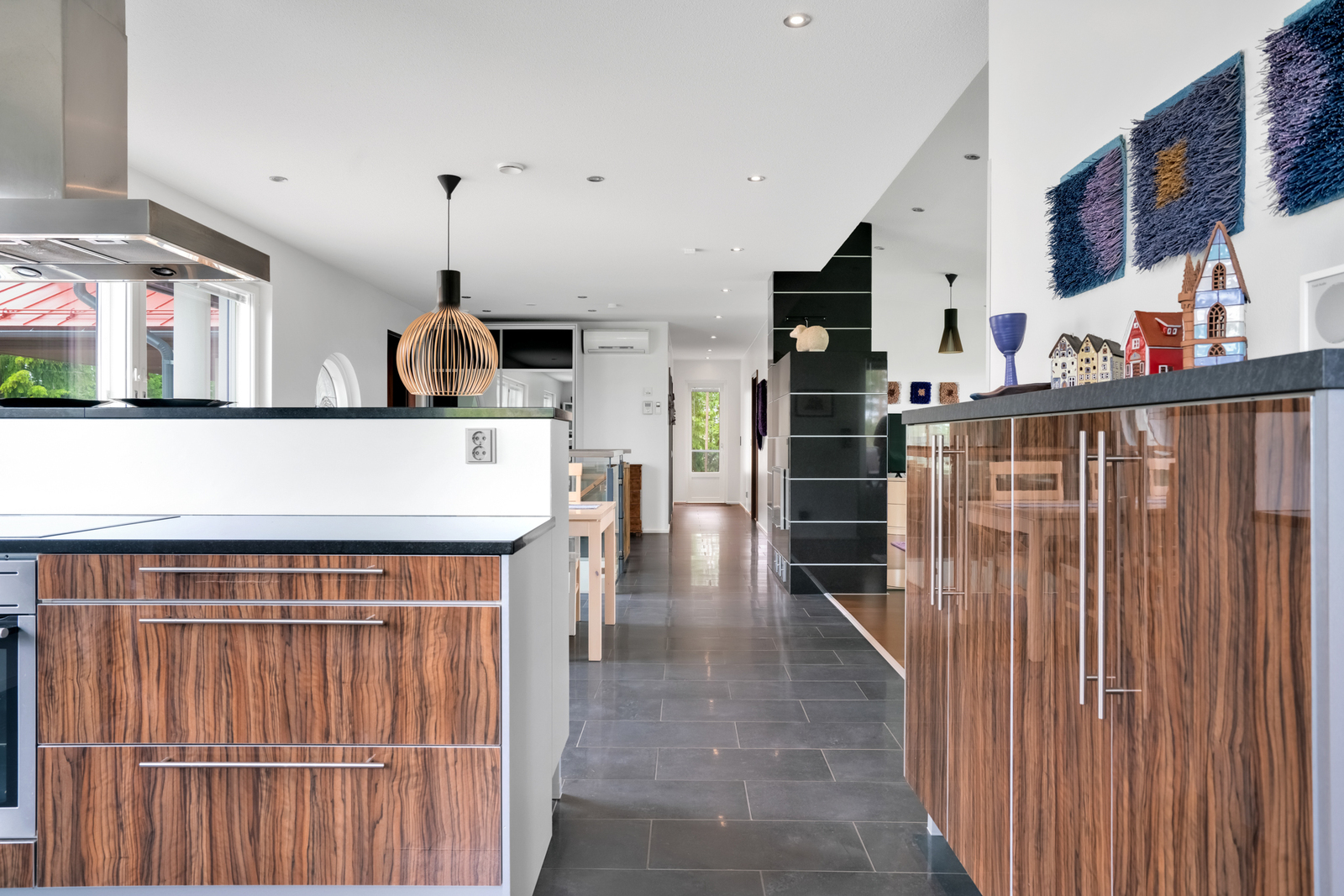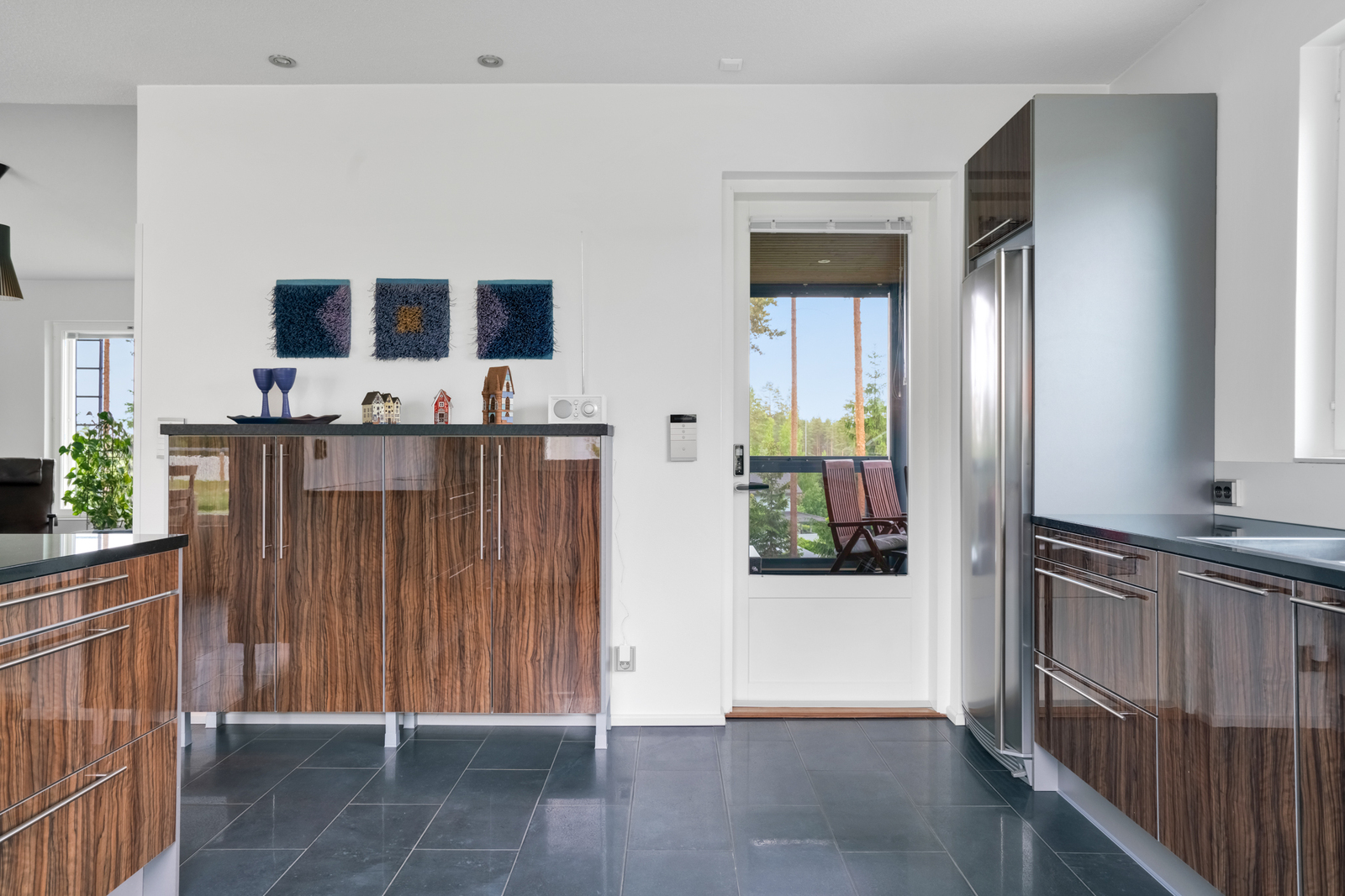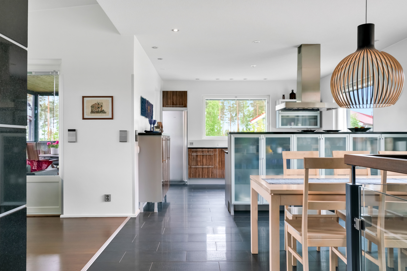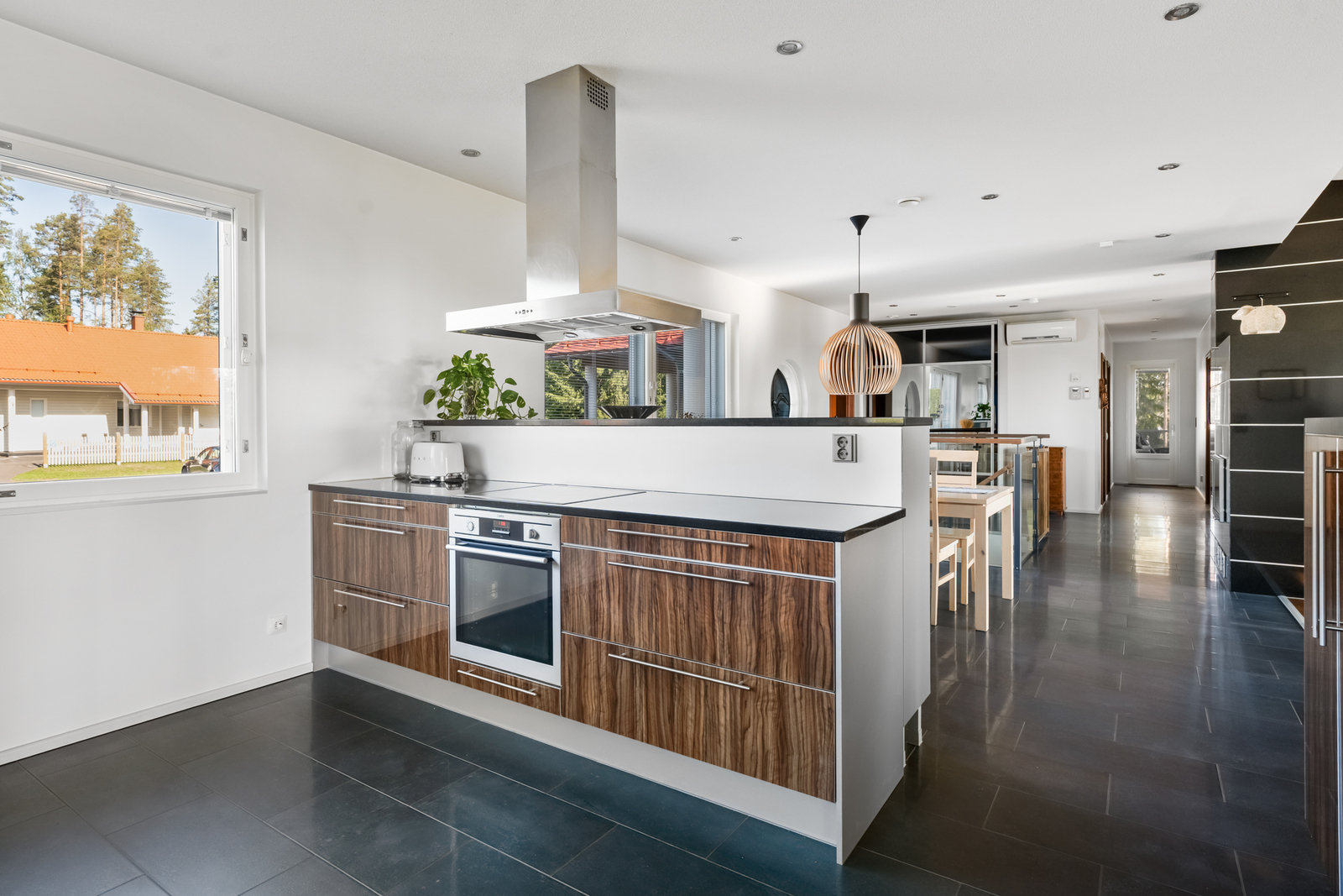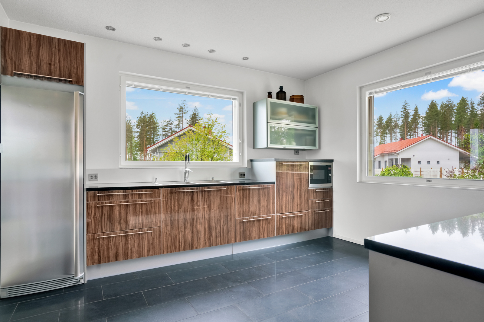 Liesi (Induktioliesi ja integroitu, erillisuuni), seinät (maali), lattiat (kivi), erillisuuni, liesituuletin, liesi, jääkaappi, mikroaaltouuni, astianpesukone, erillinen pakastin ja liesituuletin / hormi, kiinteät valaisimet |