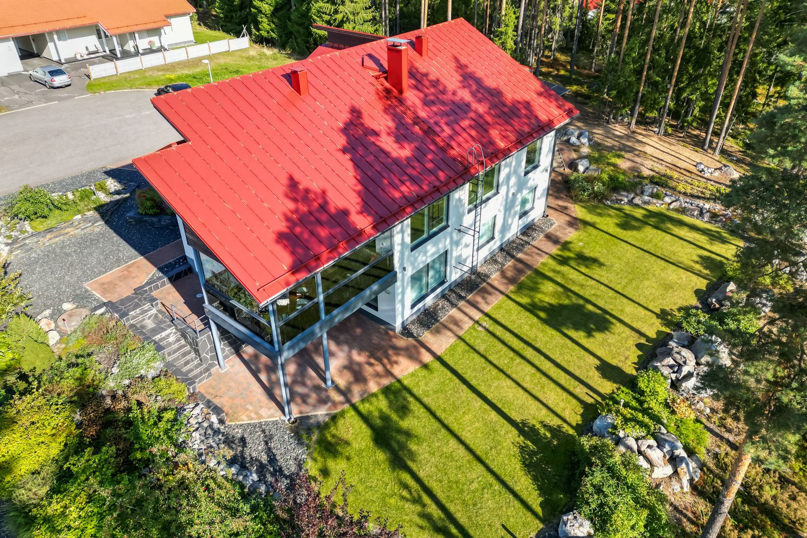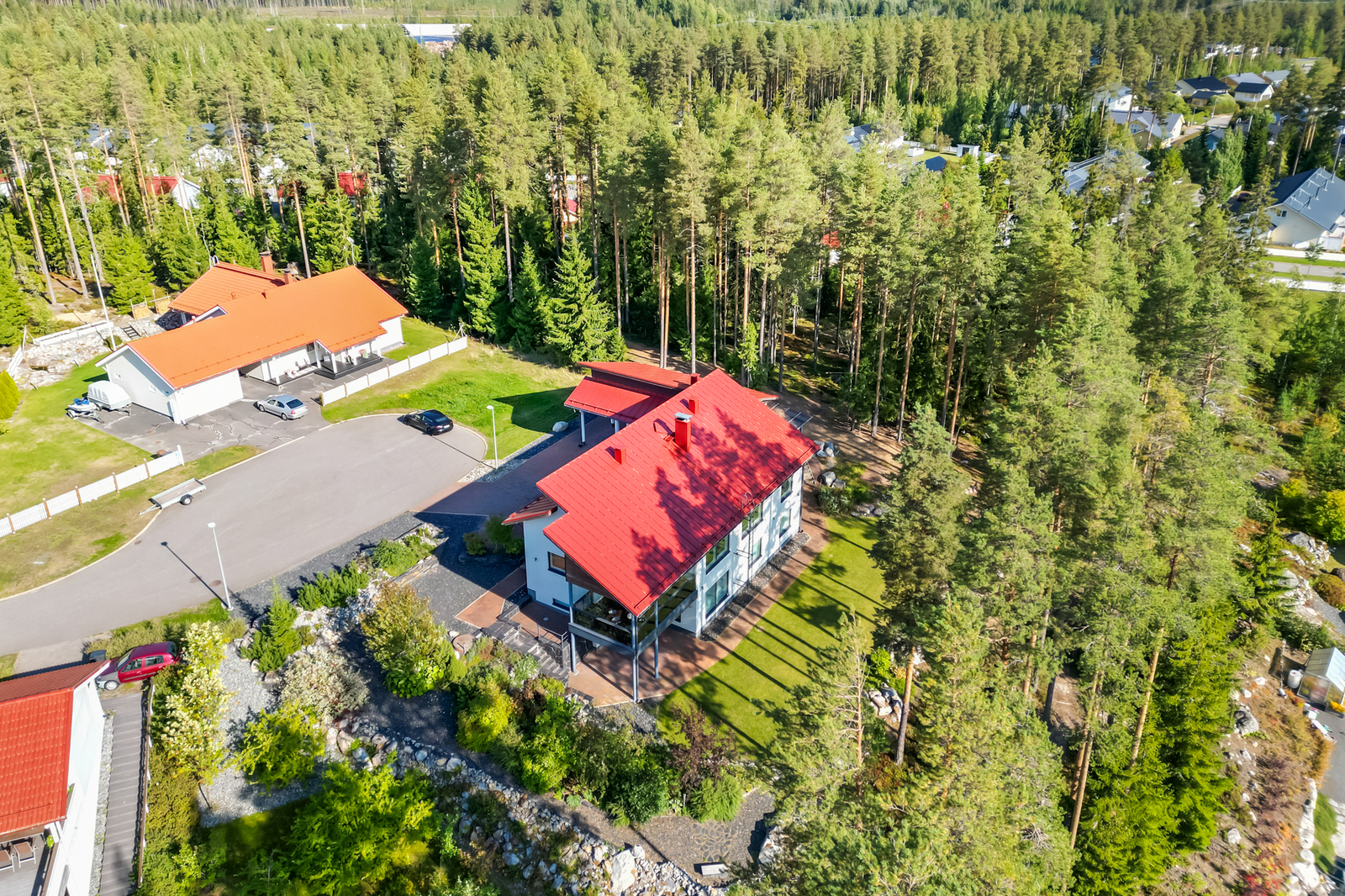 Marjalan korkeimmalla mäellä, päättyvän tien päässä, muita tontteja korkeammalla oleva talo, hyvin hoidetulla tontilla.