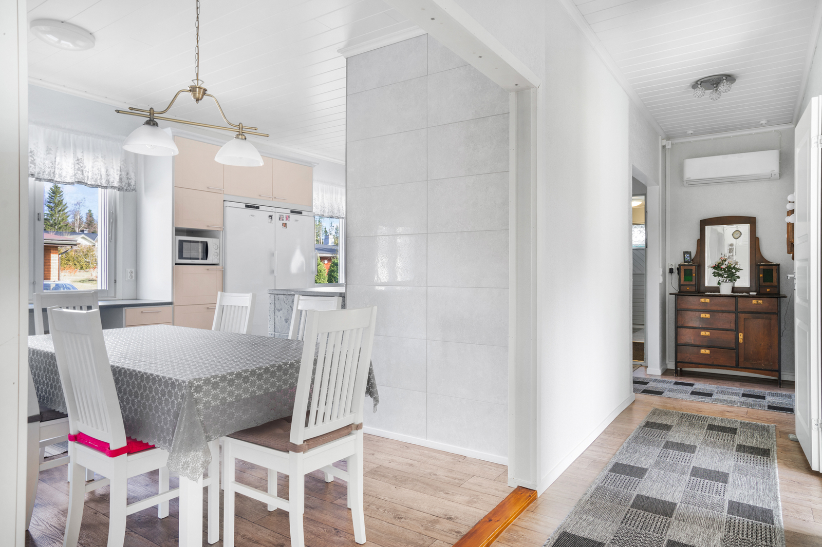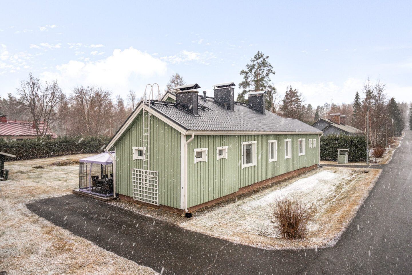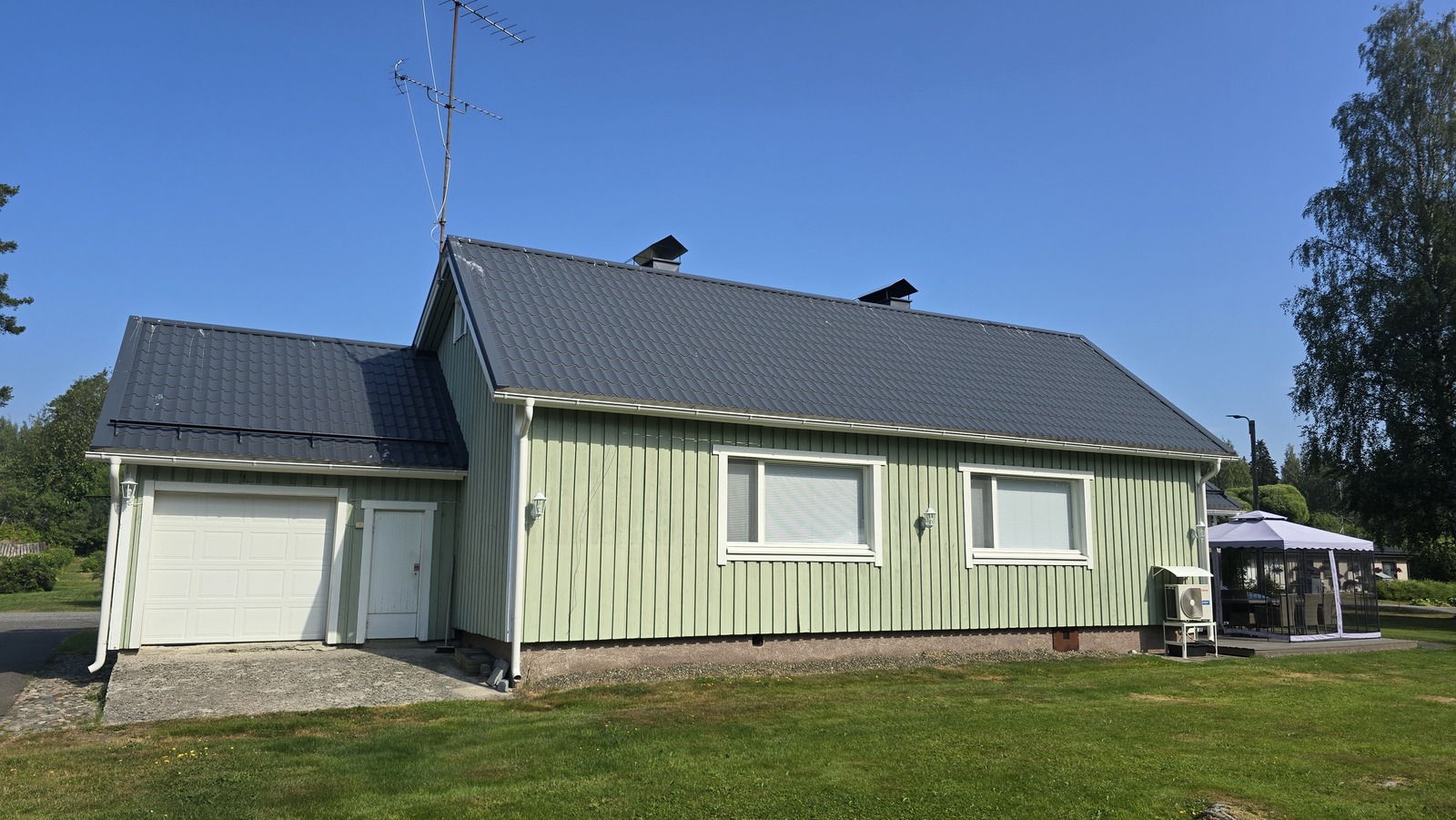 | Tehdyt remontit | 1979 ulkovuoraus uusittu (mahdollisesti myös katto). 1998-1999 talo ja katto maalattu. 2003 olohuoneeseen Kermansaven takka. 2008 wc-remontti, jolloin uusittu viemäriputket kaupungin liittymään asti, wc:n katto, lattiat, kalusteet ja tehty sähkötyöt. 2009 sauna- ja kylpyhuoneremontti; vaihdettu laattalattiat, saunan palomuurin laatoitus uusittu, kph:n laatoitus uusittu, lattialämmitys ja lämminvesivaraaja uusittu. Talon vesikourut ja rännit uusittu. 2010 keittiöremontti; sähkötyöt, kaapistot, uusi Tulikiven uuni, tapetointi, uusi katto ja lattiamaton vaihto. 2011 makuuhuoneremontti (keittiön vieressä) uusittu lattia, seinien koolaus, levytys ja tapetointi, uusi sisäkatto, sähkötyöt. 2013 isoimman makuuhuoneen remontti; uusittu lattia, seinien koolaus ja levytys, tapetointi, uusi sisäkatto, ikkunan vaihto, liukuovi, kaapistot, sähkötyöt. Käytäväremontti: uusittu lattia, katto, tapetointi, sähkötyöt. Uusittu olohuoneen ikkuna. 2015 olohuone remontti; uusittu lattia, sisäkatto, sähkötyöt tehty aiemmin, tapetointi. Makuuhuone remontti (olohuoneen vieressä); uusittu lattia, sisäkatto, seinät oikaistu ja tapetoitu, sähköt uusittu aiemmin. 2019 vesikattoremontti (Vesivek) 2021 ilmalämpöpumppu 2023 maakellari purettu pihalta 2024 piipun hatut, valokuidun sisä- ja ulkoyksikön asennus. |