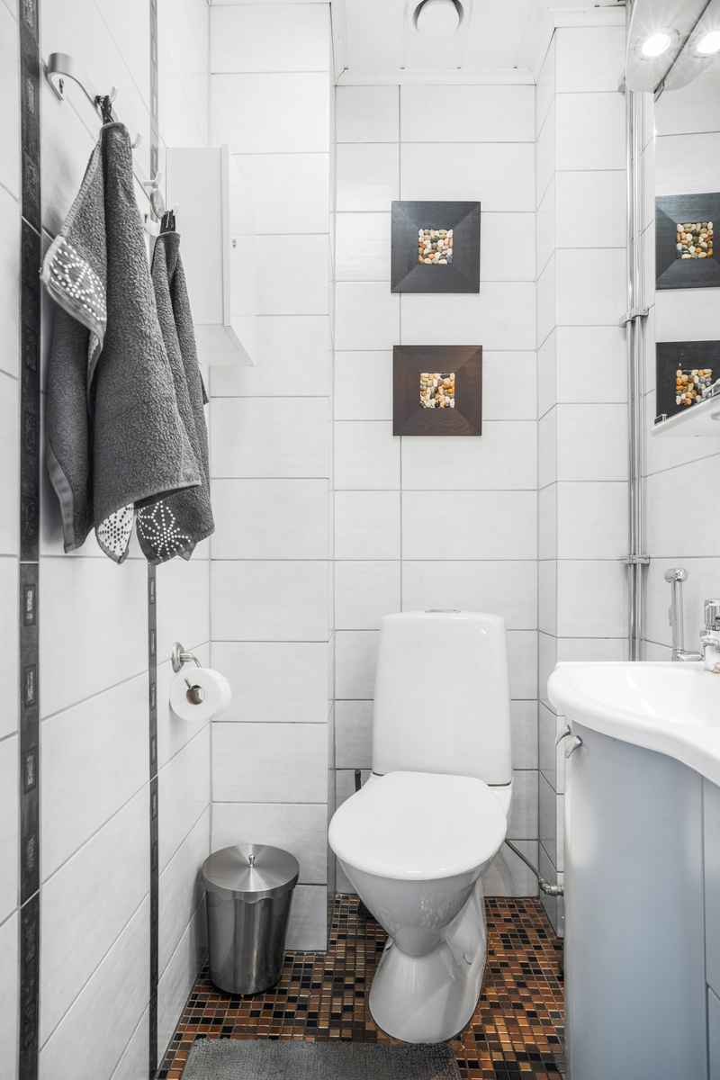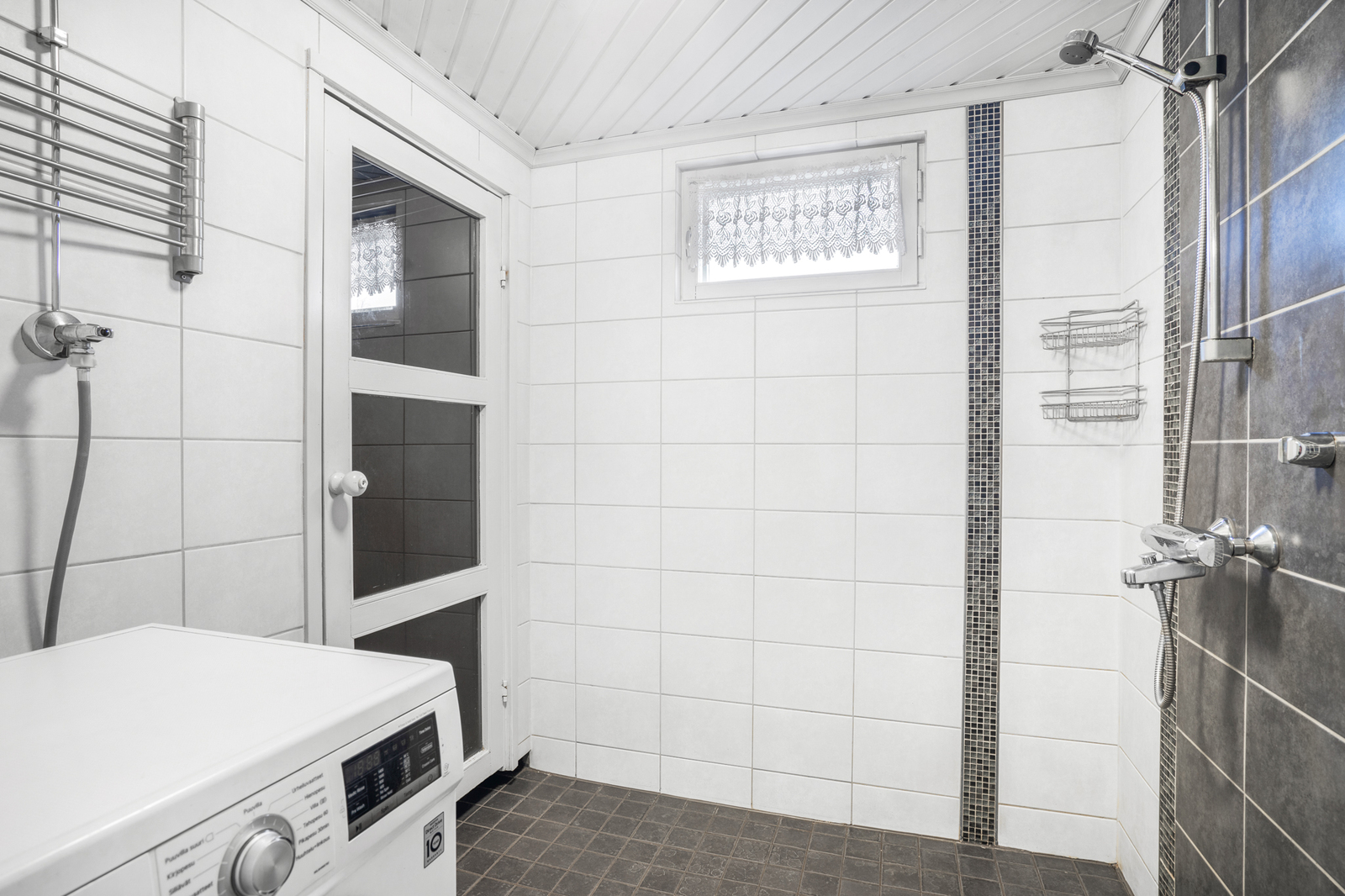 | Kylpyhuoneen kuvaus | Suihku, pesukoneliitäntä, lattialämmitys ja kiinteät valaisimet, seinät (kaakeli), lattiat (laatta) |