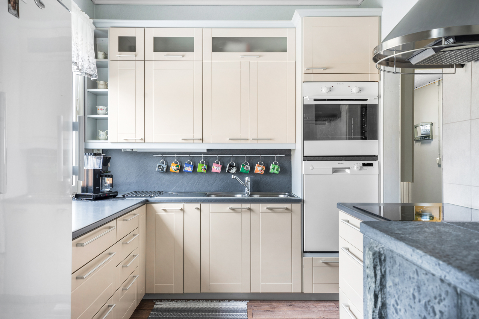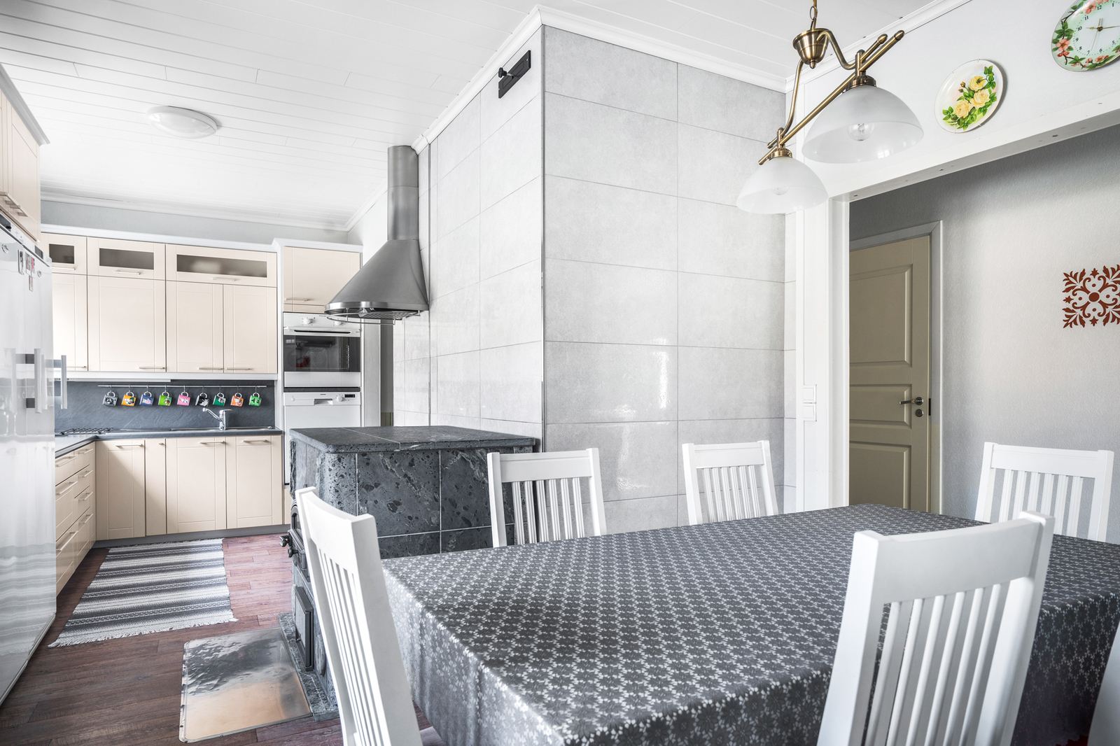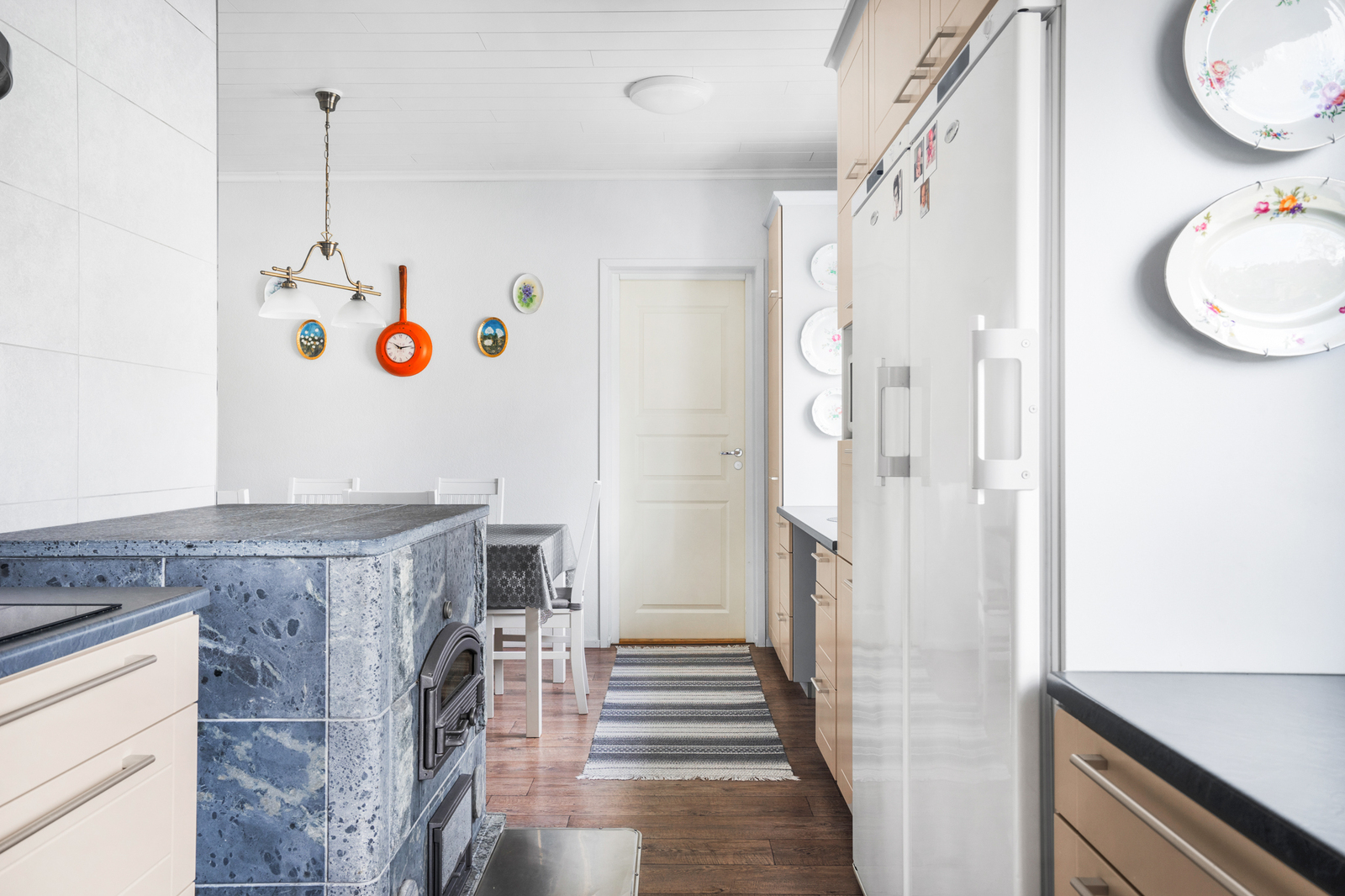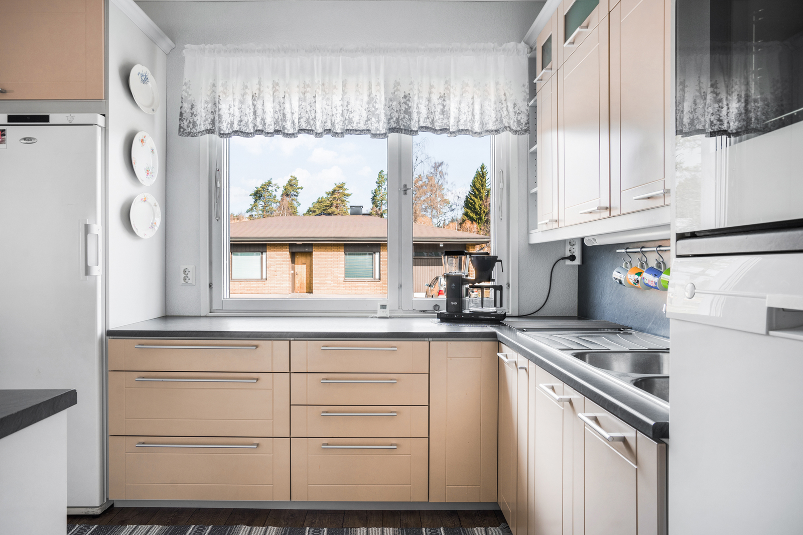 | Keittiön kuvaus | Liesi (Keraaminen liesi ja leivinuuni), työtasot (laminaatti), seinät (maali), lattiat (muovimatto), uuni, astianpesukone, jääkaappi, erillinen pakastin, liesituuletin ja kiinteät valaisimet |