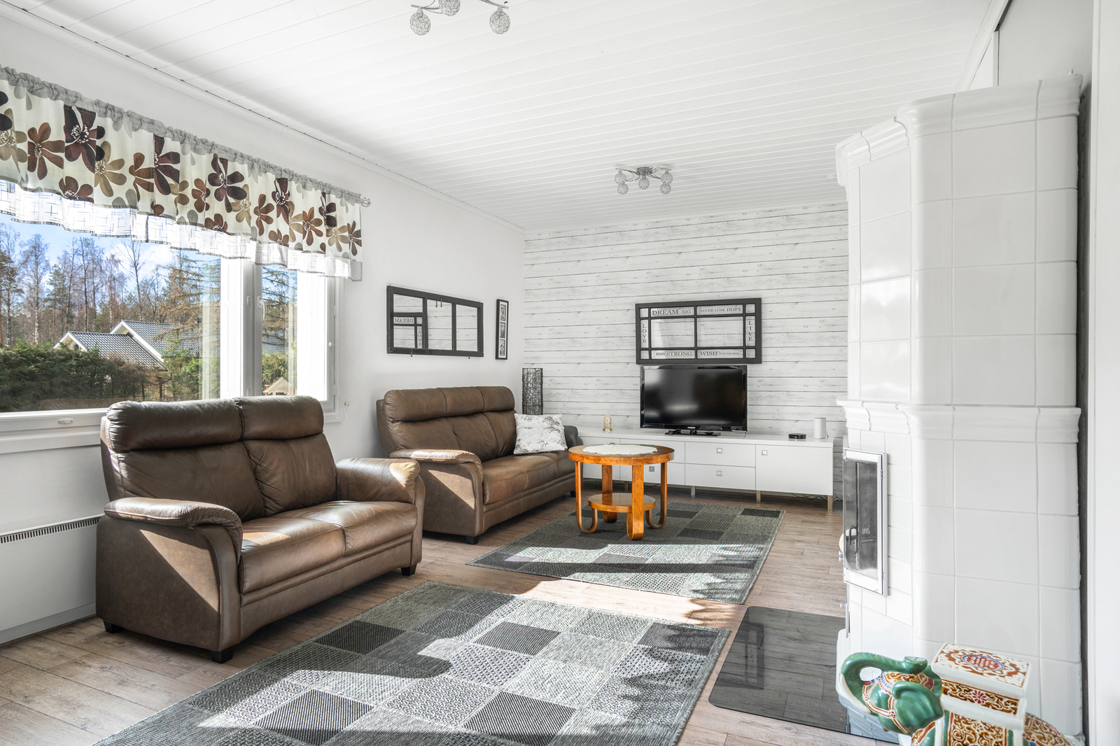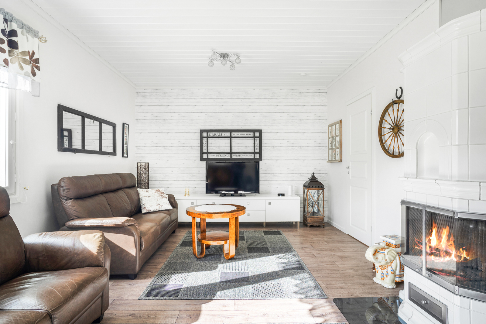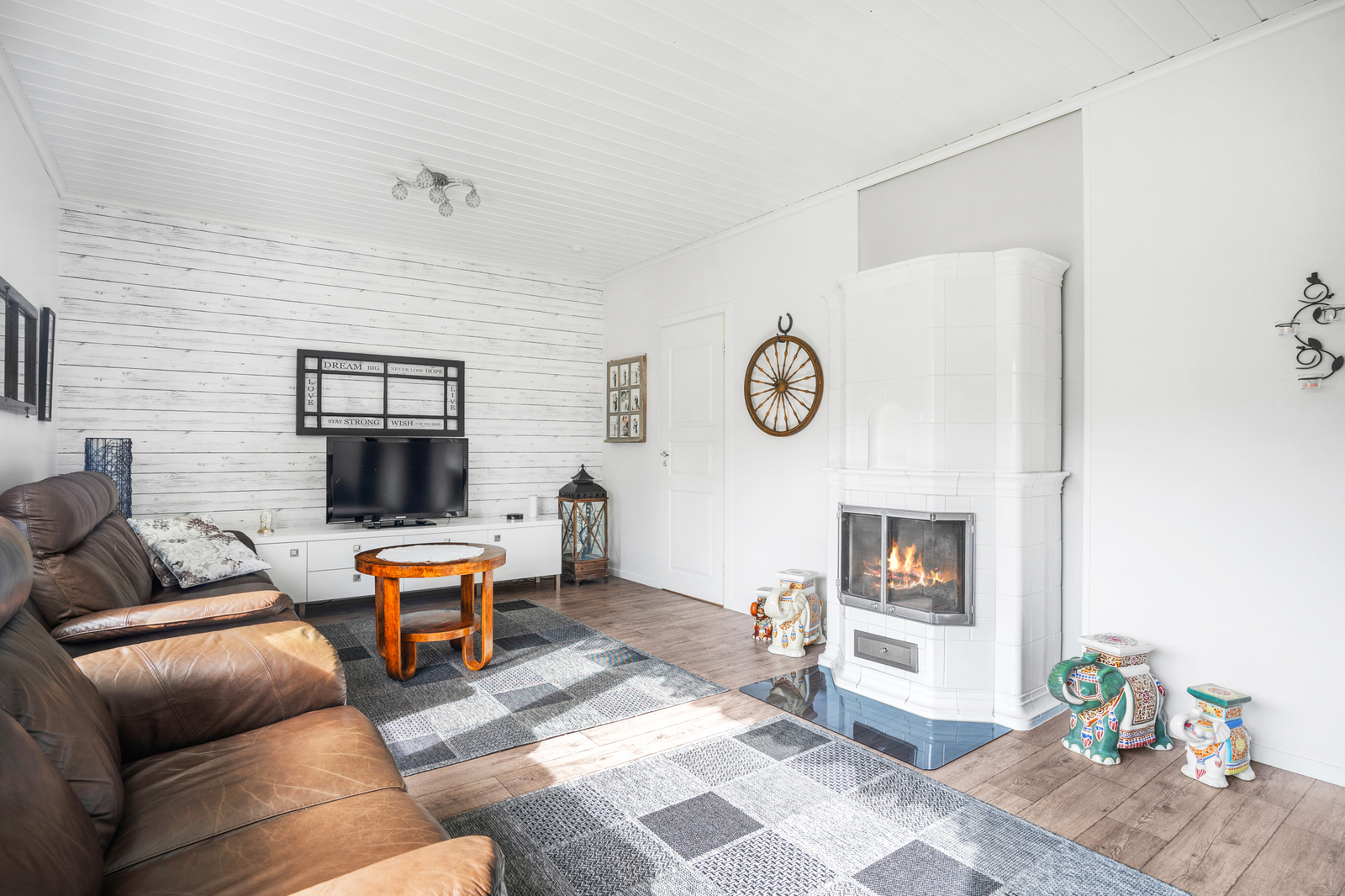 | Olohuoneen kuvaus | Seinät (tapetti), lattiat (muovimatto), Kermansaven takka |