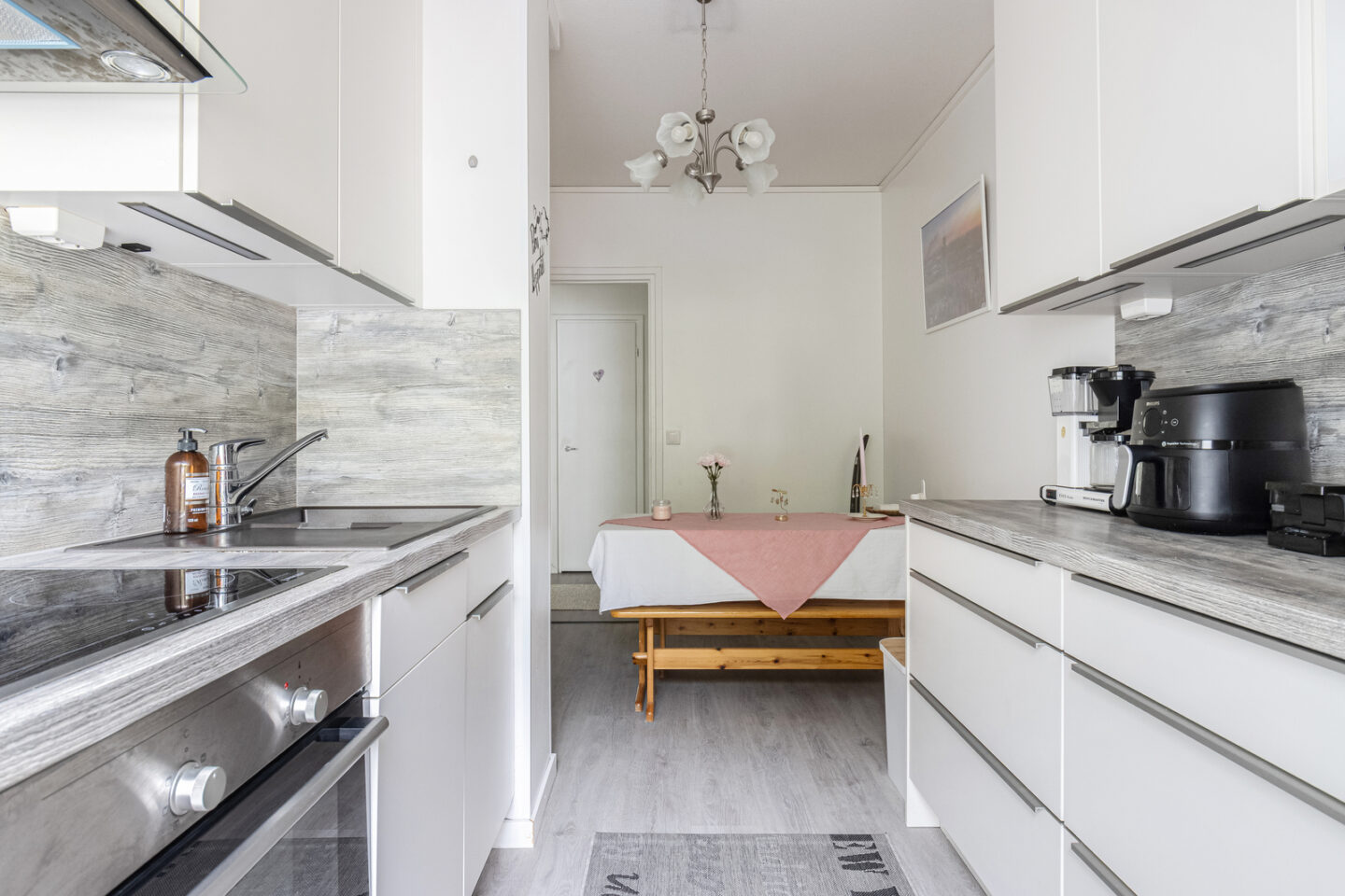 | Keittiön kuvaus | Liesi (Induktioliesi ja erillisuuni), seinät (maali), lattiat (laminaatti), liesi, astianpesukone, erillisuuni, jääkaappipakastin, liesituuletin ja kiinteät valaisimet |