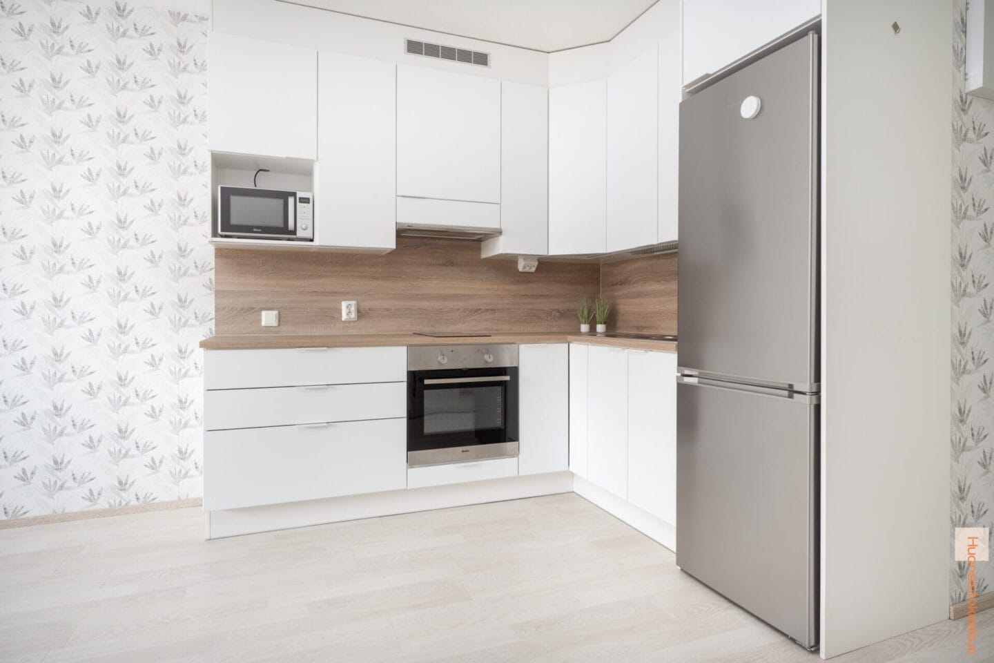 | Keittiön kuvaus | Liesi (Keraaminen liesi), työtasot (laminaatti), seinät (tapetti ja maali), lattiat (laminaatti), jääkaappipakastin, erillisuuni, liesi ja mikroaaltouuni |