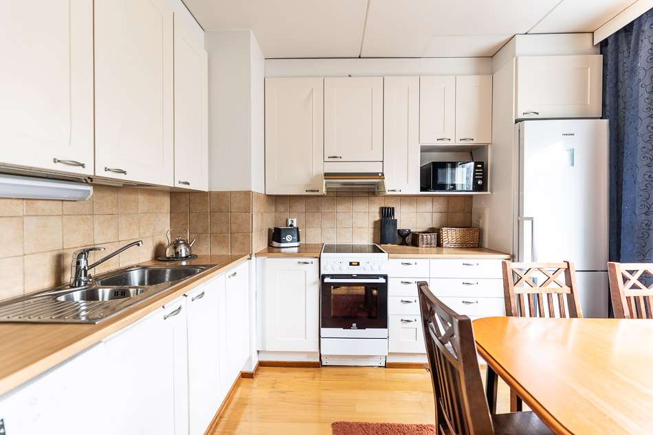 | Keittiön kuvaus | Liesi (Keraaminen liesi), työtasot (laminaatti), seinät (maali), lattiat (parketti), jääkaappipakastin, liesi, liesituuletin ja astianpesukone |