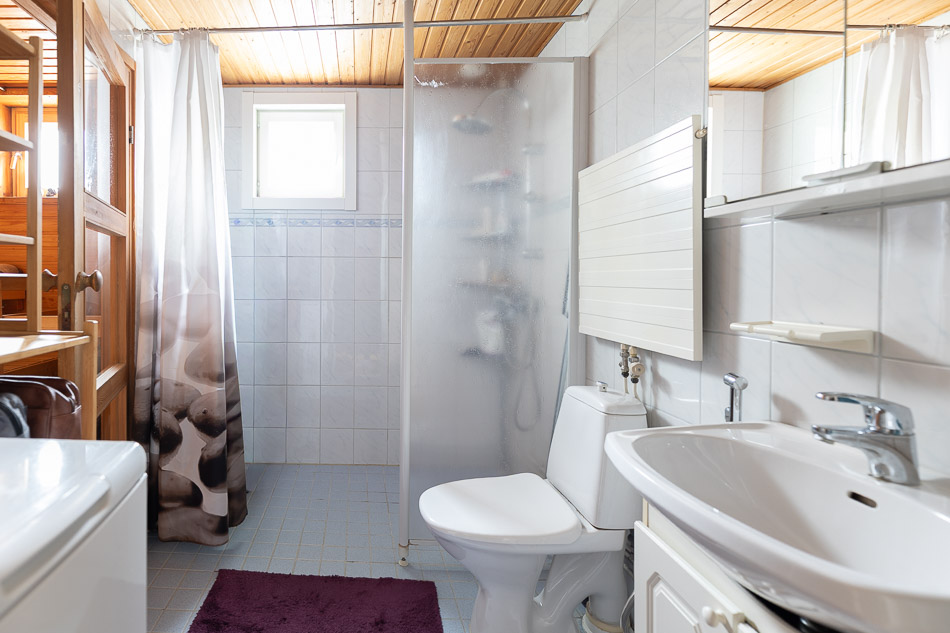 | Kylpyhuoneen kuvaus | WC-istuin, suihku, pesukoneliitäntä, peilikaappi, suihkuseinä, allaskaappi ja bidee-suihku, seinät (kaakeli), lattiat (laatta) |