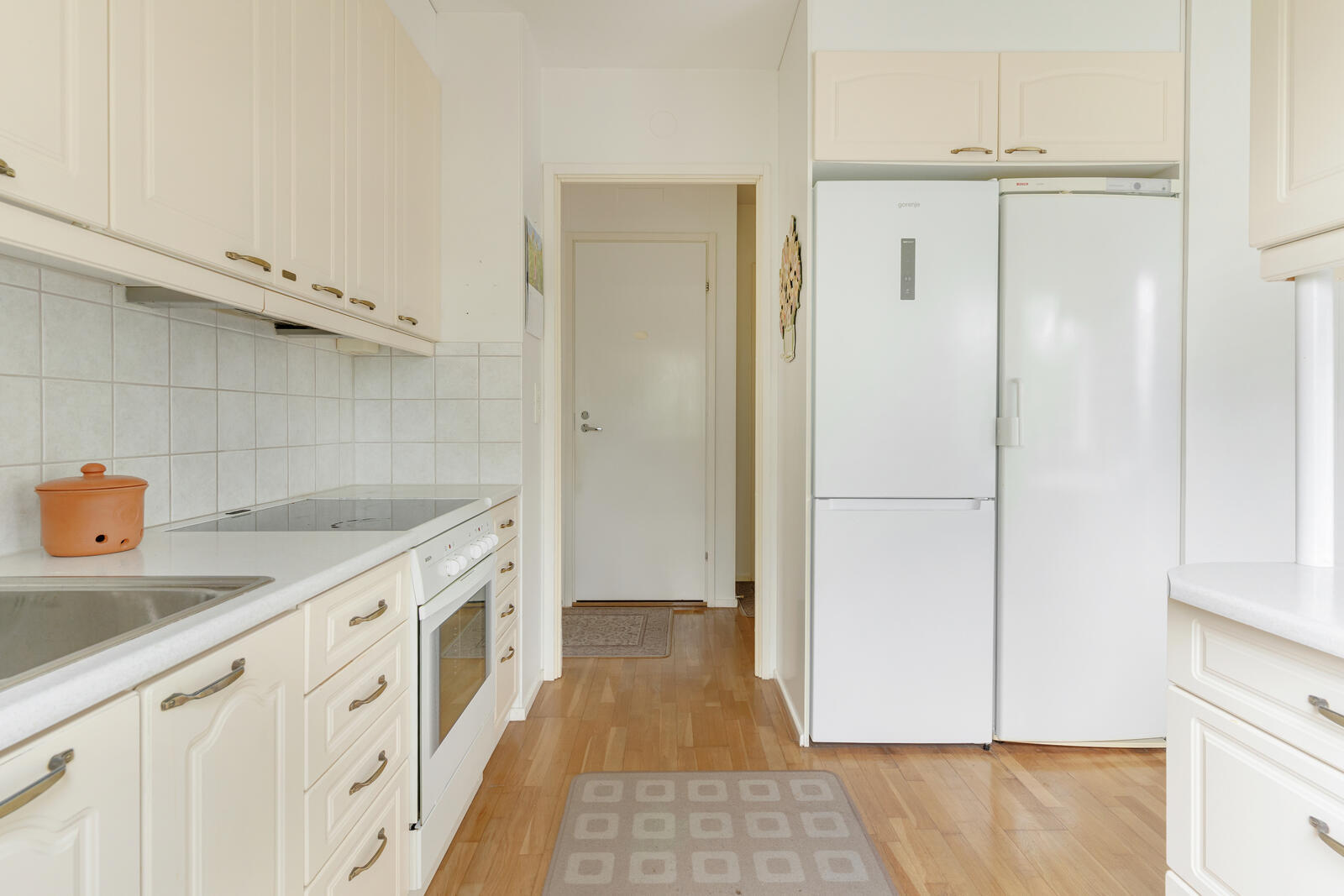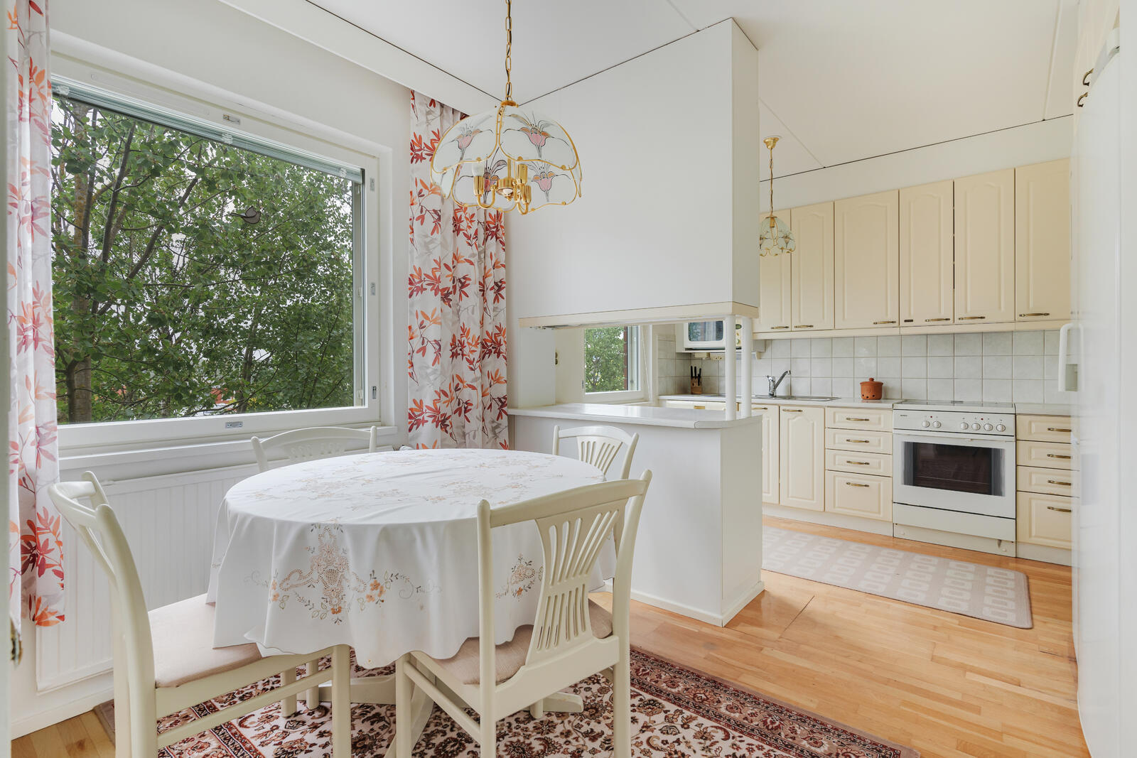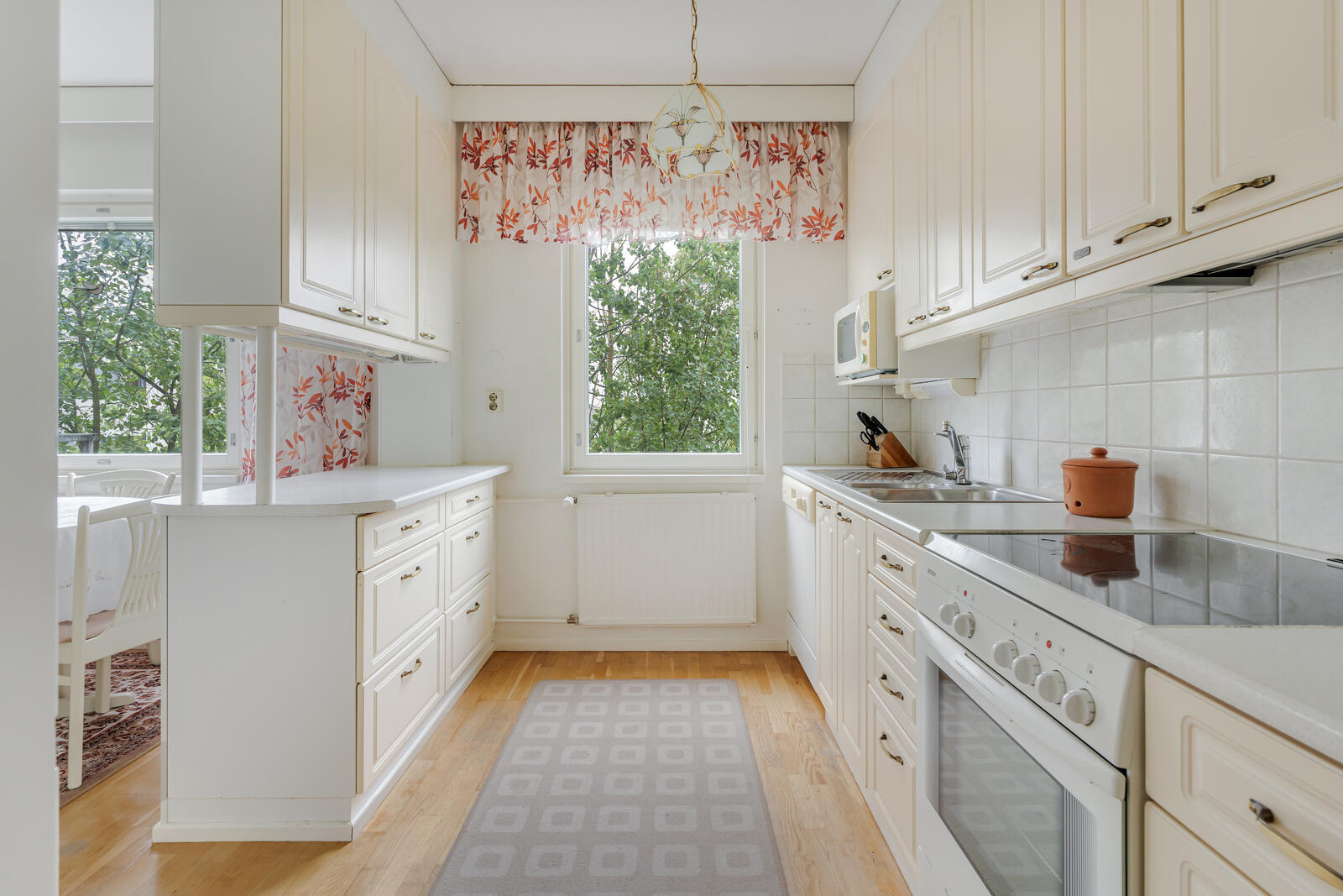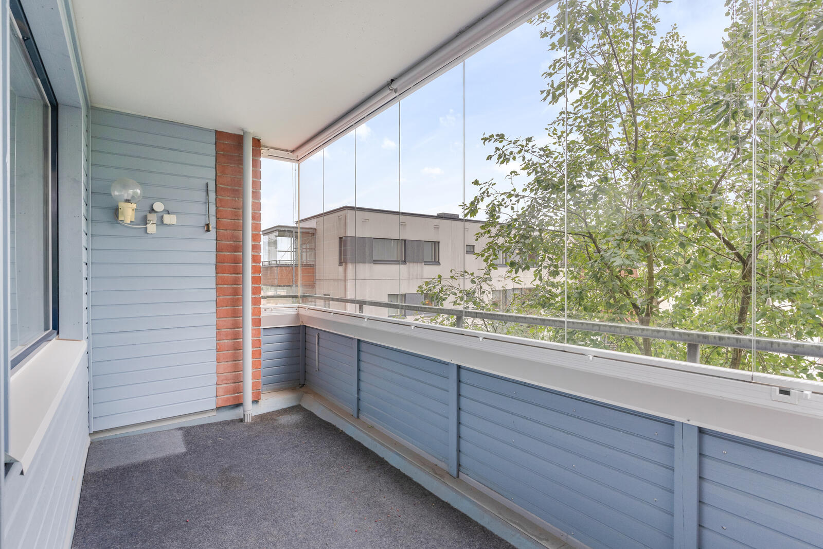 Hyvä pohjaratkaisu, tilavat ja valoisat huoneet sekä erillinen keittiö, jonka yhteydessä myös ruokailutila. Lisämukavuutta tuo lasitettu parveke vehrein näkymin.