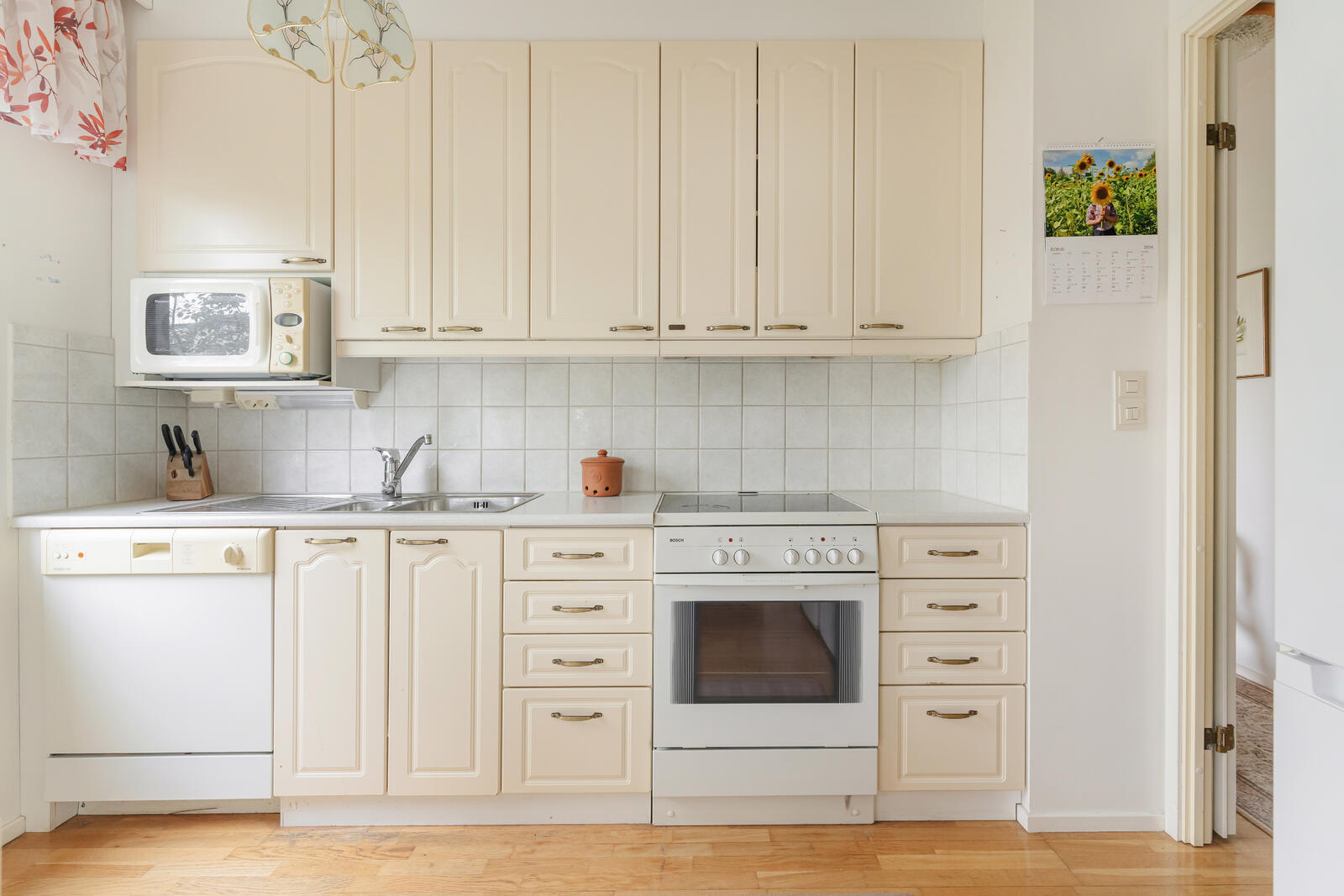 | Keittiön kuvaus | Työtasot (laminaatti), seinät (maali), lattiat (parketti), liesituuletin, jääkaappi, jääkaappipakastin ja astianpesukone, perinteinen liesi, vaaleat kaapistot |
