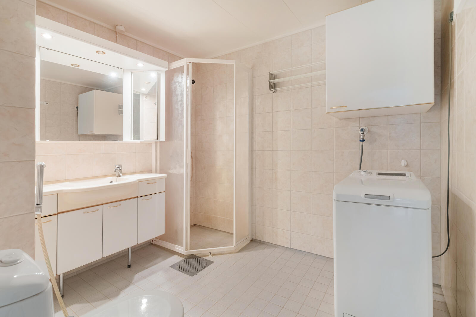 | Kylpyhuoneen kuvaus | Suihku, wc-istuin, peilikaappi, pesukoneliitäntä, suihkuseinä ja allaskaappi, seinät (kaakeli), lattiat (laatta) |