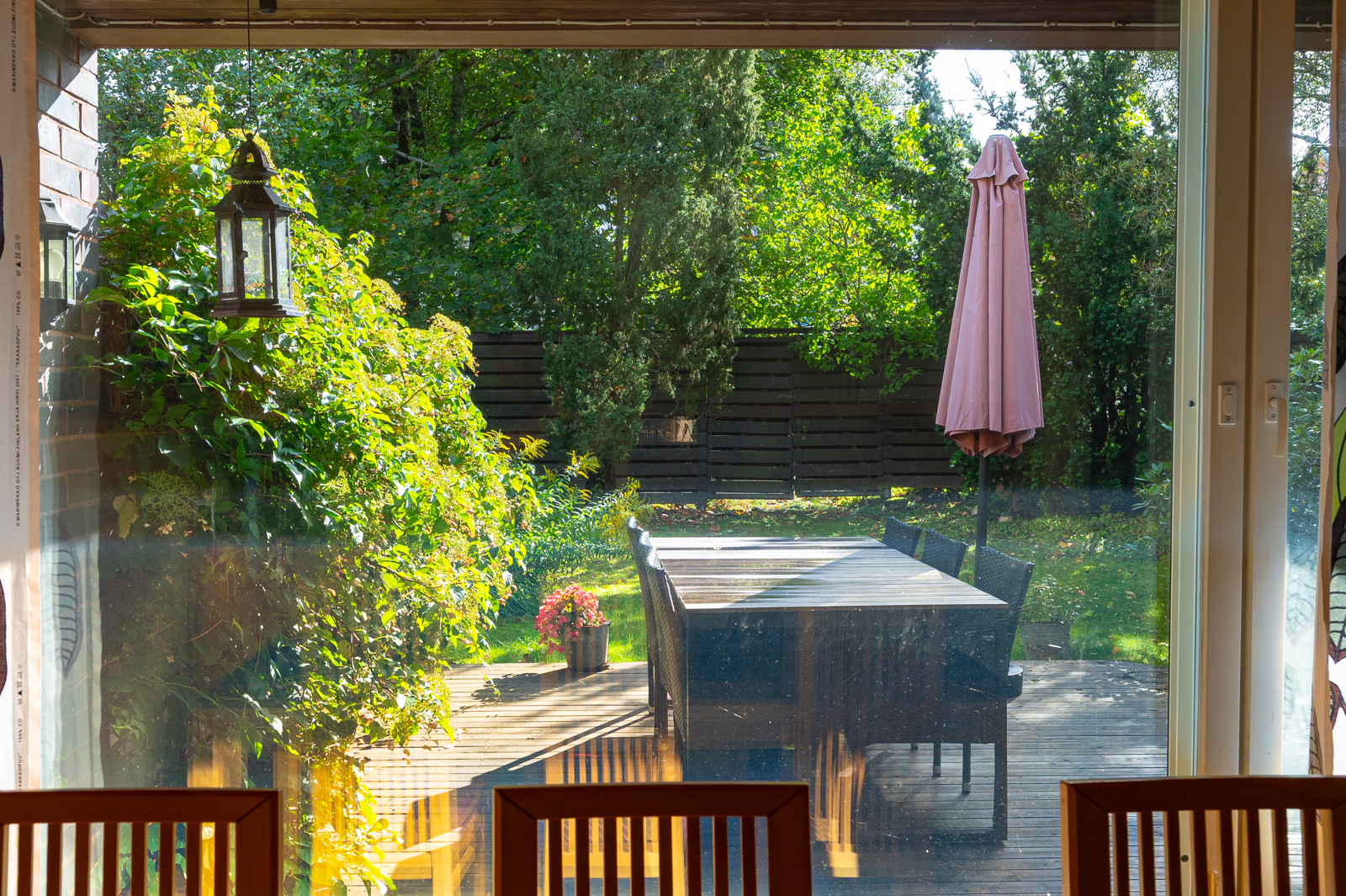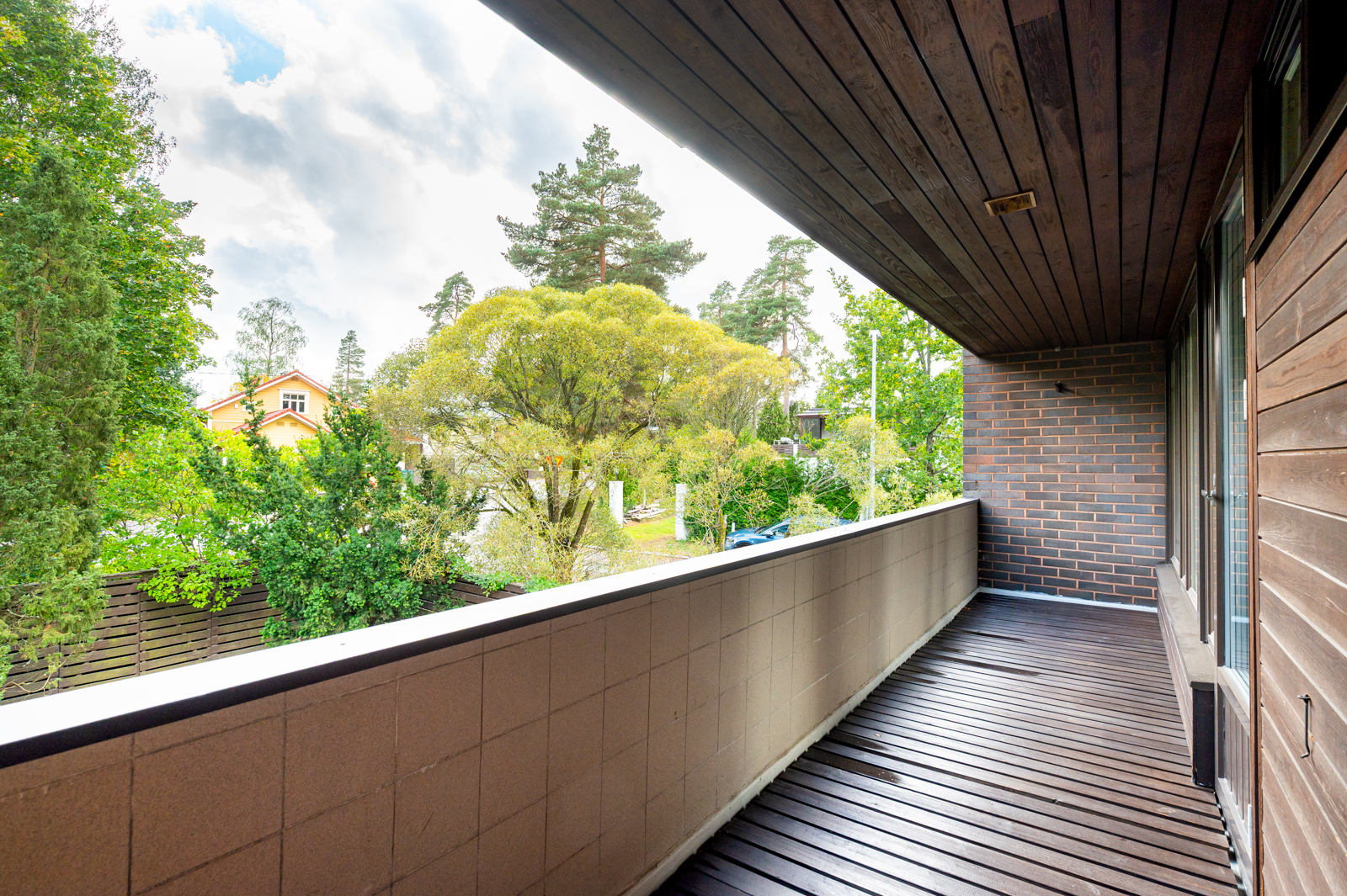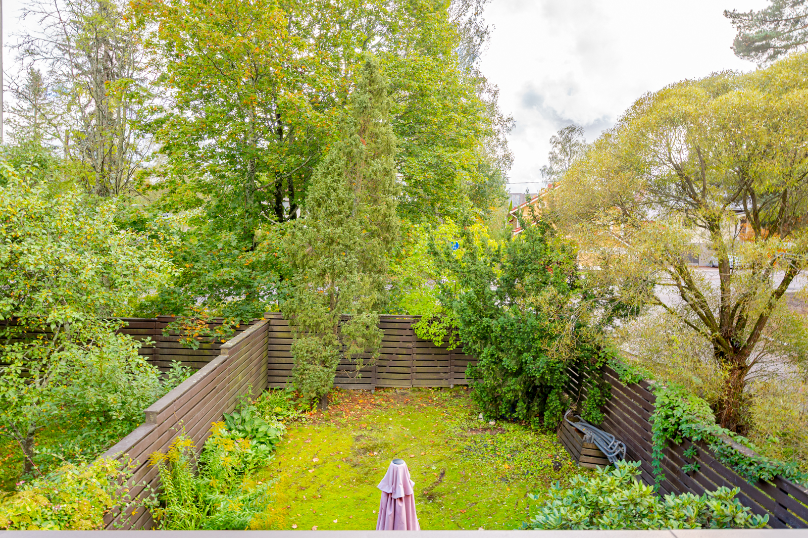 Suurista ikkunoista ja koko huoneiston levyiseltä parvekkeelta avautuu vehreä näkymä omalle pihalle, ja olohuoneen sekä ruokailutilan yhtenäisyys luo avaraa tunnelmaa. Yläkerran takkahuone on viihtyisä: tilaa rytmittää kaunis tiilitakka ja valoa tulvii sisään kattoikkunasta. Huone soveltuu mainiosti vaikka työtilaksi, kirjastoksi tai oleskeluhuoneeksi.