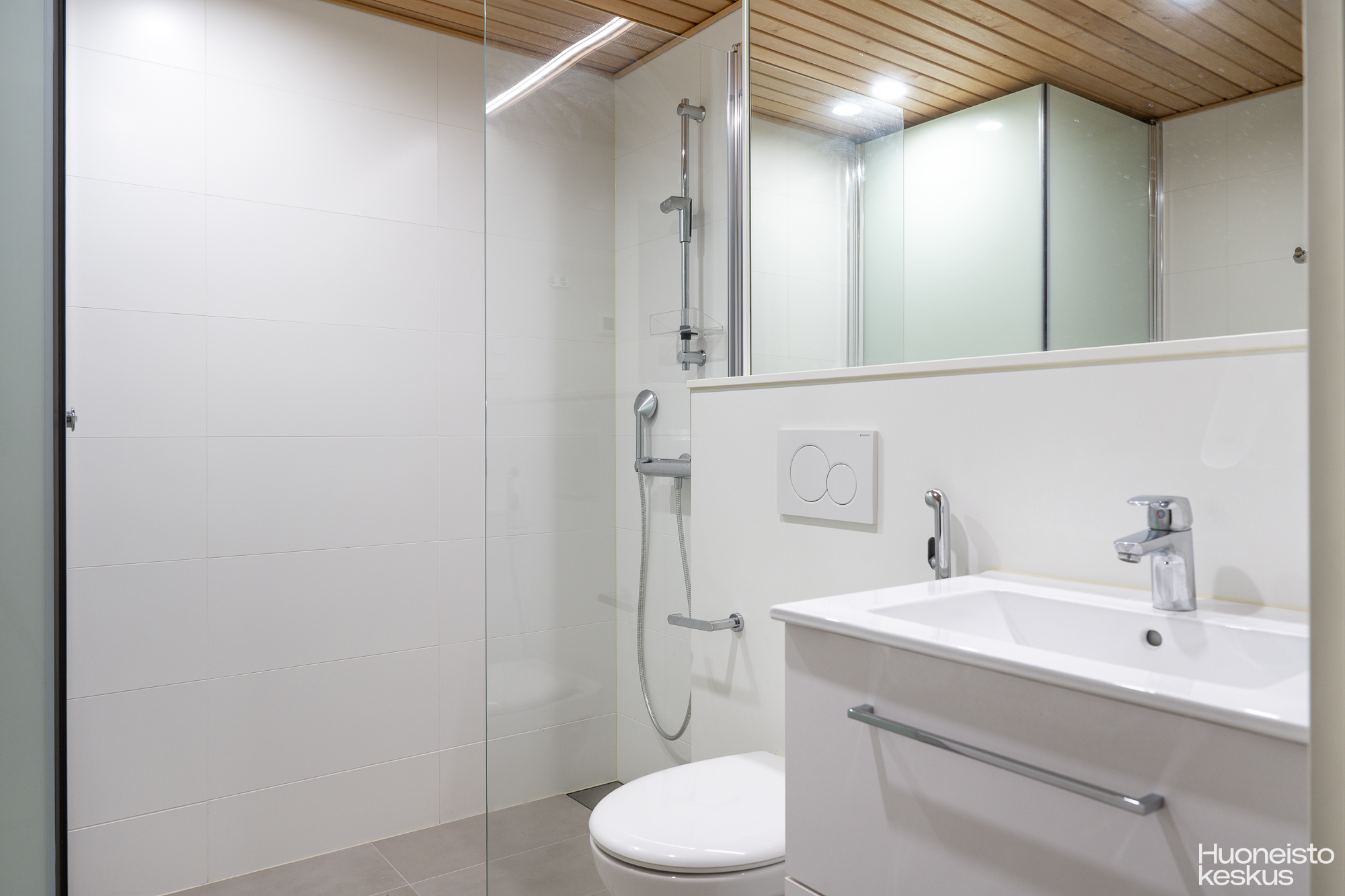 WC-istuin, suihku, suihkuseinä, pesukoneliitäntä, lattialämmitys, peili, pesuallas ja allaskaappi, seinät (kaakeli), lattiat (laatta) |