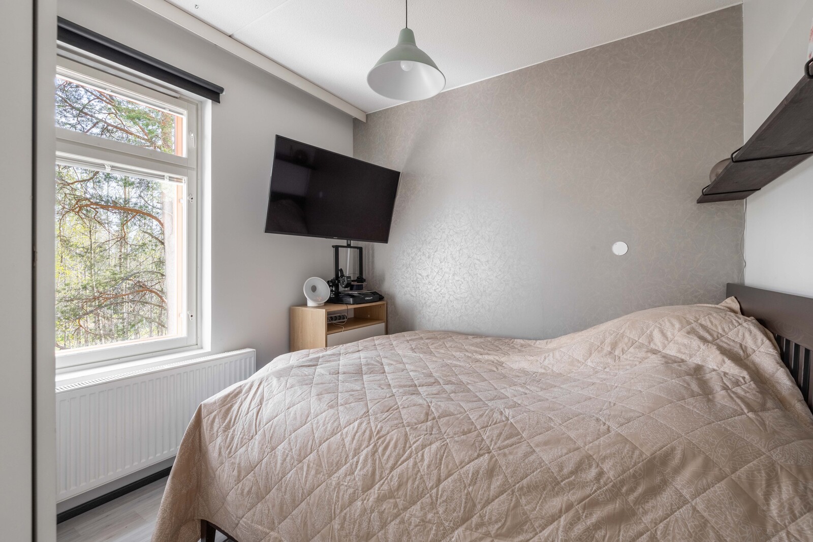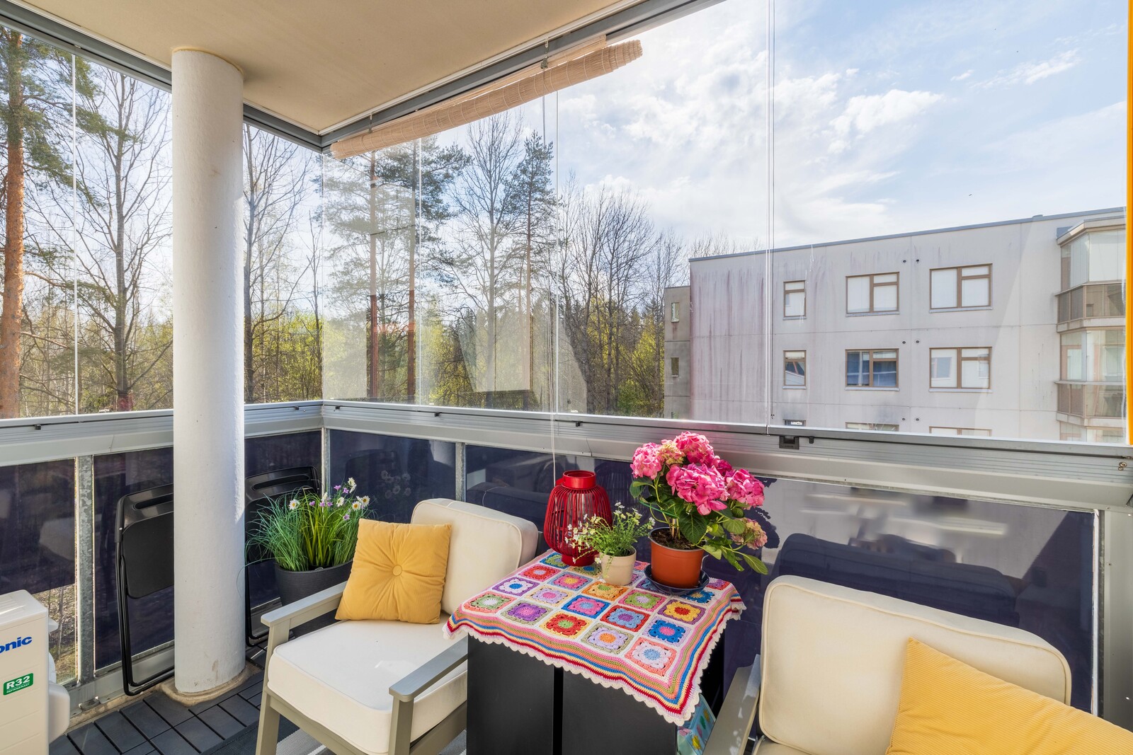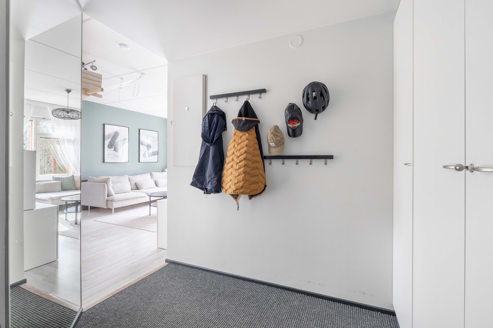 Asunnon sydän on avara eteinen, joka toivottaa tulijat lämpimästi tervetulleiksi ja tarjoaa runsaasti säilytystilaa. Selkeä ja käytännöllinen pohjaratkaisu tekee arjesta sujuvaa, ja tilavat huoneet luovat harmonisen kokonaisuuden. Olohuoneesta on käynti lasitetulle parvekkeelle, josta avautuvat rauhalliset ja vehreät näkymät.