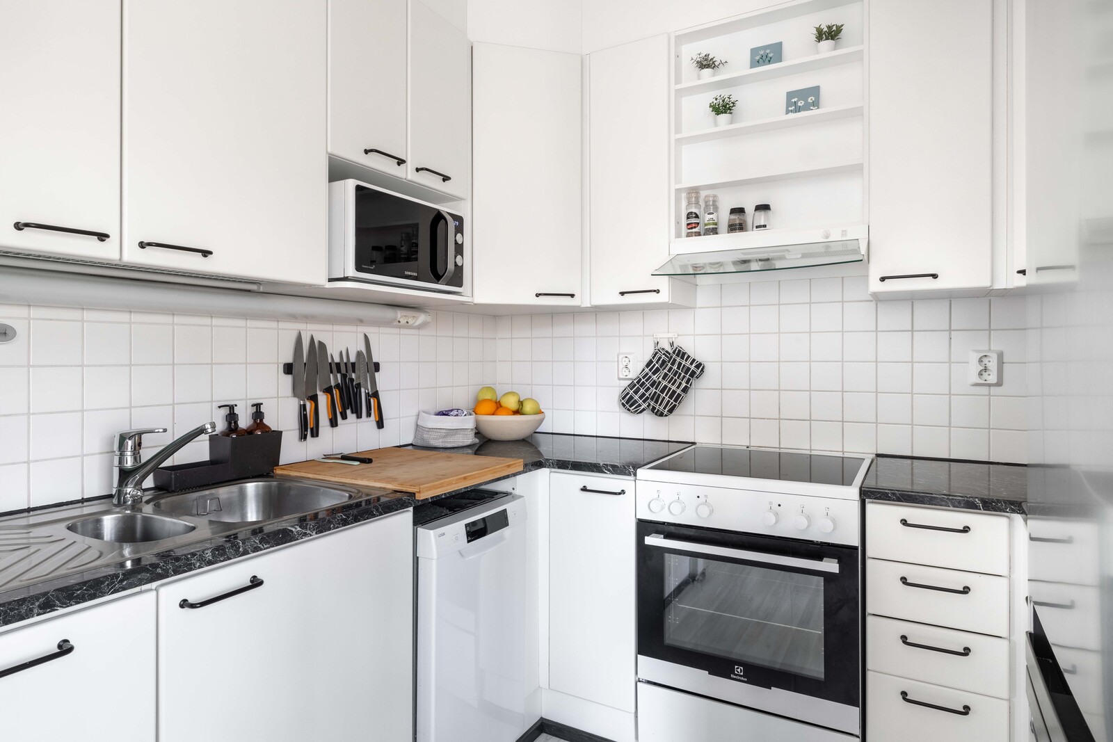 Keittiö on suunniteltu arjen tarpeisiin – hyvin säilytys- ja laskutilaa sekä tilaa ruokailuryhmälle. Makuuhuoneet ovat reilun kokoisia, ja koko asunnon neutraali värimaailma luo ajattoman ja rauhallisen tunnelman.
