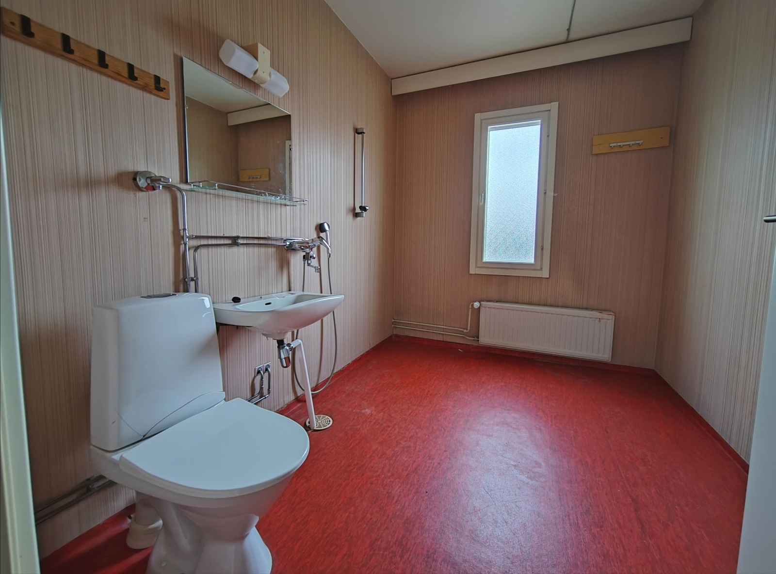 | Kylpyhuoneen kuvaus | Allaskaappi, wc-istuin ja suihku, seinät (muovimatto), lattiat (muovimatto) |