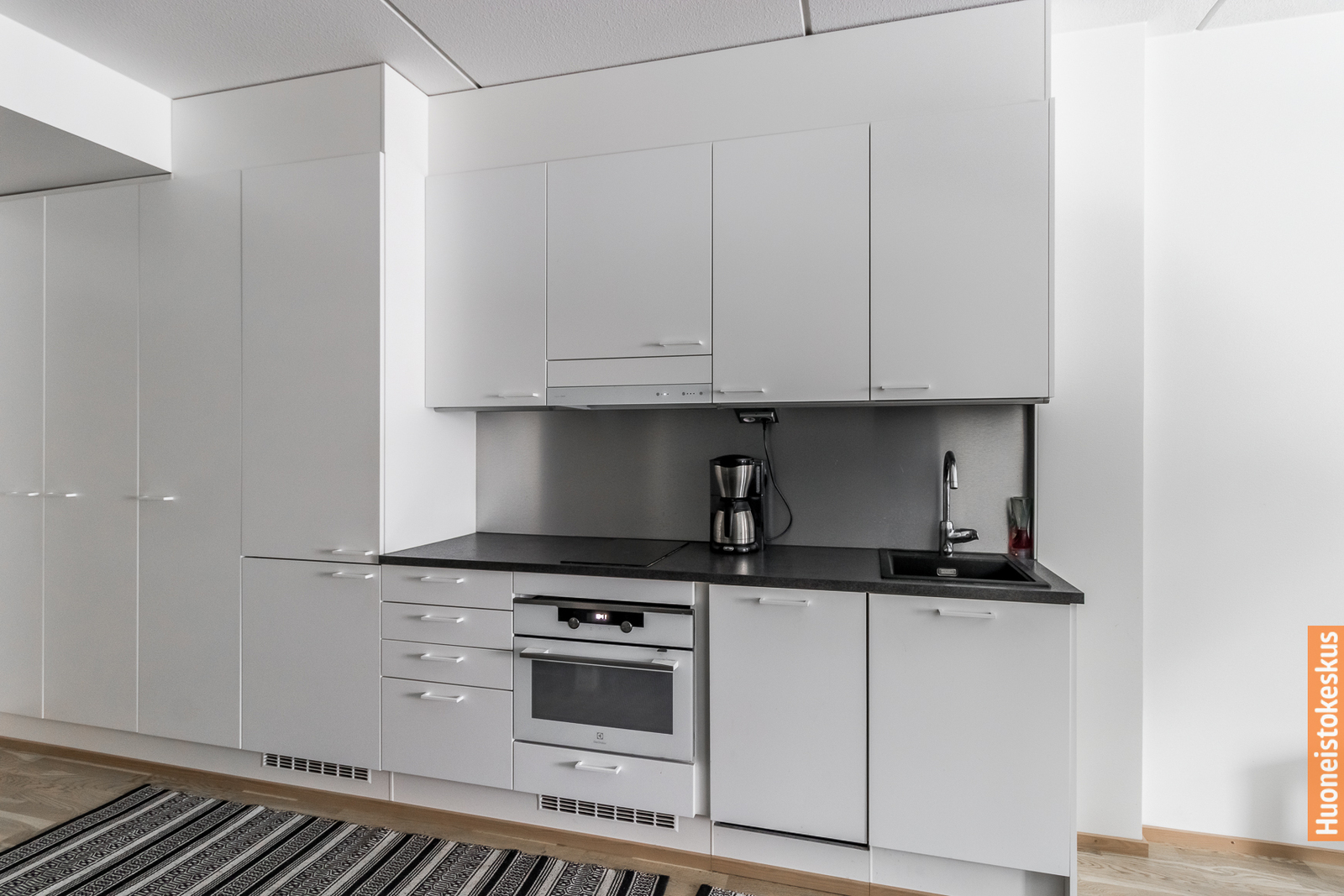Työtasot (laminaatti), seinät (maali), lattiat (parketti), astianpesukone, erillisuuni, jääkaappipakastin, liesituuletin ja kiinteät valaisimet, liesitaso |