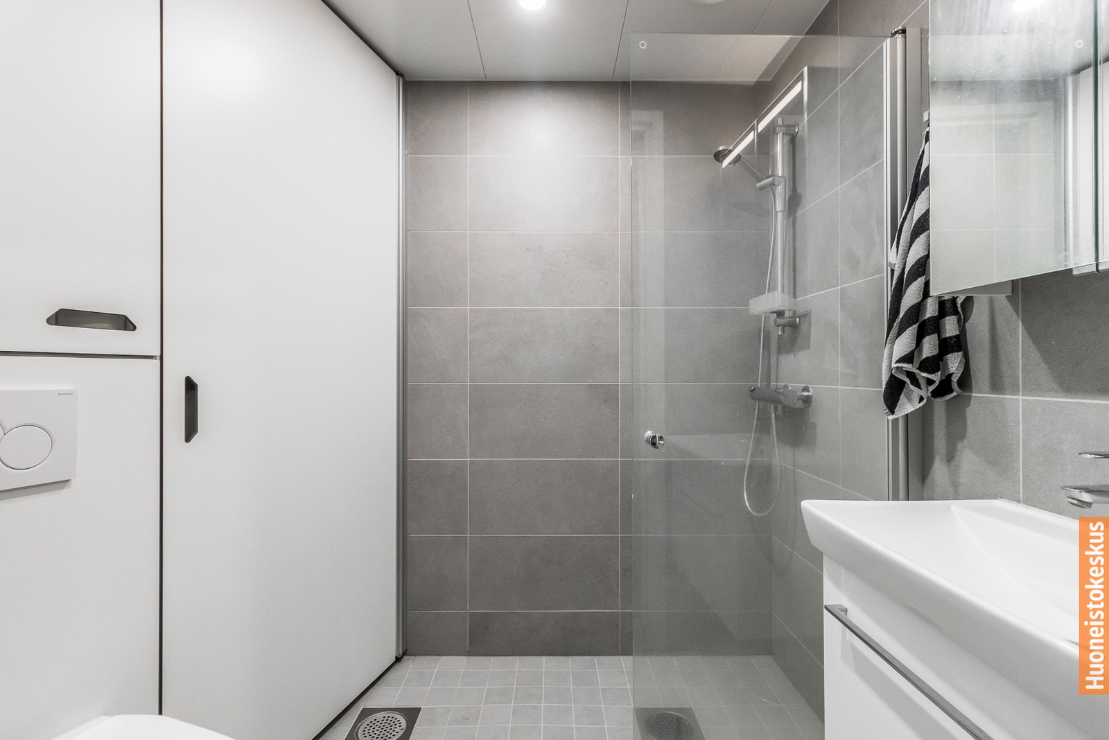 Lattialämmitys, peilikaappi, pesukoneliitäntä, suihku, suihkuseinä, wc-istuin ja kiinteät valaisimet, seinät (kaakeli), lattiat (laatta) |