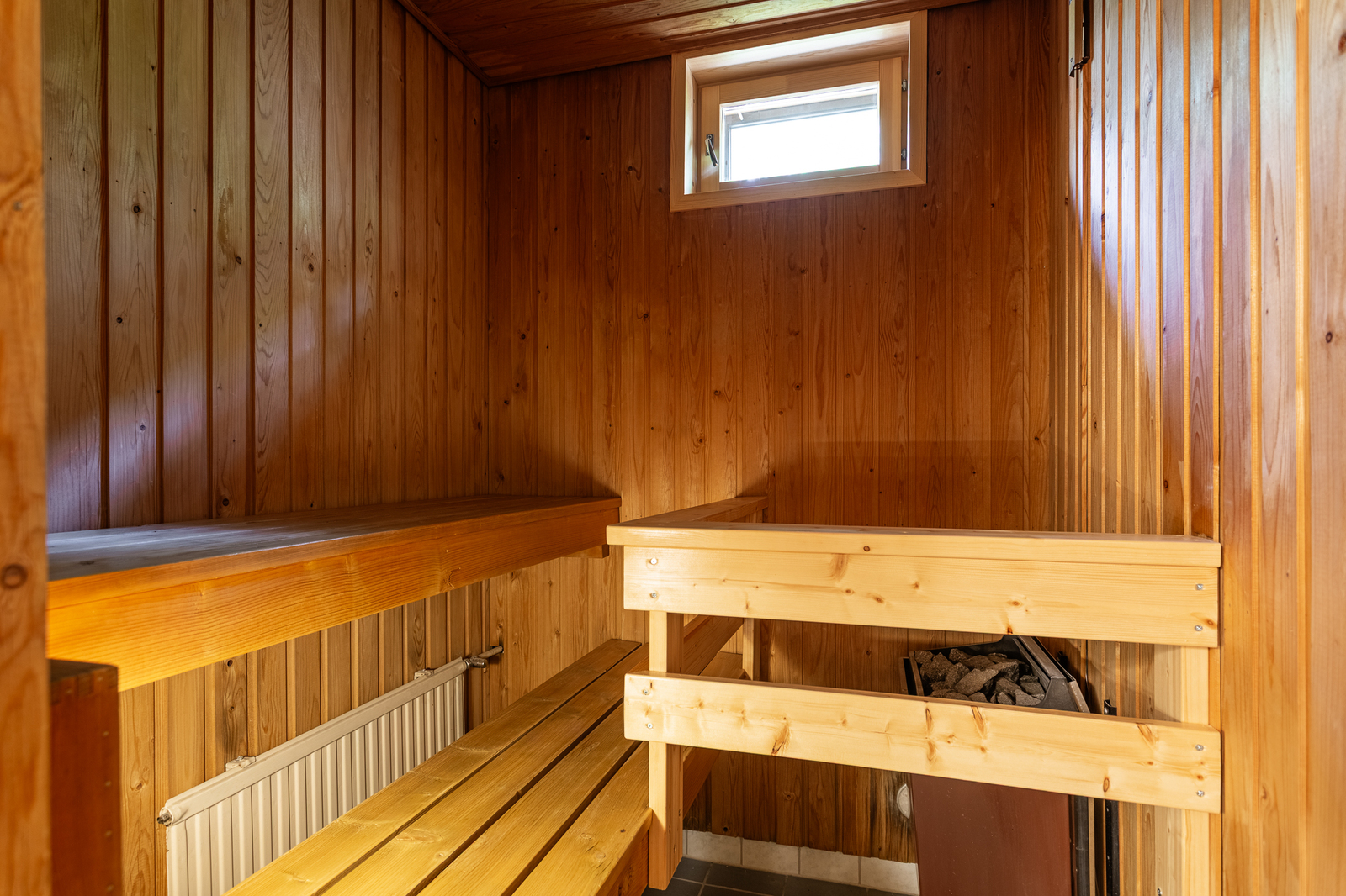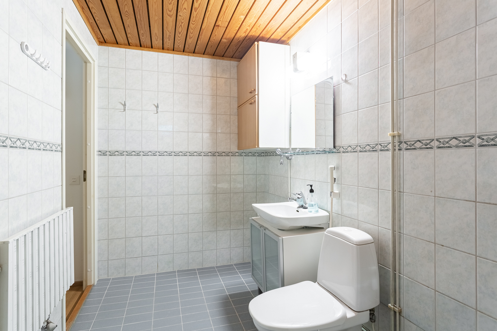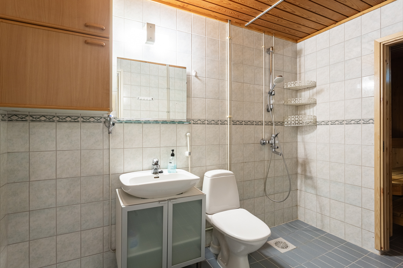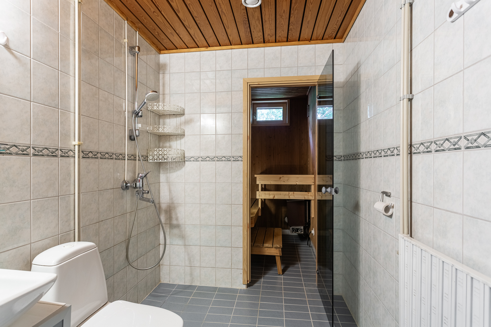 Kylpyhuone on laatoitettu ja sinne mahtuu mainiosti pyykkikone ja mukavana lisänä oma ikkunallinen sauna.