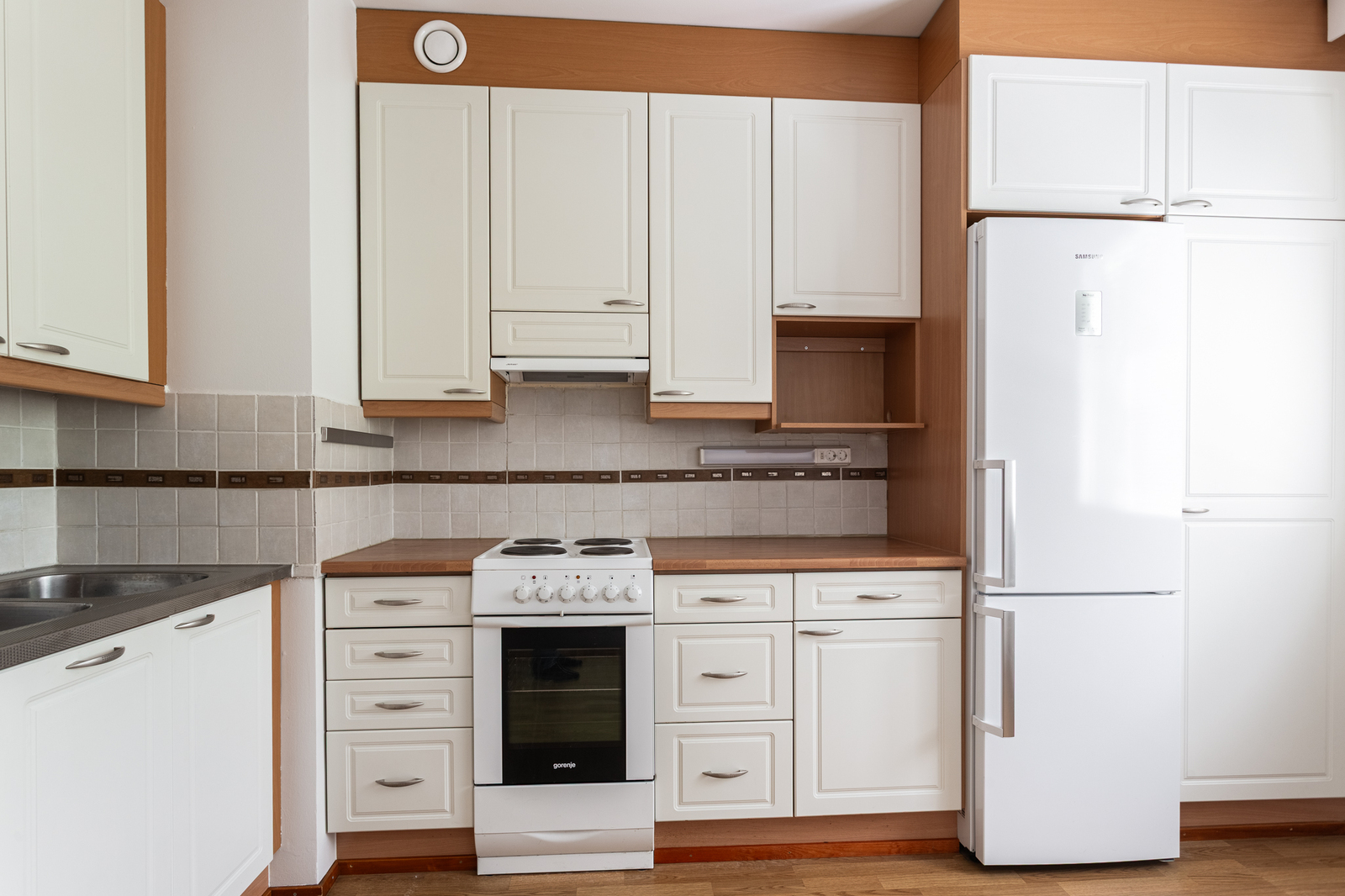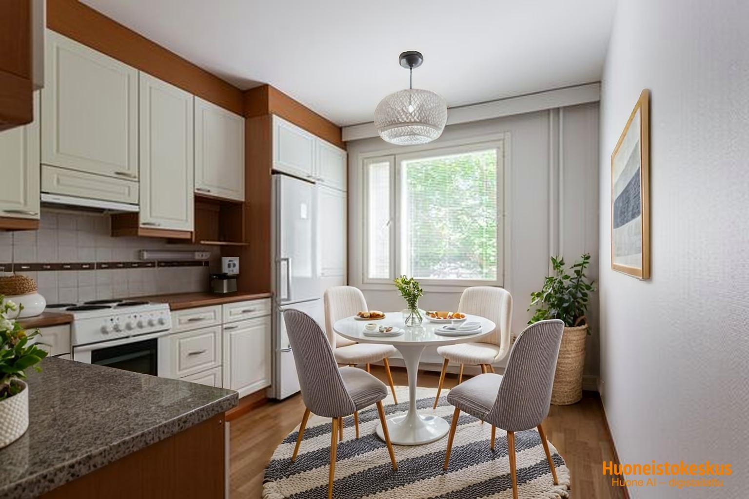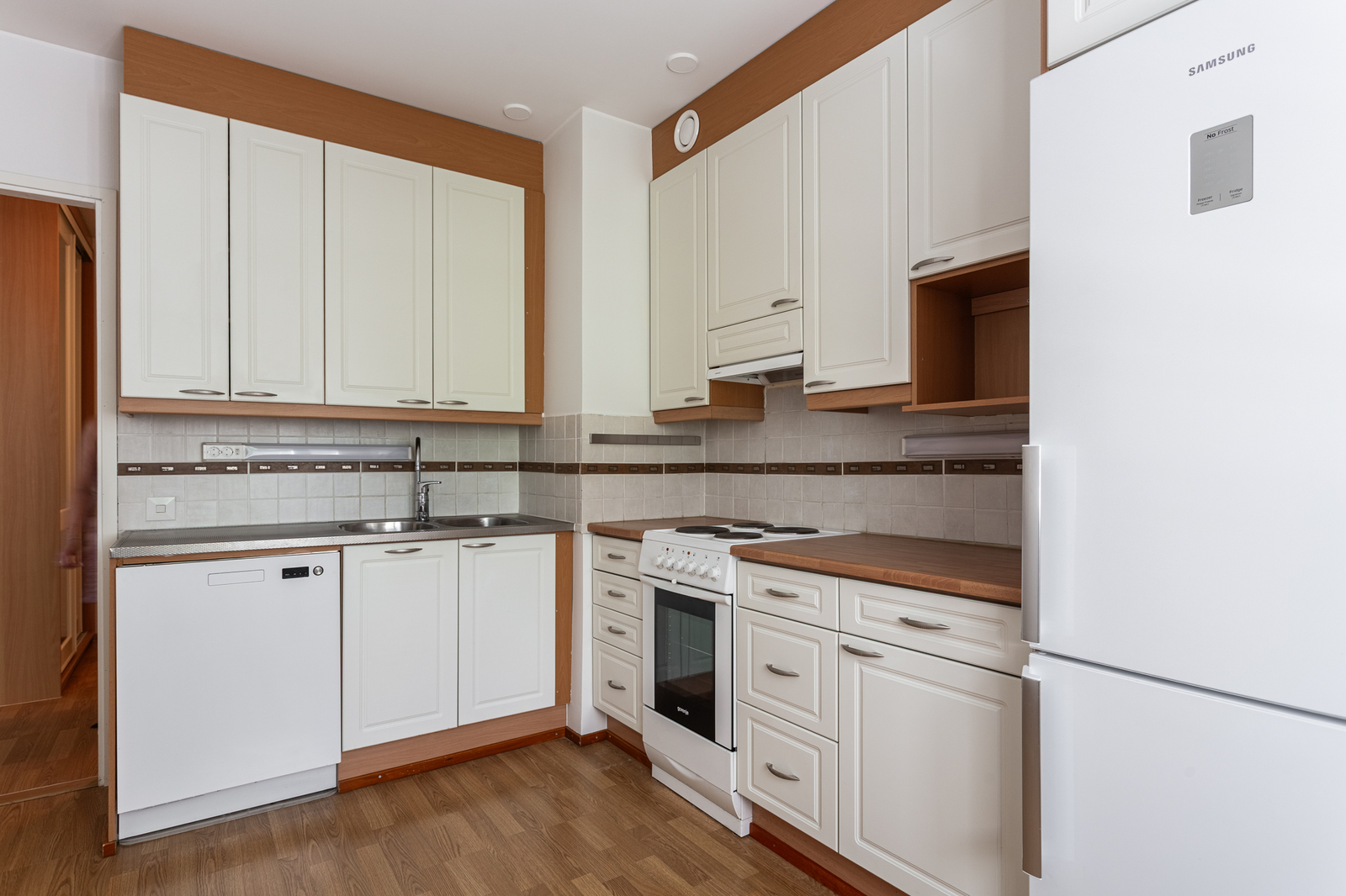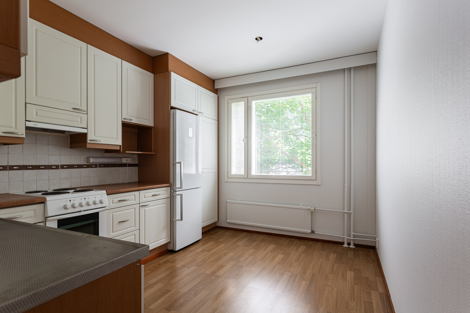 | Keittiön kuvaus | Liesi (sähköliesi), työtasot (laminaatti), seinät (maali), lattiat (laminaatti), liesituuletin, liesi, jääkaappipakastin, astianpesukone ja kiinteät valaisimet |