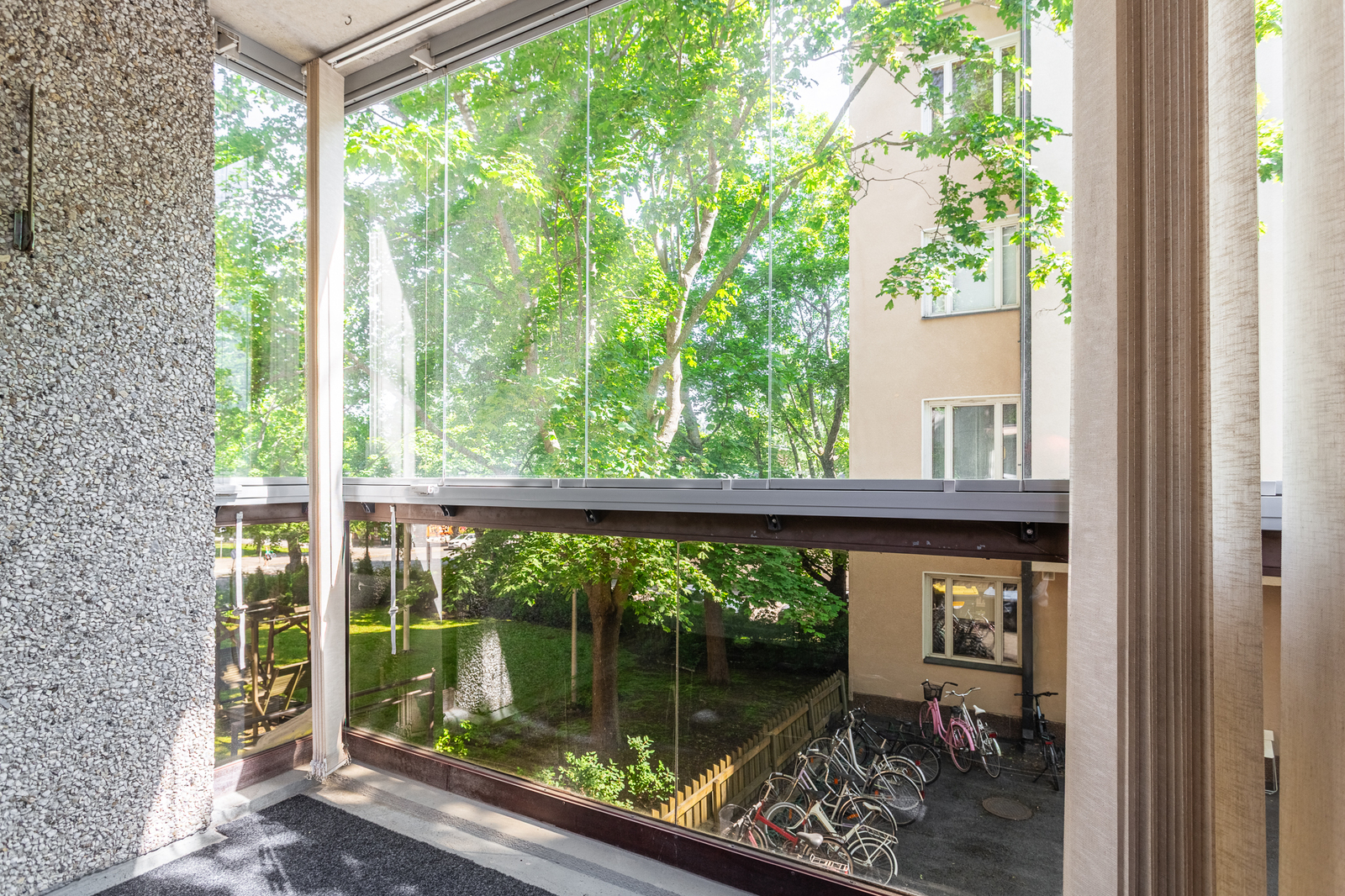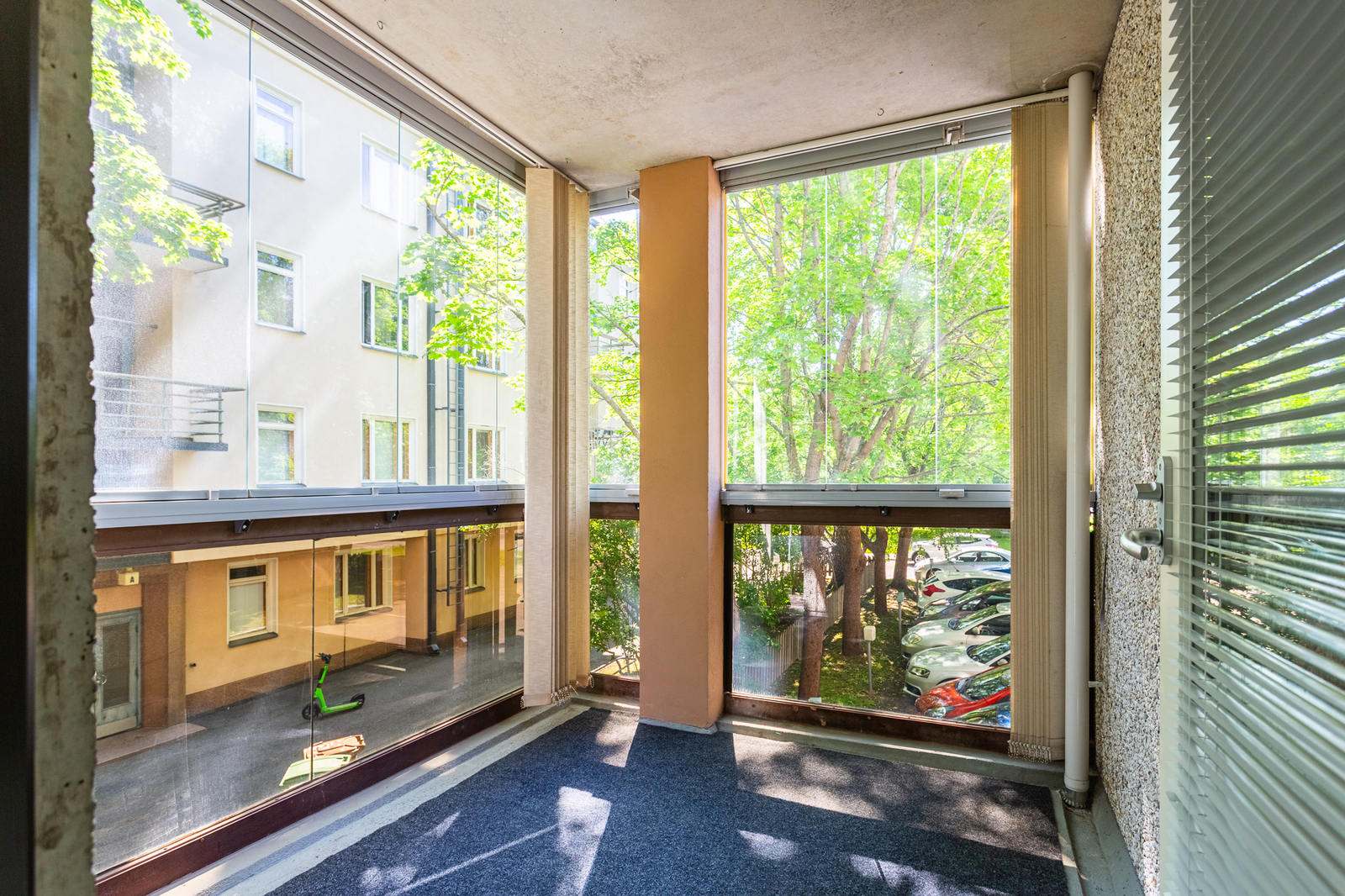 Lasitettu parveke on vehreän piha-alueen puolella, parvekkeelle asennettu lamelliverhot.