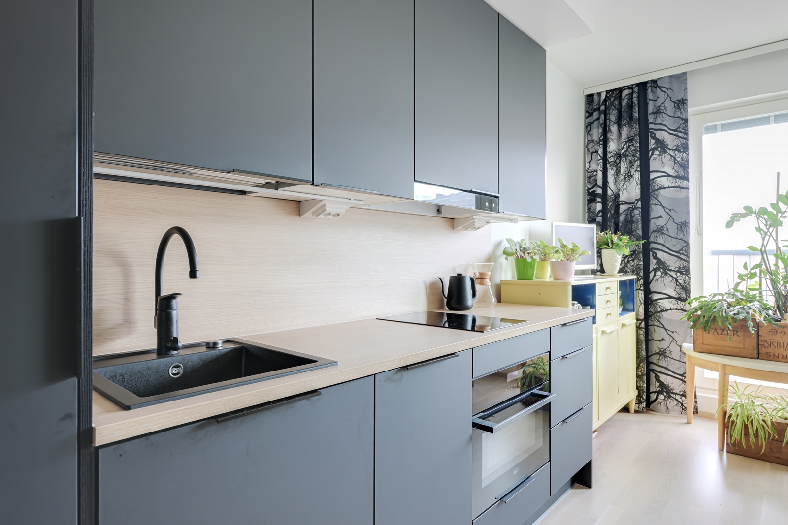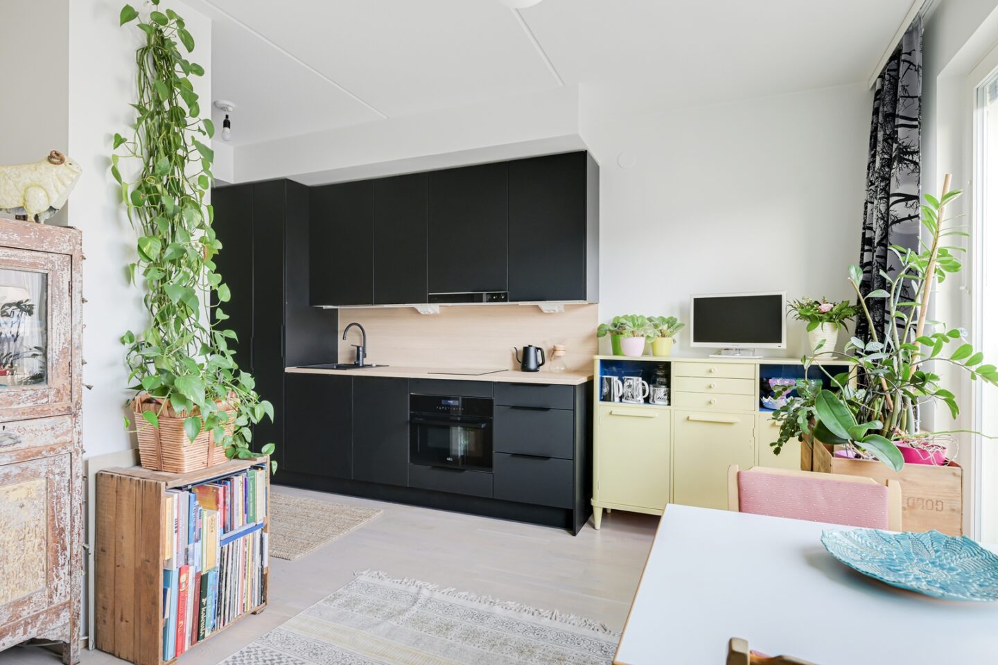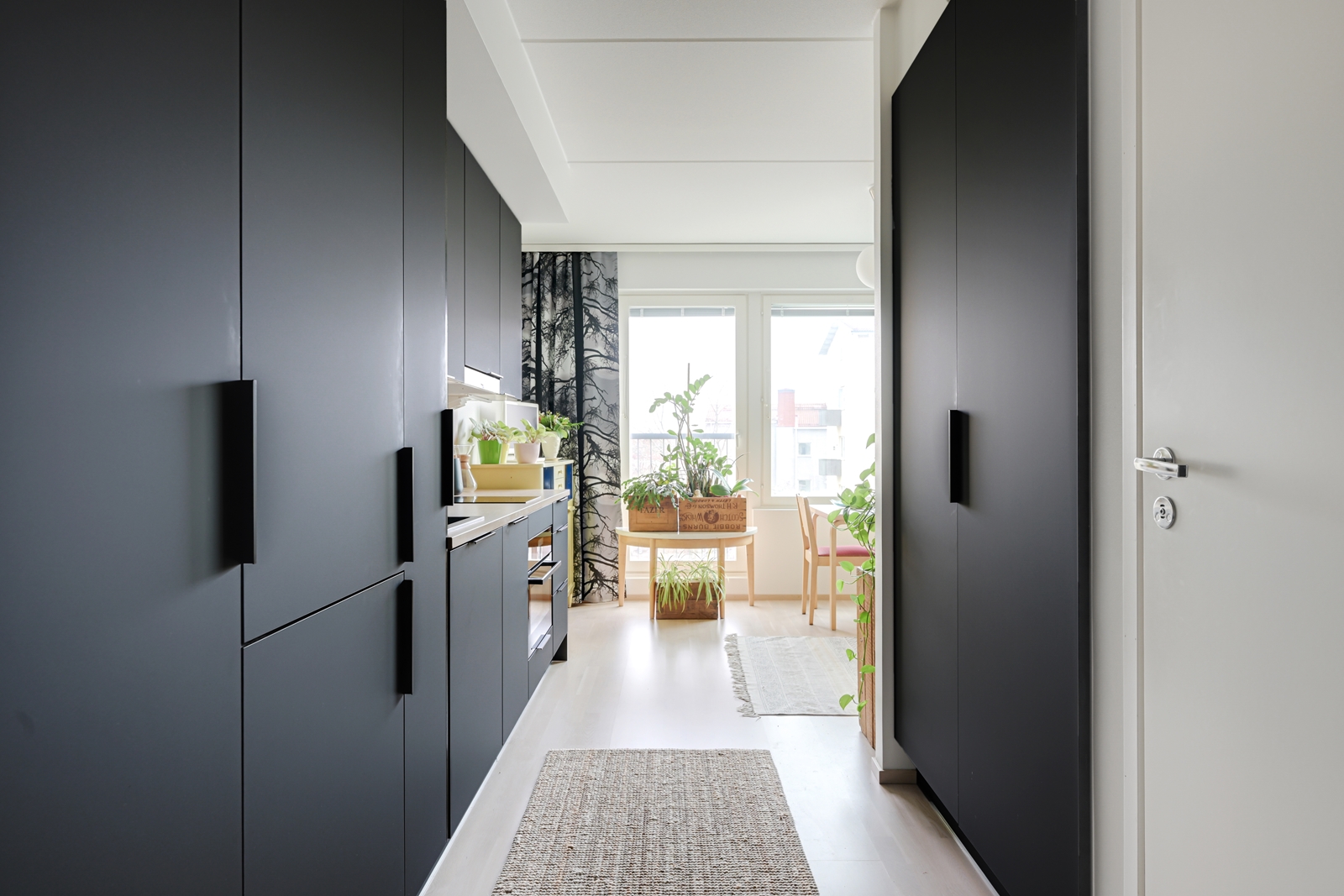 Tyylikäs ja hyväpohjainen yksiö on muuttovalmis. Asunnossa on musta keittiö, integroidut kodinkoneet ja hyvin säilytystilaa. Kylpyhuone on tilava ja sieltä löytyvät liitännät pyykinpesukoneelle ja kuivausrummulle. Yksiön ranskalainen parveke avautuu viihtyisälle