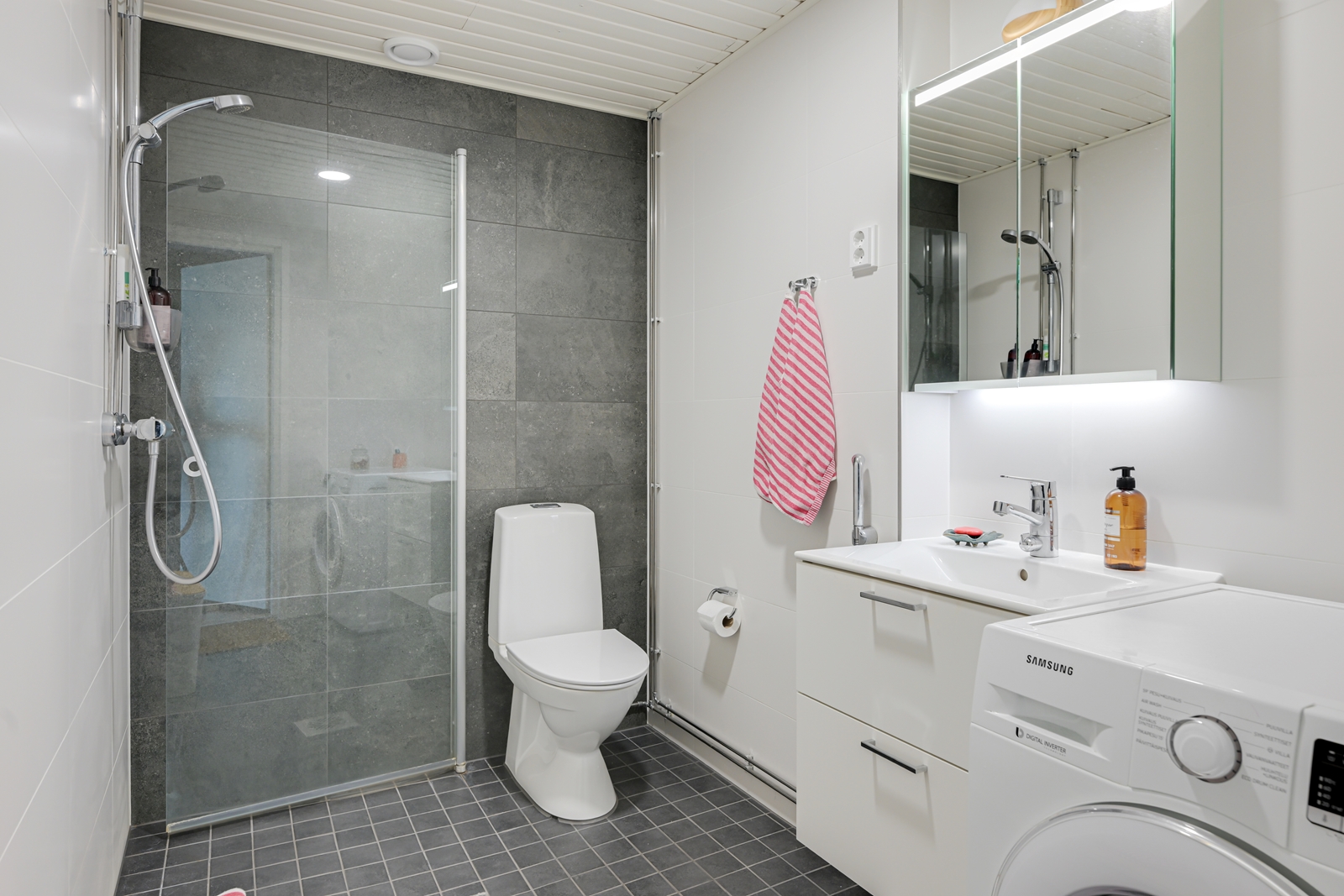 | Kylpyhuoneen kuvaus | Suihku, wc-istuin, pesukoneliitäntä, peili, pesuallas ja bidee-suihku, seinät (kaakeli), lattiat (laatta) |