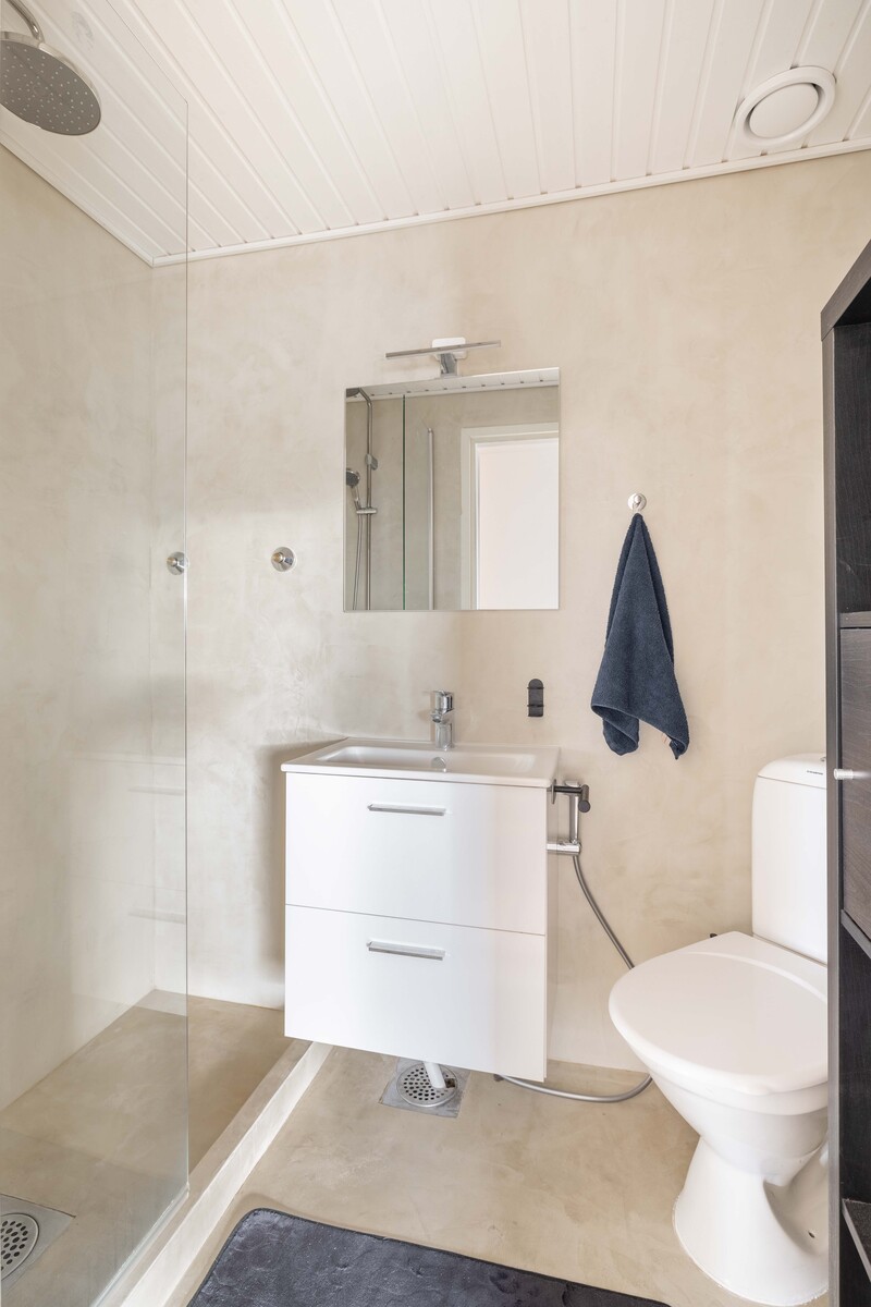 Kylpyhuoneen seinä- ja lattiapinnat on mikrosementoitu. Kalusteet on vaihdettu ja näin on saatu moderni ilme. Kylpyhuoneeseen mahtuu hyvin myös pesukone.