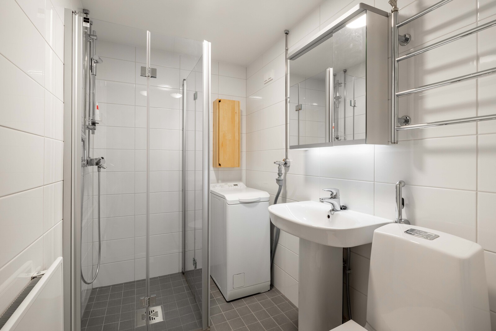 | Kylpyhuoneen kuvaus | WC-istuin, lattialämmitys, peilikaappi, pesukoneliitäntä, suihkuseinä ja asennettuja erikoisvarusteita, kiinteät valaisimet, seinät (kaakeli), lattiat (laatta), kylpyhuone remontoitu v. 2018 |